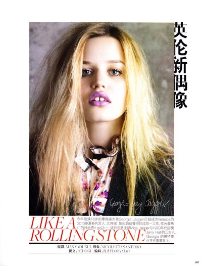 今年刚满18岁摩羯座的女孩Georgia Jagger 已经成为Versace 的2010年春夏新代言人。20年前,她妈妈就曾担任过同一工作。作为最热的时尚IT girl 之一,滚石乐队主唱Mick Jagger 与1970年代超模Jerry Hall 的三女儿:Georgia Jagger的模特事业正在蒸蒸日上。