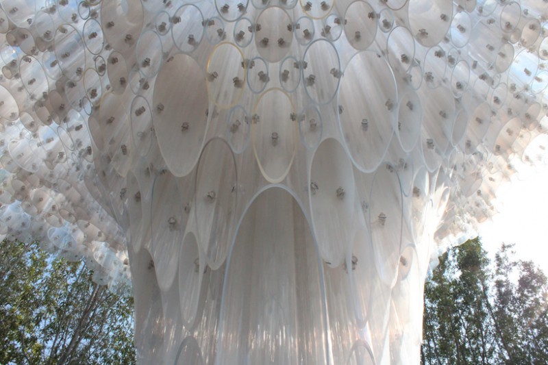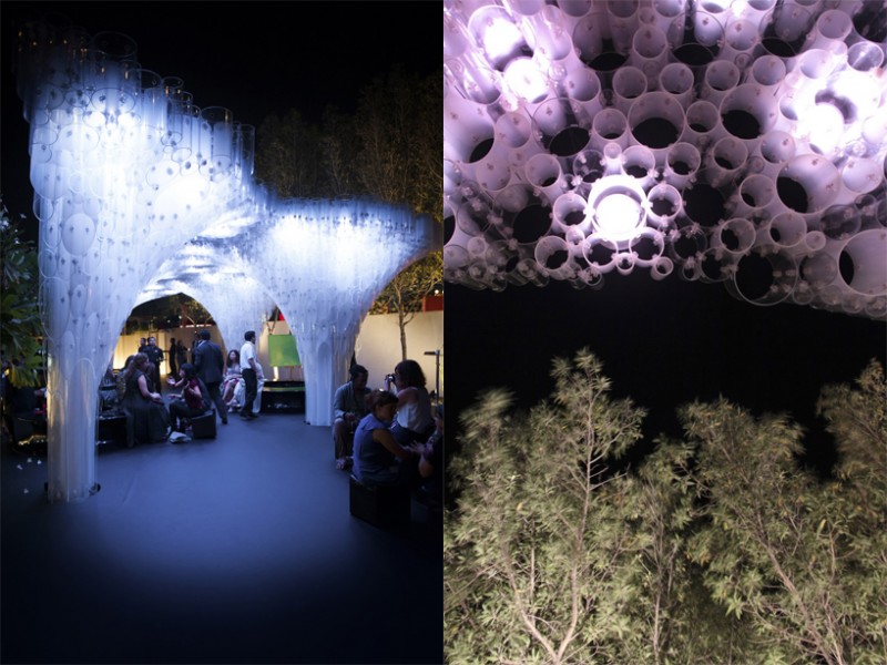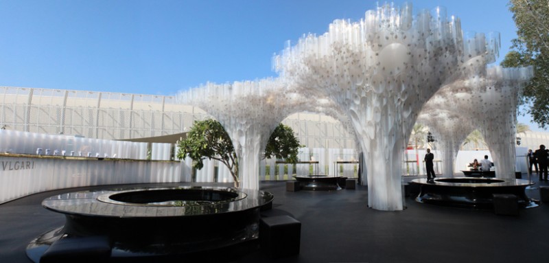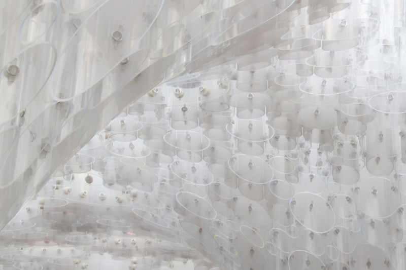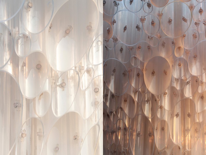 这个临时场馆希望能营造出宝格丽(bulgari)品牌的意大利传统怀旧风格,又能代表珠宝本身的制造和结构。空间由自身承重的结构系统组成;它不仅是一种装饰形式,还具有实在的结构功能。不同长度和粗细的亚克力管被组合在一起,这种材料很少用作建筑构件。2272根亚克力管和大约10,000个连接件共同构件了这座临时场馆。这些相互连接的管子不仅是要组合成特定形状,还要通过组合方式提供必要的结构刚性。整个空间像一颗粗糙的宝石,设计概念就是切削,然后打磨抛光,与内部的环境空间相对比。