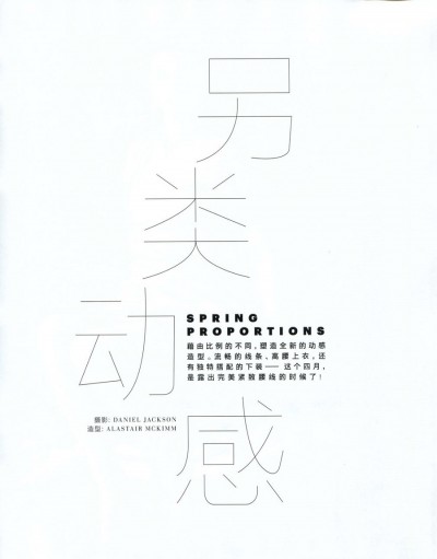 Spring Proportions 另类动感2013-04-192013-04-18 by YESONVOGUE 中国版四月份主题“Spring Proportions 另类动感”,藉由比例的不同,塑造全新的动感造型。流畅的线条、高腰上衣,还有独特搭配的下装——这个四月是露出完美紧致腰线的时候了。Related Articles KINFOLK 杂志的设计感 In Magazine 杂志 《032c》一本以 Pantone 色号命名的时尚杂志 In Magazine 杂志 #VogueHope 看全球26位总编辑发挥创意 诠释“希望”的意象 In Magazine 杂志