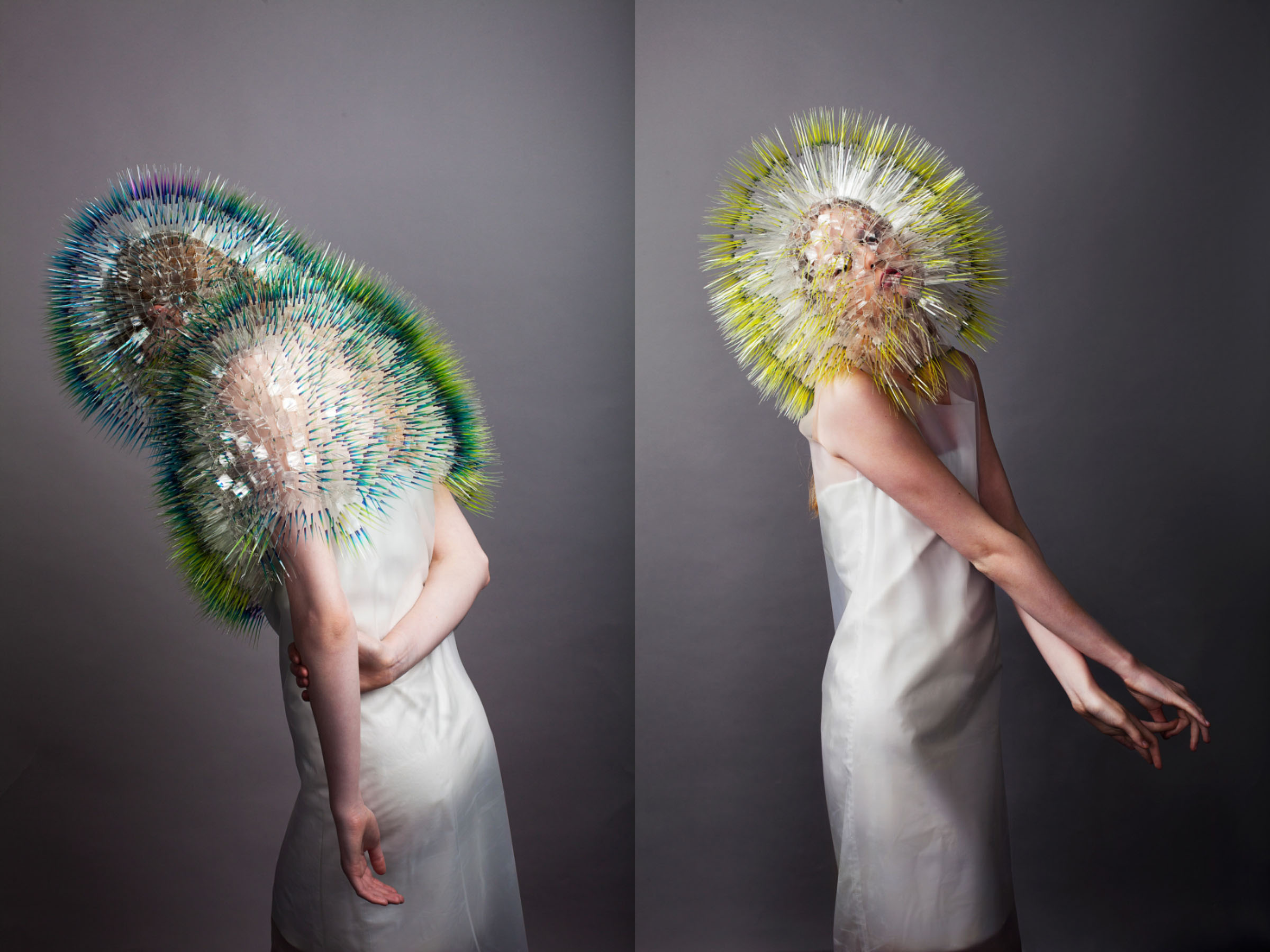 曾替冰岛歌手 Bjork 设计演唱会服装而声名大噪的Maiko Takeda,是来自日本的前卫艺术家、设计师。《Atmospheric Reentry》系列整体以特殊质感与放射状造型为特色,搭配上鲜艳明亮的色彩,让不少人第一眼看到Maiko Takeda的作品就深深着迷而难以忘怀。而除了头饰,Maiko Takeda也尝试一些服装与包包的创作。Maiko Takeda 利用拥有纤细、轻柔特色的晶圆聚合物纤维,以及塑料薄膜和压克力等材质,创作出这一系列像细针一样尖锐、又像羽毛般柔软轻巧,并能随穿戴者曲线和动作变化的头饰。