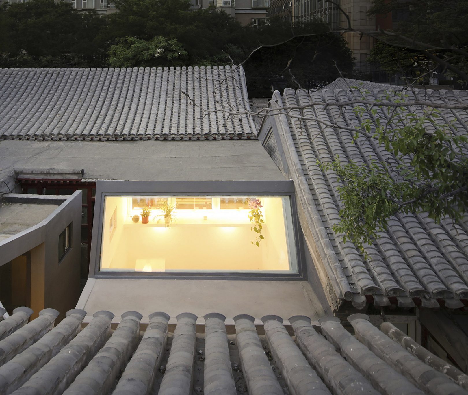 北边餐厅由于和南房距离非常近(只有一米的过道),南向的任何常规开窗都会被南房遮挡,而不具备任何采光意义。因而南墙完全封闭,布置服务功能,而在立面上方采用天光,将阳光直接引入屋内。南墙2100米之下除了一个750见方的通风窗口外,完全设计为橱柜与开放导台的服务区。在2100之上为3mx1.1m的通长天窗,不止采光,而且将枣树、屋脊与天空纳入至景框的构图之中。北墙上为通长开窗,西墙为入口以及一个高窗,高窗将64号院的槐树也作为景色纳入到房间中来。餐厅不仅为一家人聚餐的场所,更成为了家庭活动的精神堡垒。