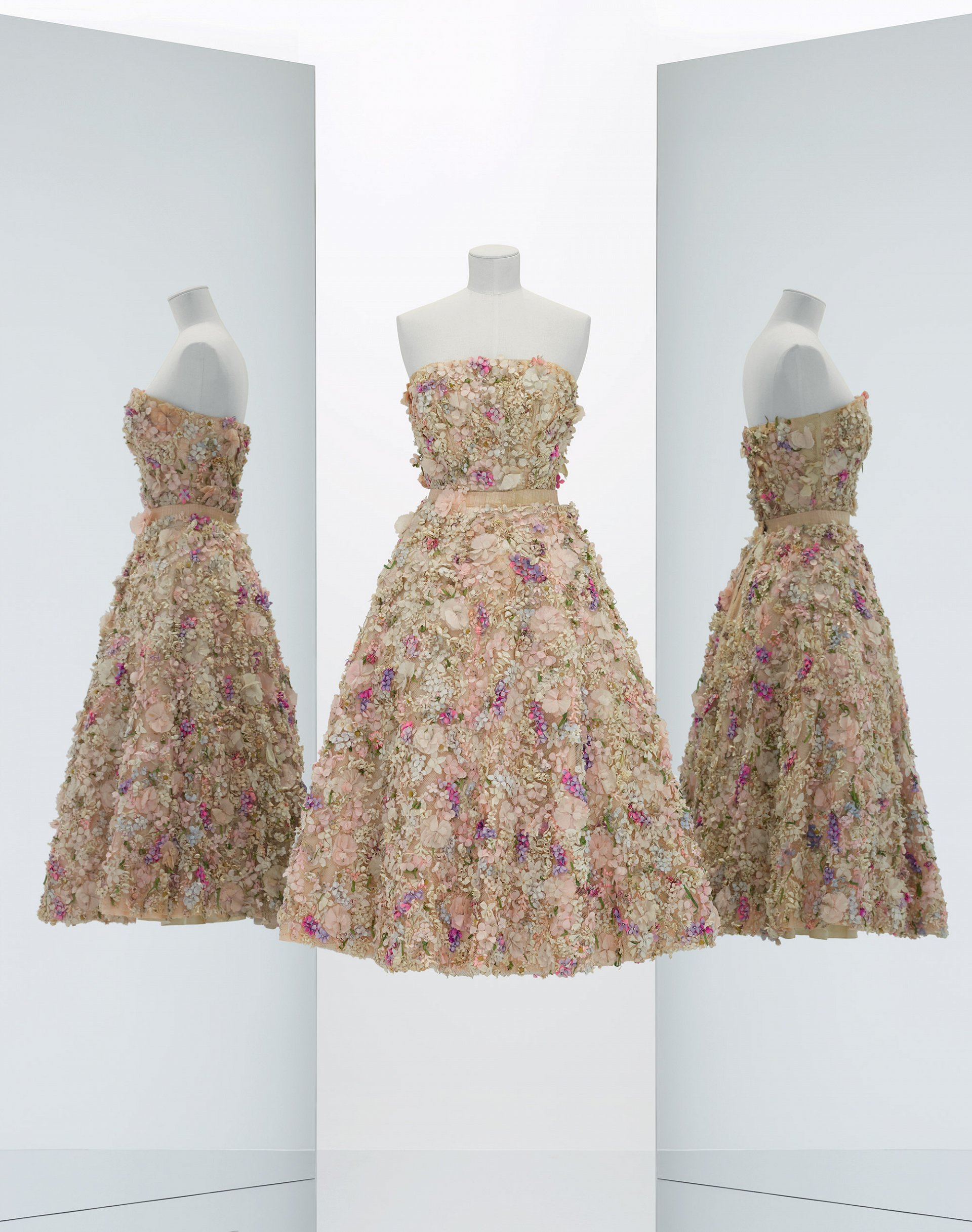 展览中展示了品牌70年来的经典作品,邀请参观者探索品牌创始人及其知名继任者的创意天地,其中包括:伊夫·圣罗兰(Yves Saint Laurent)、马克·博昂(Marc Bohan)、奇安弗兰科·费雷(Gianfranco Ferré)、约翰·加利亚诺(John Galliano)、拉夫·西蒙(Raf Simons)以及最近上任的玛莉亚·嘉西亚·基乌里(Maria Grazia Chiuri)。展览精心挑选品牌从1947年至今所设计的300多款高级定制连衣裙,忠实再现情感、历史、渊源、灵感、创意与财富传承。除了这些时尚名家的肖像写照,本次展览还首次以详实透彻的方式展示了多幅工坊画作、时尚摄影作品、数百份文档(插图、草稿、报道摄影、信件、手稿和广告文案等)以及众多时尚配饰(帽子、首饰、手提包、鞋履和香水瓶等)。