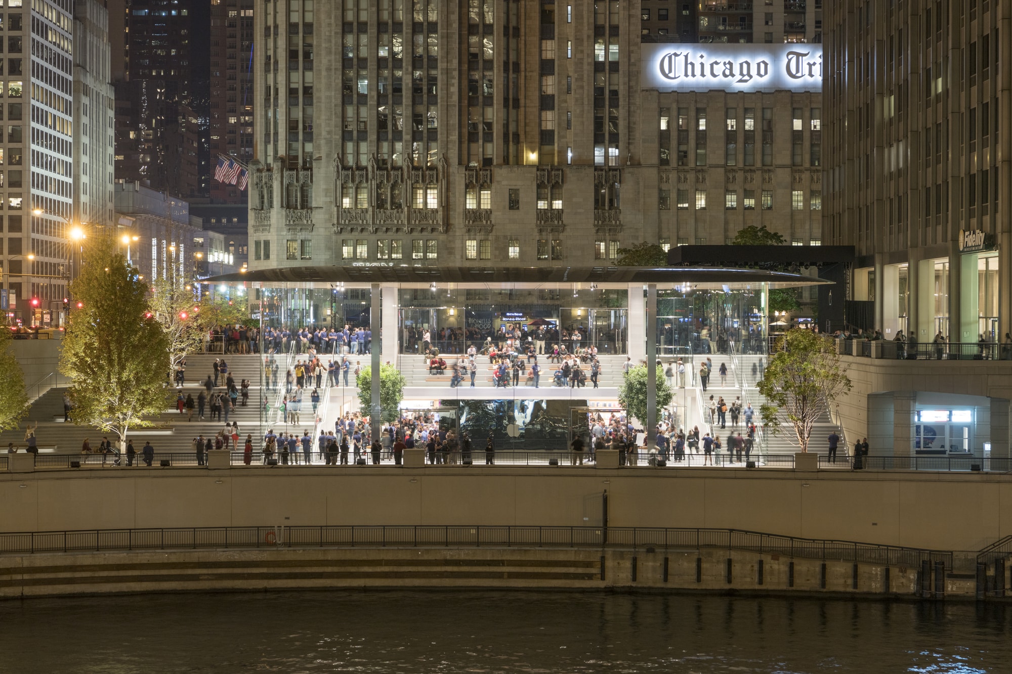 在芝加哥艺术魅力的影响下,苹果公司在这个音乐之城创建了一个新的展示平台。苹果密歇根大道专卖店位于芝加哥河和北密西根大街(华丽一英里)的交汇处,从先锋法院逐渐的下到芝加哥河的边上,这间新的苹果专卖店在城市和河流之间建立起了新的联系。
