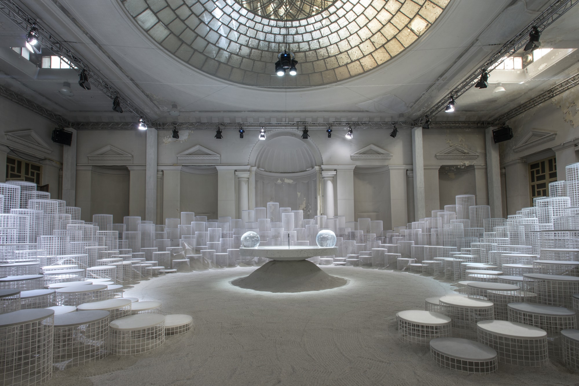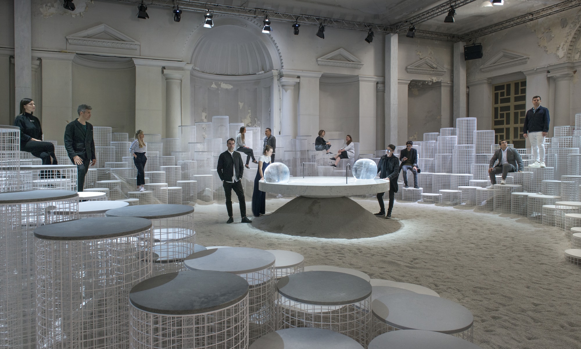 装置“Altered States” 是石英制造商凯撒斯通公司(Caesarstone)和纽约 Snarkitecture 建筑工作室合作的结果,该装置揭示出了厨房岛的核心内容。设计灵感来自自然界中冰川,河流和间歇泉中水状态的变化,以及来自厨房里的冰,水和蒸汽。该装置由一个中央圆形厨房岛组成,通过冰、水和蒸汽展示出了水的各种变化状态。与此同时,这个“圆形岛”的四周是由250多块凯撒石英石和金属网基座组成,形成一个与自然景观现象相类似的从白色到灰色的渐变过程。