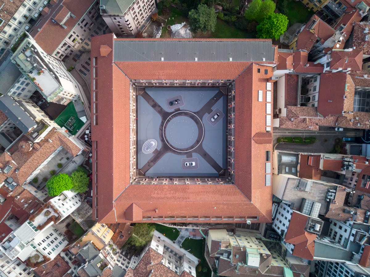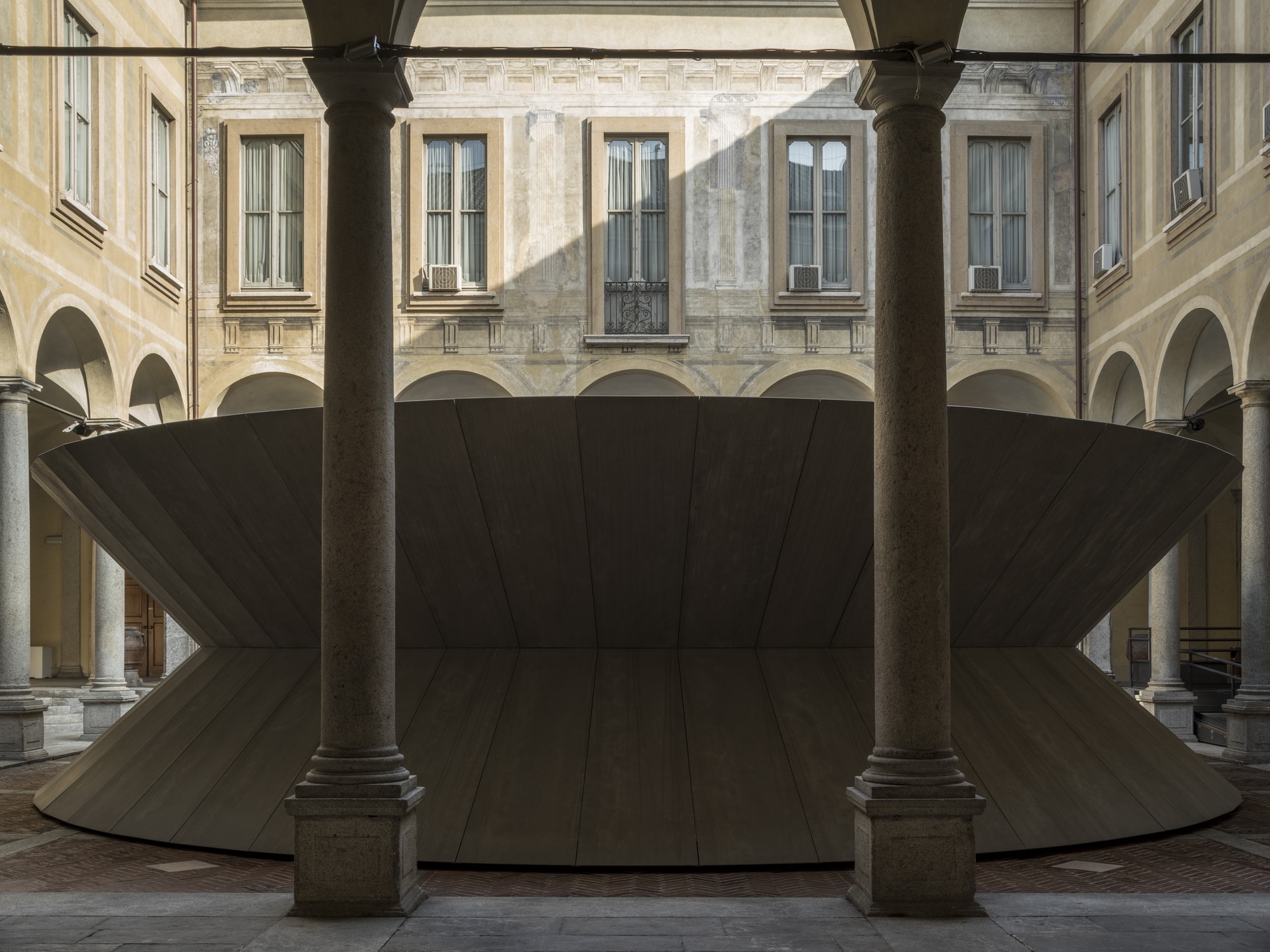 《Open Sky》是一个放置在地上的接触式的抽象反射装置,而将它放在16世纪宫殿庭院里,则表现出了在米兰美丽的天空下这座历史建筑展现出的新面貌。 当游客穿过柱廊时,能够感受到这座豪华宫殿扭曲的形状和新的形象,当你接近装置的中心时,能够看到天空中瞬息变化的云彩和色彩。