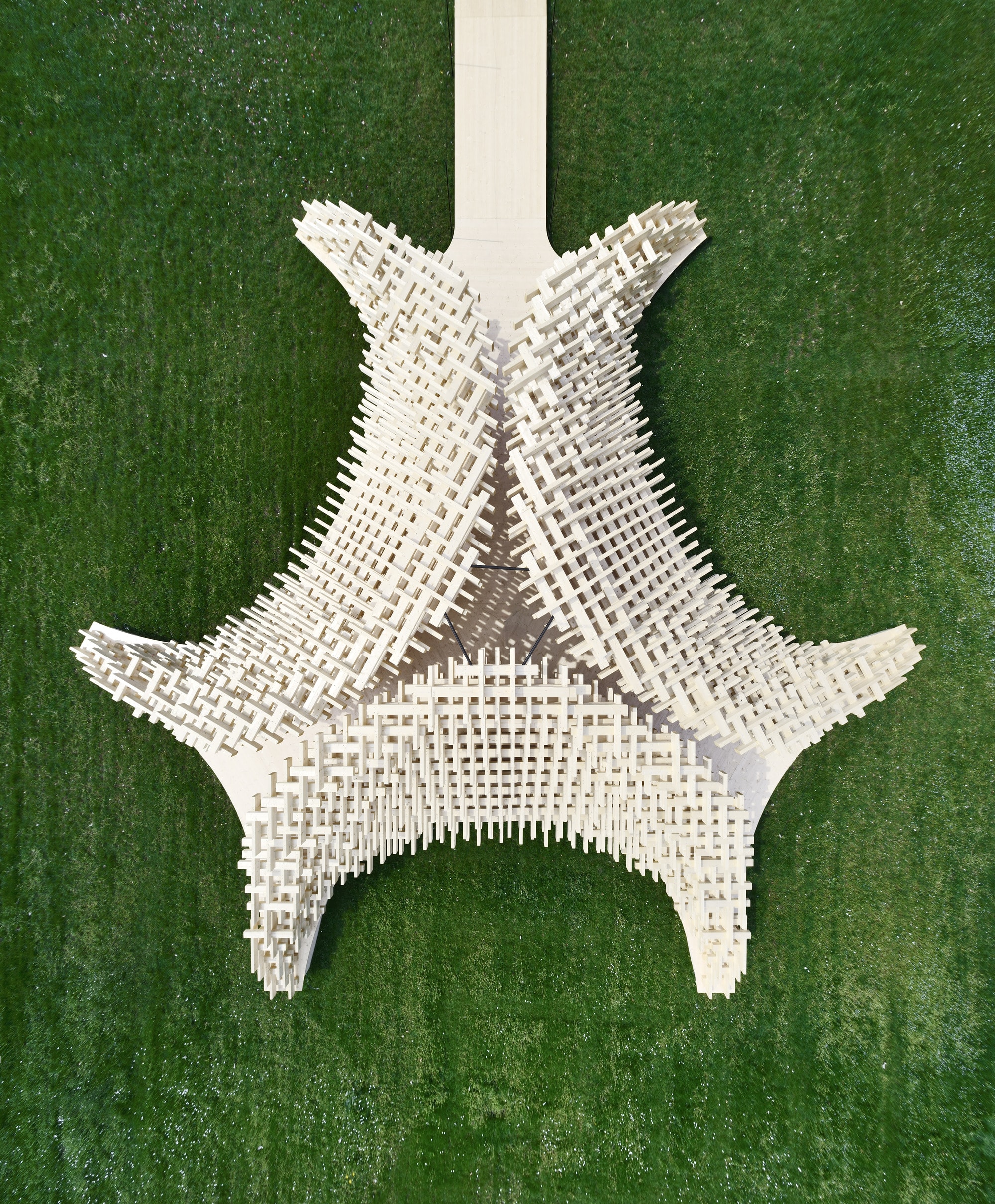 Future Space装置也安装在了Ca’ Granda 医院里,该装置呈对称结构,设计灵感来自文艺复兴时期医院的规模大小。 该项目探讨了如何发挥木材的潜力,并将其作为未来可持续发展的材料,同时体会在木质空间里的感受。该装置由1600多根木棒组成,形成了一个有三个独立侧翼的洞穴,并在高度上逐渐变化。另外通过光线透过带孔的结构,也更好的促进了“光线与阴影间的游戏趣味”。而洞穴的三个开口一个是入口,另两个是框架结构,从那里可以看到大学校园里面的其他装置。”