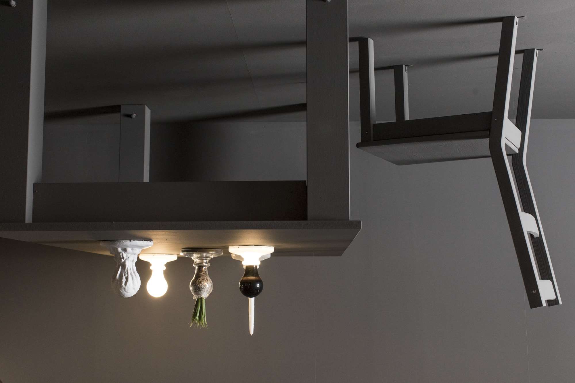 REVERSE ROOM 是由一个倒转的黑盒子组成,目的是挑战观众对一个具有破坏性的和异常空间条件的反应。该装置主要是作为“系列灯泡”的载体,这是詹姆斯·怀恩斯(James Wines)收藏的一件物品,旨在用灯泡作为主题来“模糊艺术与设计之间的界限”。该装置对五种灯泡进行了解释;包括“黑暗之光”,它将物体的功能部分颠倒了,“蜡烛光”是将钨和火焰合并成一个新的模糊不清的物体,“熔化的光”,是一个介于固体和液体之间的灯泡。“植物之光”,展示出了在大自然中蔓延的灯泡,最后是一个能够看到所有展品的“白光”。