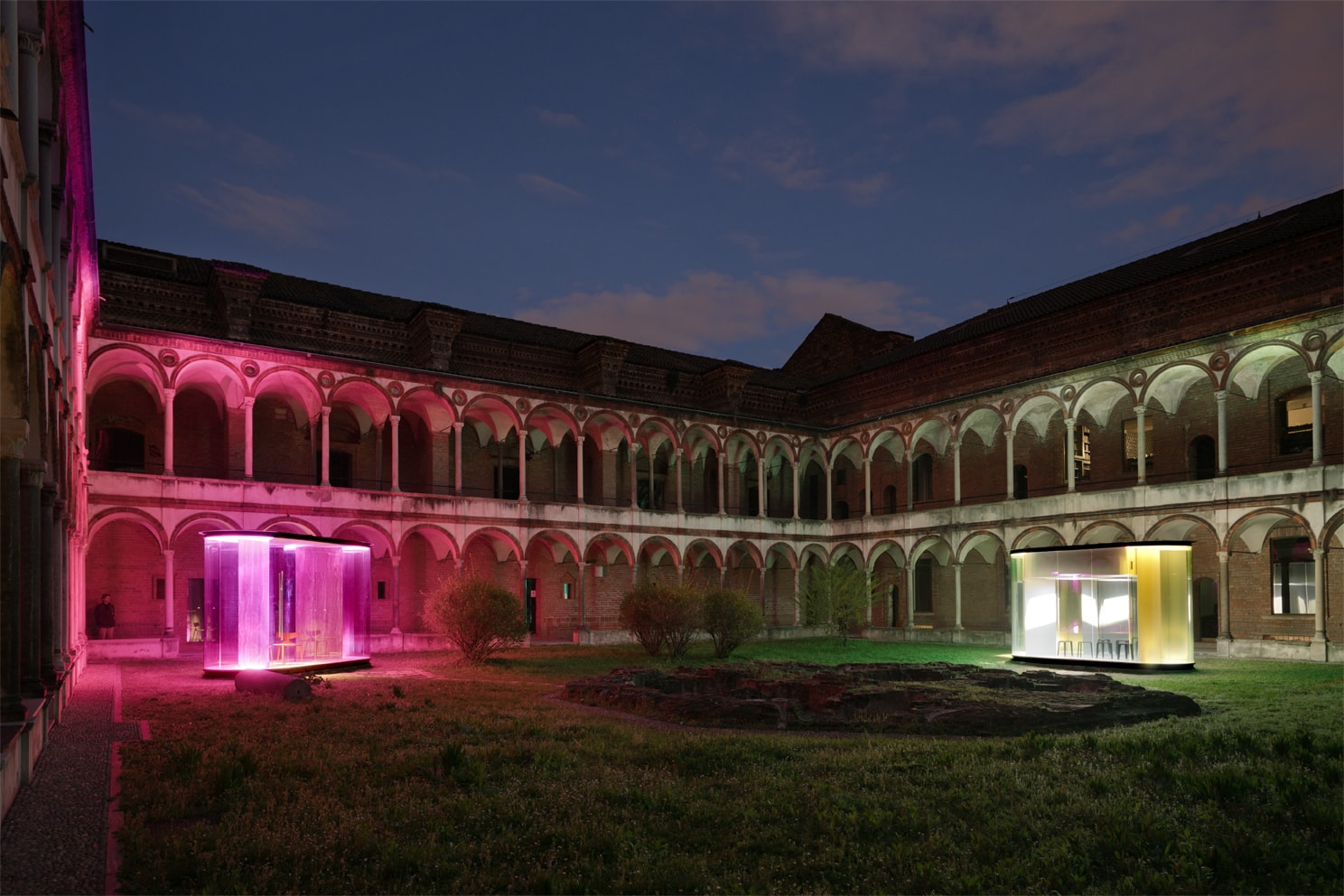 “Cells”装置主要是研究未来医院的技术、种类和建筑之间的关系。 该装置位于米兰大学(University of Milan) Ca ‘ Granda 医院院区内,该医院始建于1456年,该装置让参观者能够置于身临其境的感官体验中,从而探索医疗保健领域的发展。 “Cells”装置由两个大小相等的玻璃结构组成,但他们具有不同的特征,他们被放置在庭院的相对角落,象征着对未来医疗保健的两种看法和观点。