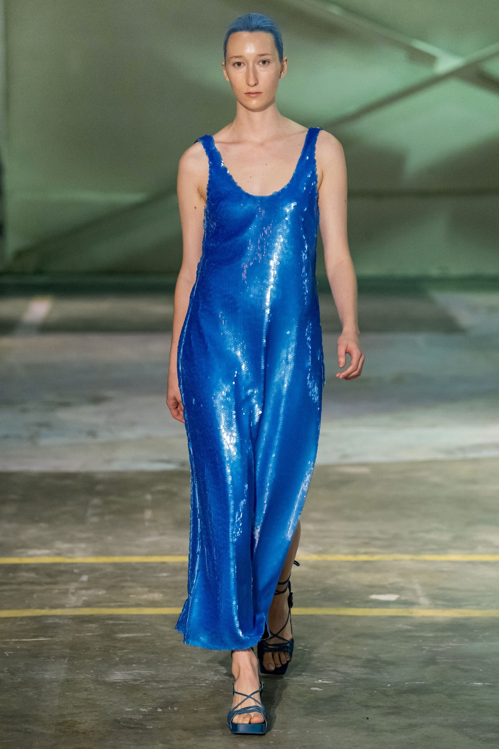 不过在时装界,经典蓝色并非是日常单品的色彩取向。过去一年中,Hedi Slimane 的 Celine 、Riccardo Tisci 的 Burberry 还有 Ashley 和 Mary Kate Olsen 所设计的 The Row 都不约而同地以经典蓝色的设计,展示对中产阶级文化的演绎。 Demna Gvasalia 在 Balenciaga 2020 春夏系列便铺天盖地地运用经典蓝色,以加强团结力量的政治信息。想不到在系列发布的尾声,模特儿穿上经典蓝的丝绒晚装映入眼帘,斗大的圆形裙摆设计便瞬间与场地融为一体;而Haider Ackermann 则把经典蓝设计在西装套装上;Eckhaus Latta 的蓝色则以珠片的设计打造;Gucci 的连身开胸裙子,展示出干净俐落的轮廓。