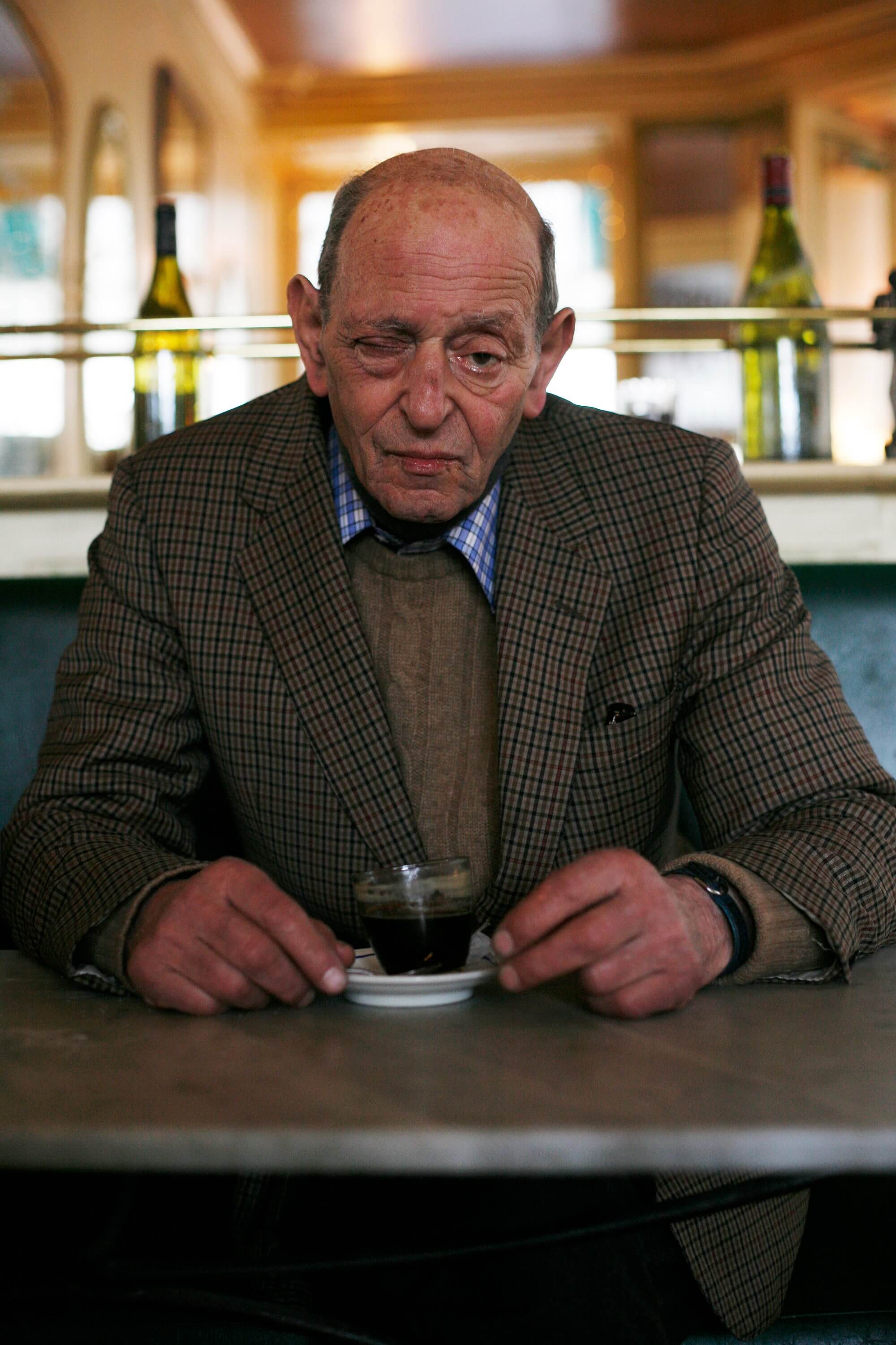「我在巴黎要走去下一场秀的途中看到这位老人。那时我已经有点迟到了,但看到他后就觉得不能错过拍摄机会。我询问是否可以为他拍照,他说好,但能先陪他坐一会喝杯咖啡吗?于是我需要决定赶往时装秀,或留下来拍这位出色、优雅又有型的绅士,且还要考虑到那季Condé Nast 雇用了我为Style.com 拍摄。当然我选择了这位绅士。此照片教会了我相信直觉,因为那季稍后Jonathan Newhouse [Condé Nast Worldwide 主席] 主动来认识我,并表达他对此照的喜爱。