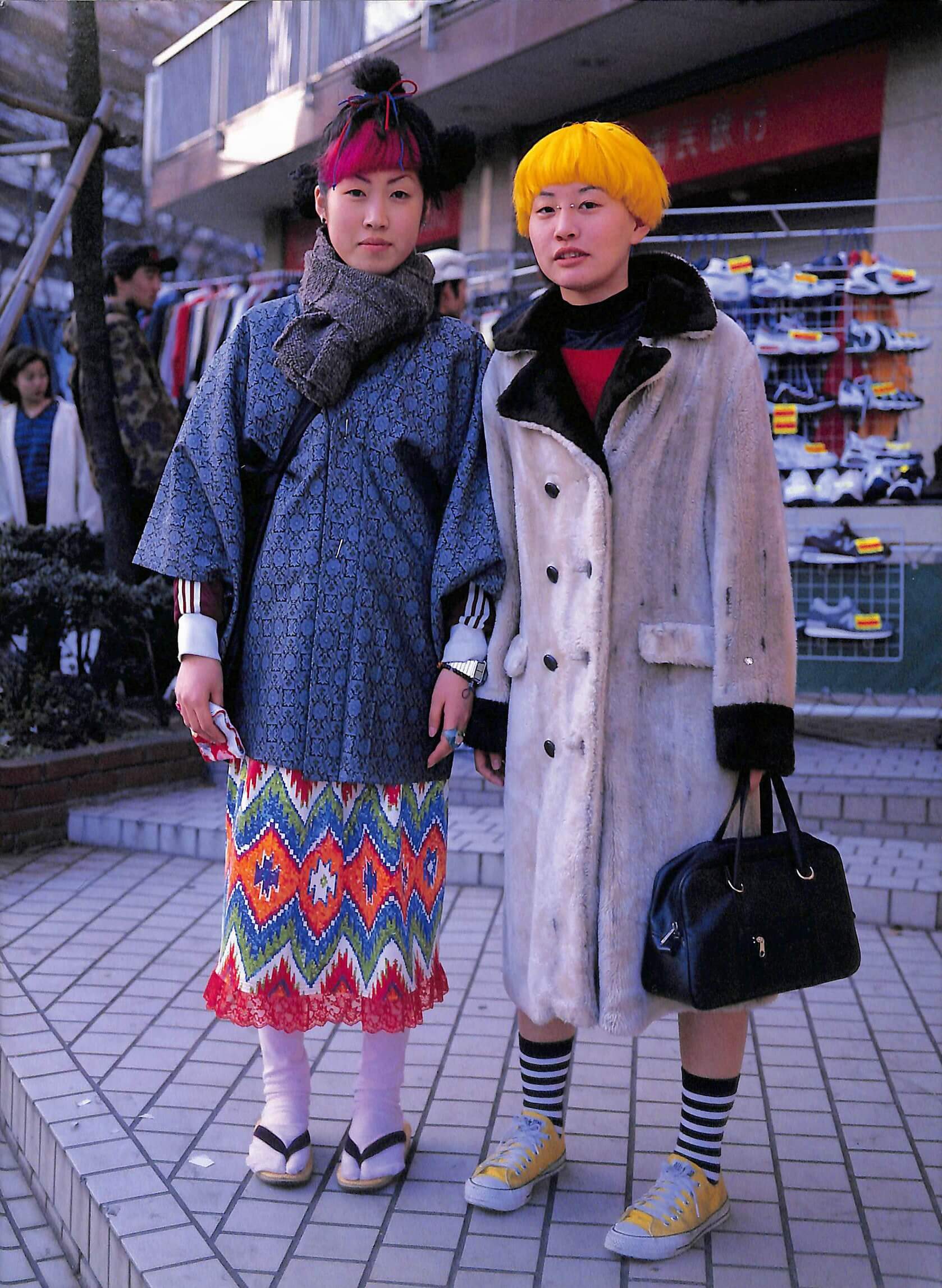 「这张照片促成了《FRUiTS》杂志的创办。在那之前,Comme des Garçons 与Yohji Yamamoto已主宰市场10 年了。因此这两位身上的多彩造型蛮新鲜与创新的。而且当时和服的穿搭还颇具挑战性。」