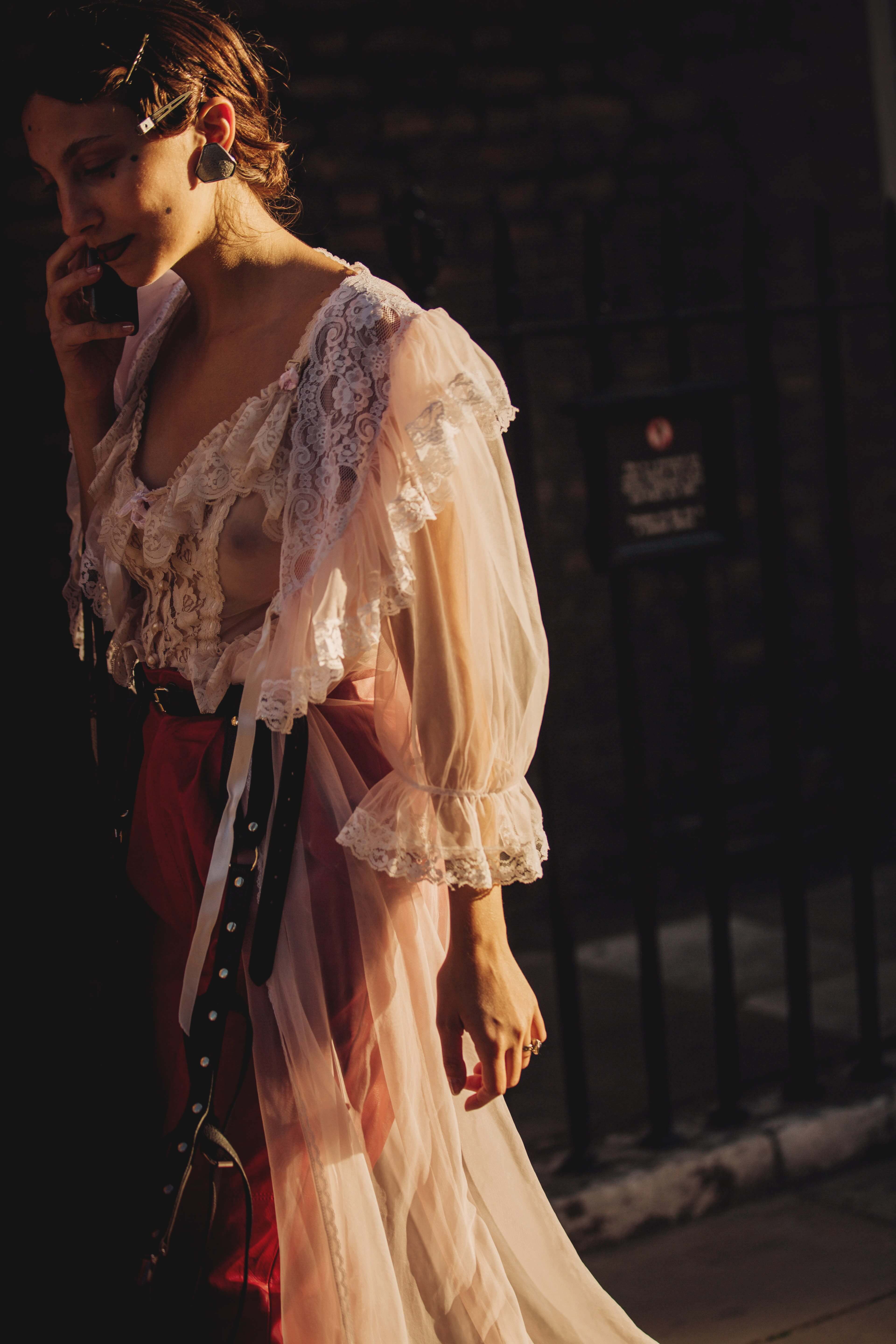 「当我第一眼看到潜在拍摄对象时,通常都会先注意到细节。这幅肖像是在 Molly Goddard 秀场外拍摄,并捕捉到该设计师带给伦敦日程表与其来宾的魔力。」
