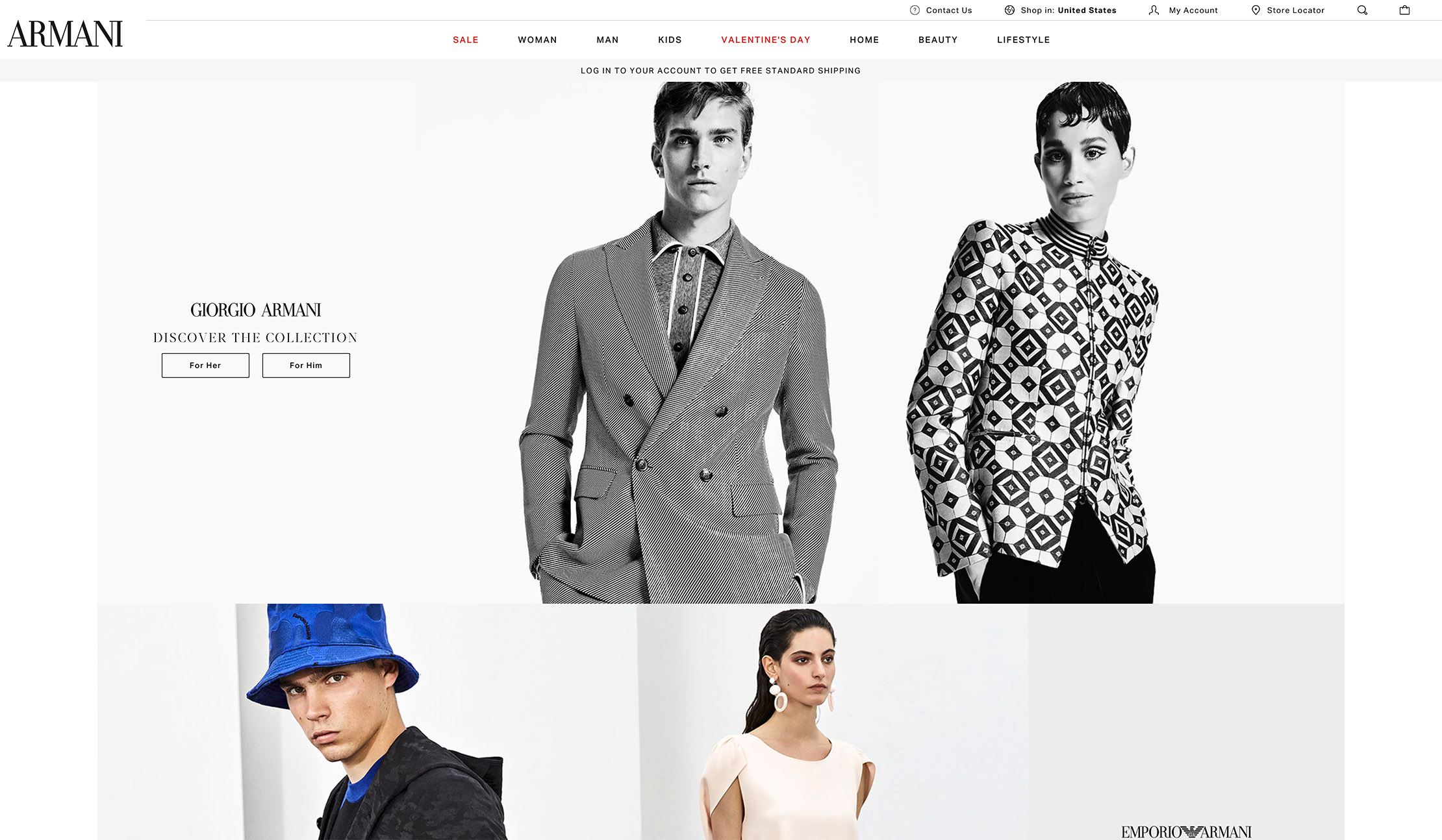 ARMANI 的Logo使用了Didot字体,其特色是字体中的细线笔画若隐若现,Didot字体早已成为了奢华、时尚和潮流的经典范例。此外,阿玛尼还使用了Montserrat字体,这是一种开放、和谐的几何型无衬线字体,能够带来强烈的视觉冲击。深色的色彩弥漫在整个页面布局和意向之中,庄重而充满阳刚之气。阿玛尼堪称经典品牌,极具标志性和现代气息——其字体的设计和搭配也与其品牌气质相呼应。