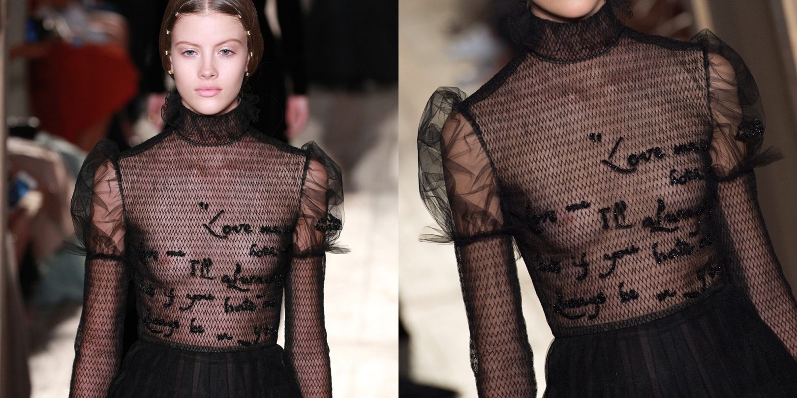 莎士比亚逝世400周年,当年2016秋冬 Valentino 的优雅高订晚装以580小时的人手工序完成,胸前由钉珠组成的莎士比亚引句“If you love me I’m in your heart, if you hate me I ‘m in your mind”,诉说出 Pierpaolo Piccioli 对文学和时装的热爱之情。