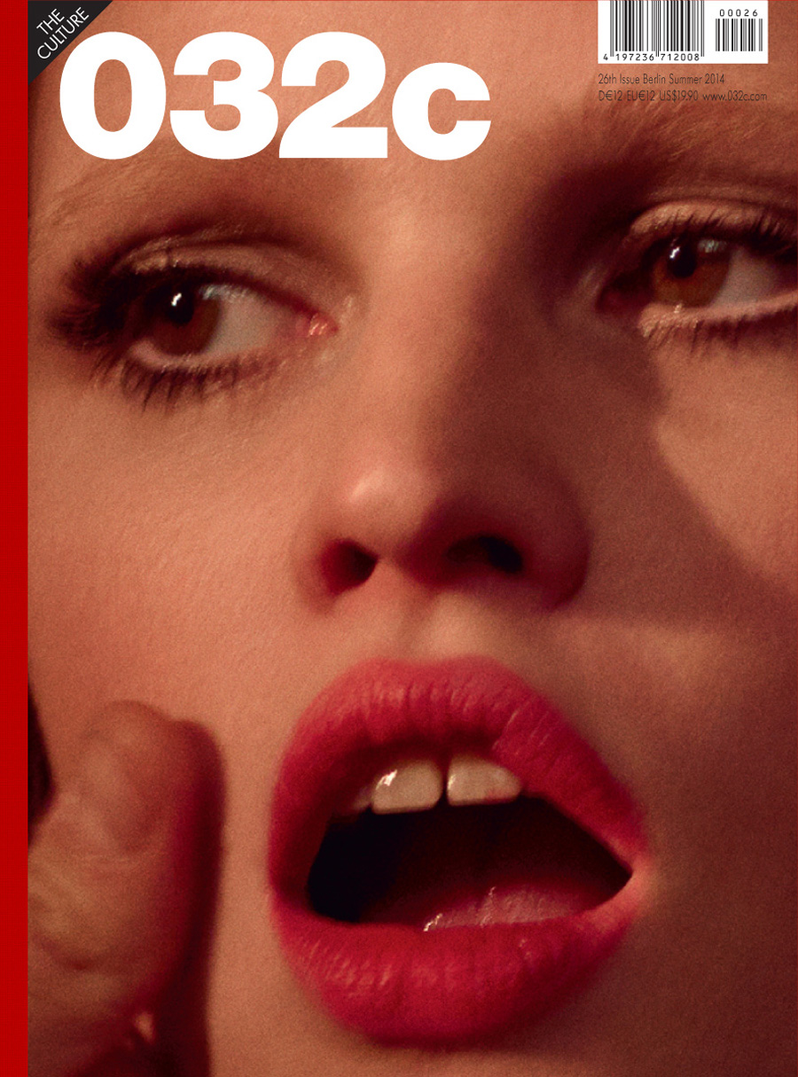 90年代的柏林充斥着“一切都有可能”的浓厚氛围,文化艺术喷薄而出并且互相交织:平面设计师同时在经营Club,建筑师开起了艺术画廊……整个柏林新旧交替、蓄势待发的都市精神深深影响着《032c》的取向。最初,主编Jörg Koch及运营总监Sandra von Mayer-Myrtenhain两位创办人希望杂志能像网站一般具有颠覆性,做一本fanzine。2000年冬天发行的第一期《032c》,薄薄的新闻纸印刷,充满了DIY精神。黑白图片为主,标志性的正红色贯穿了整份报纸,视觉及设计在这本新刊里的地位要高过内容,其轻薄的特性和易读的内容也很适合人们随身携带,而不像后期杂志那样越来越厚“我们以反作者身份,反新闻的手法来确立我们的态度,模糊了作者的名字。我们希望第一期杂志看起来像是Dieter Rams设计了一份朋克杂志。”Jörg Koch最初定义这份杂志的态度,使得《032c》在德国杂志业界乃至全世界脱颖而出,受人尊重。
