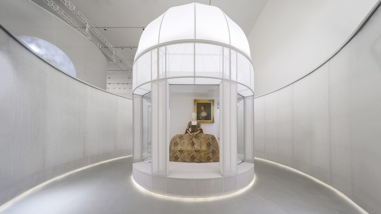 古典部分的最后一个花园是由亚克力管排列围合而成的,现代的材料暗示着展览叙事已近现当代,人们开始对于时尚与自然关系进行深刻反思。由此进入展览的当代和未来展望部分,空间豁然开朗,古典空间圆形展柜的背面形成了连续、自由流动的大型连通展柜,也呼应了当代景观和空间设计更自由灵动的布局。