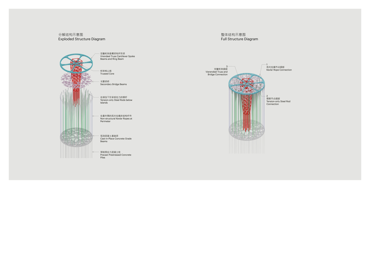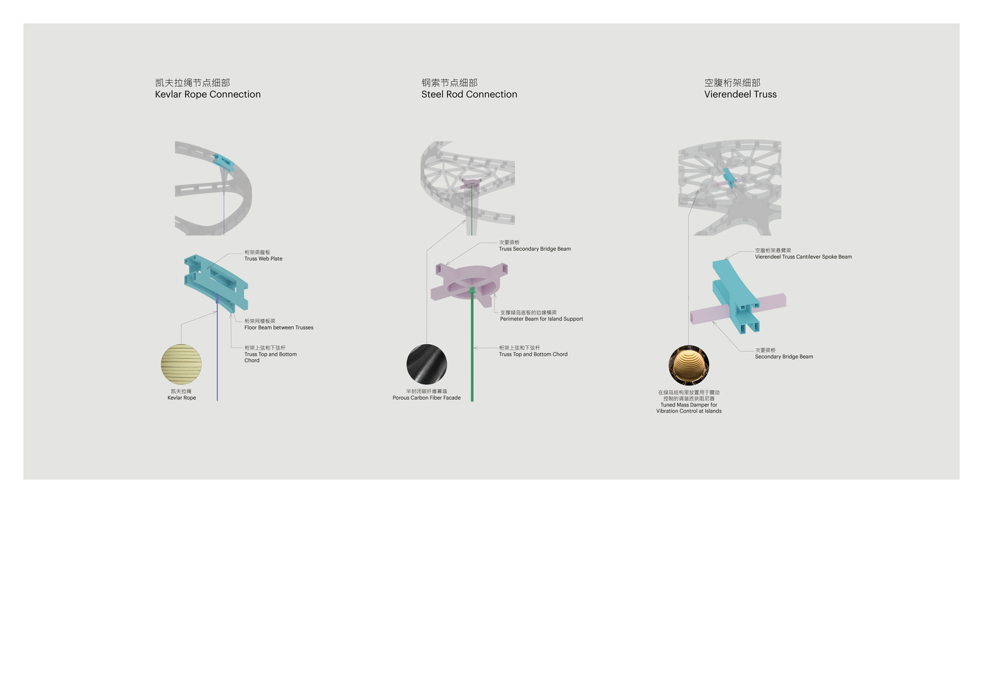 塔楼内配备了餐馆、咖啡厅、以及一个定制的观景平台,可在必要时转变为三维展览空间。塔楼的主体材料为钢、碳纤维、芳纶绳与混凝土。中央的核心主塔通过外围芳纶绳构成的钢桁架系统,保障了塔楼整体结构的平衡稳定性。
