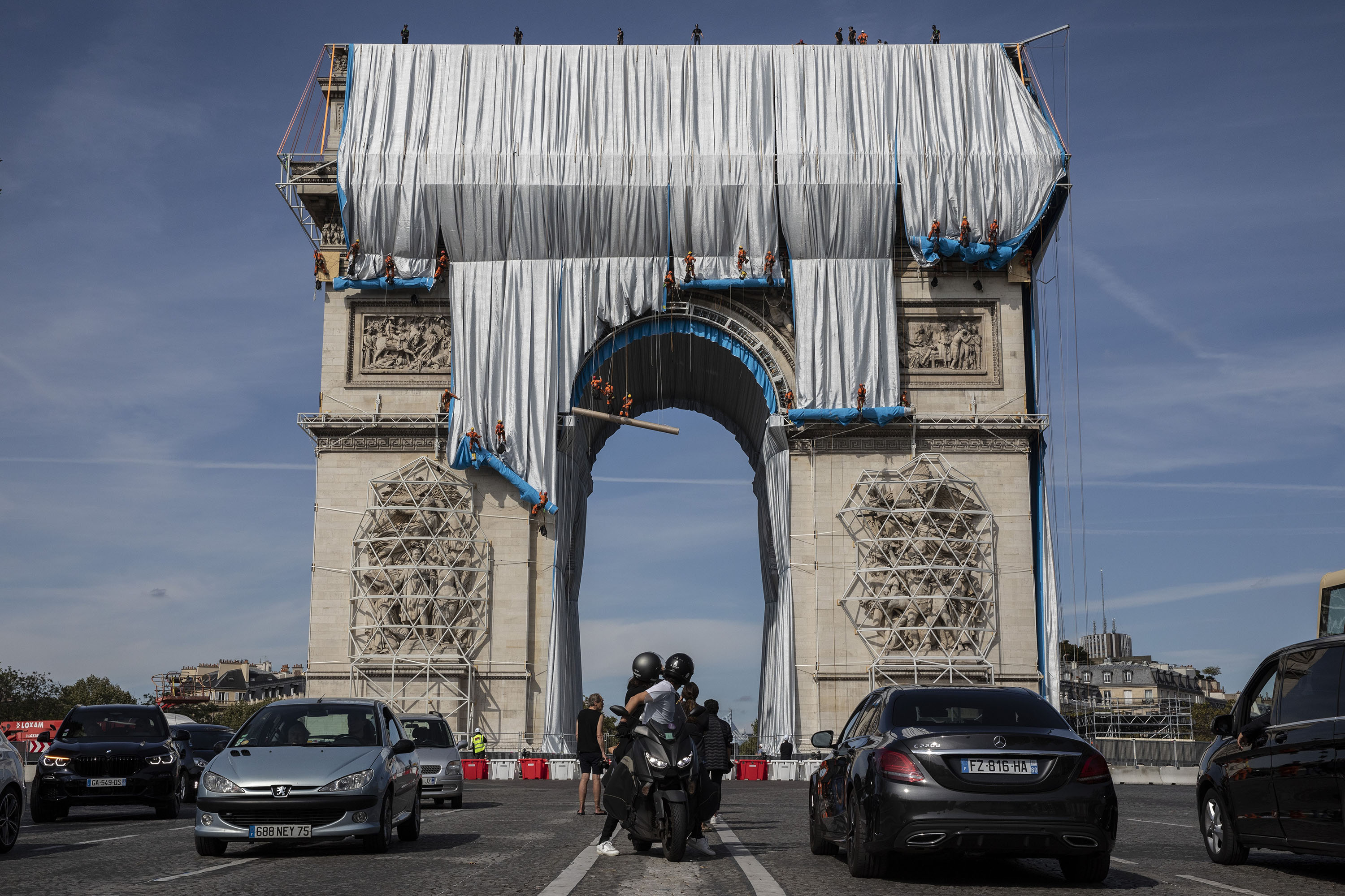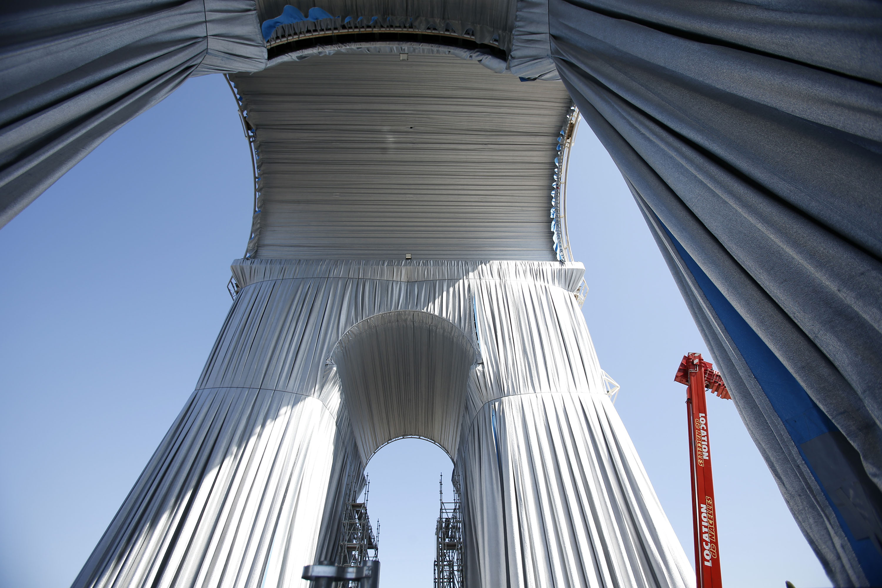 这座战争纪念拱门经过数周的工程,以总面积2万5000平方公尺的银蓝色可回收塑胶布料包裹,兑现了Christo生前的梦想——像个活生生的物体,会受到风的刺激,并会反射光线。
