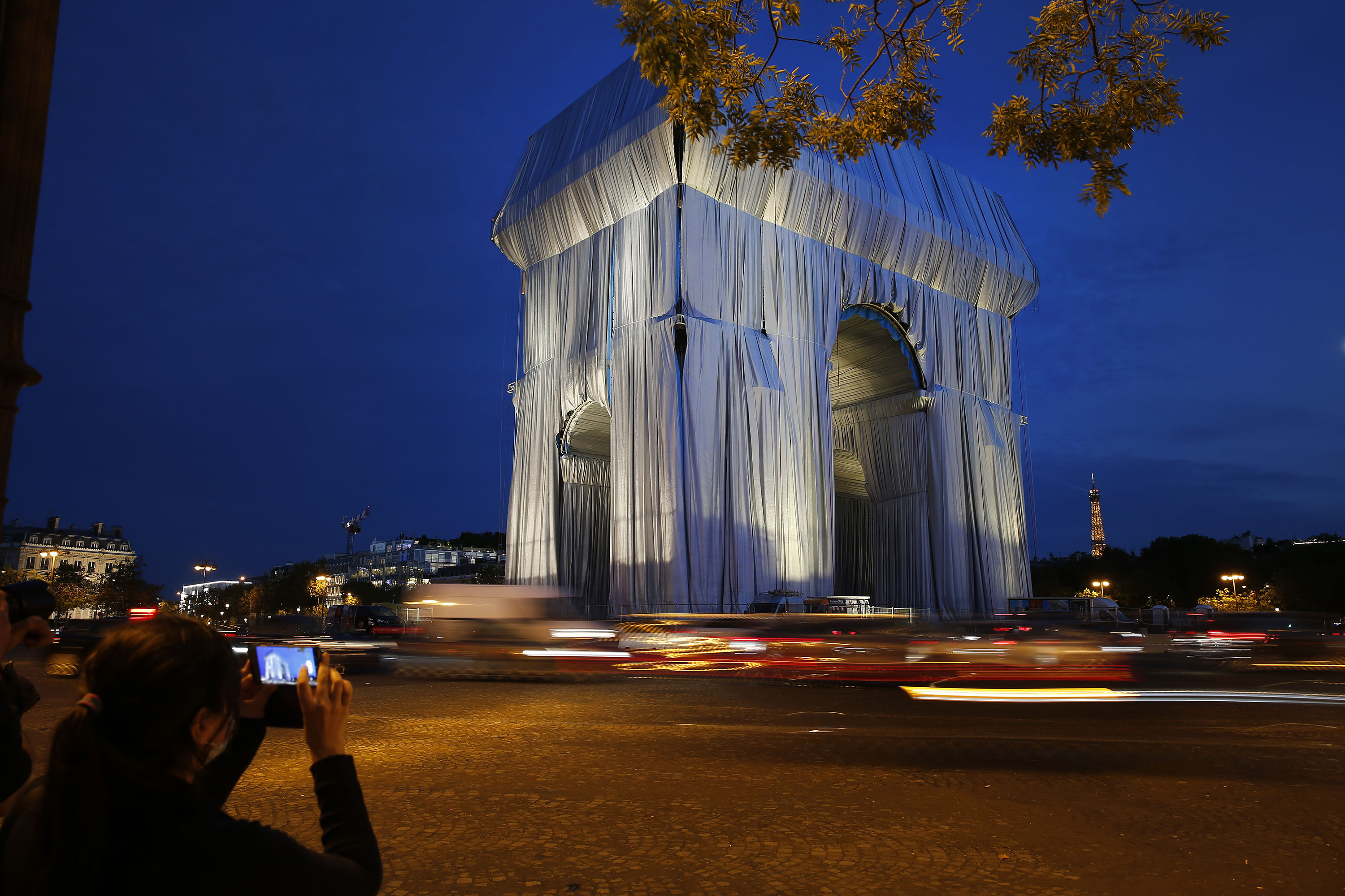 如今凯旋门突如其来以全新形象出现,被蓝银色布完全包裹,原来是为实现去年逝世的保加利亚包裹艺术大师Christo生前的愿望。