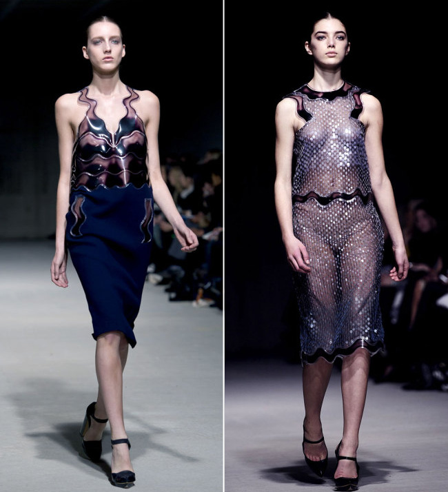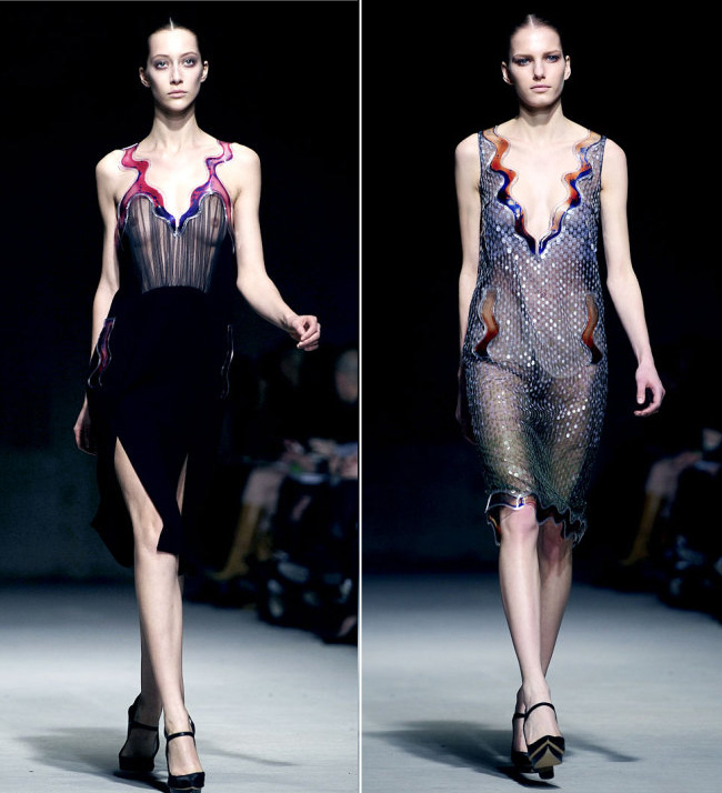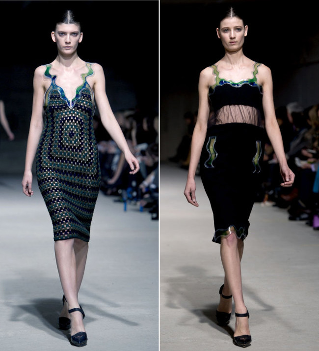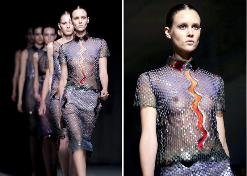 当各大媒体还在疑惑“创意伦敦”还在么的时候?Christopher Kane 2011 伦敦秋冬成衣秀却将波纹带入整个秀场,光谱图一样的条形图案更像是来自未来的某种神秘符号,裙装清一色走及膝复古雅致路线,薄纱与波纹的加入让复古变得更加摩登,而最后一组的高科技半透明材质则是全场亮点,好似小美人鱼一样童话。