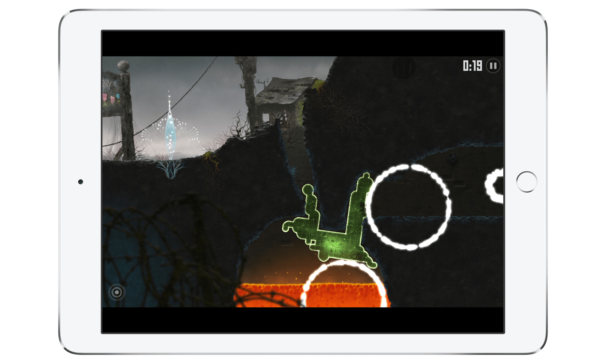 在游戏的过程中如果你触摸屏幕,只是回到主界面。接来下,聪明的你会发现,充分利用 iPhone 的重力感应、水平陀螺仪居然能闯关。 如果你继续玩下去,为了让你屏幕上抽象的图案发生变化,你会尝试着开关 Wi-Fi 和移动蜂窝数据,尝试着加减音量,尝试着调节屏幕亮度。