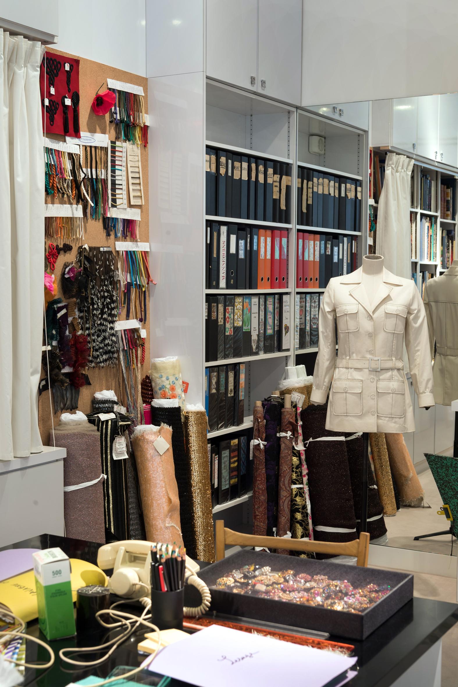 这间美术馆重在呈现20世纪末的高级定制及成衣时装屋的运作方式。你可以观看介绍走秀、媒体公关以及销售过程的纪录影片,还能欣赏到重工刺绣和高级定制珠宝作品。更重要的是,美术馆完整还原了 Saint Laurent 的私人工作室,跟他2002年卸任时一模一样,里面甚至有他的宠物狗 Moujik 的食盆。办公桌上的名片夹翻在羽饰坊 “Lemaire Plumier” 这一页,还有他的玳瑁眼镜,就好像他还在这里。