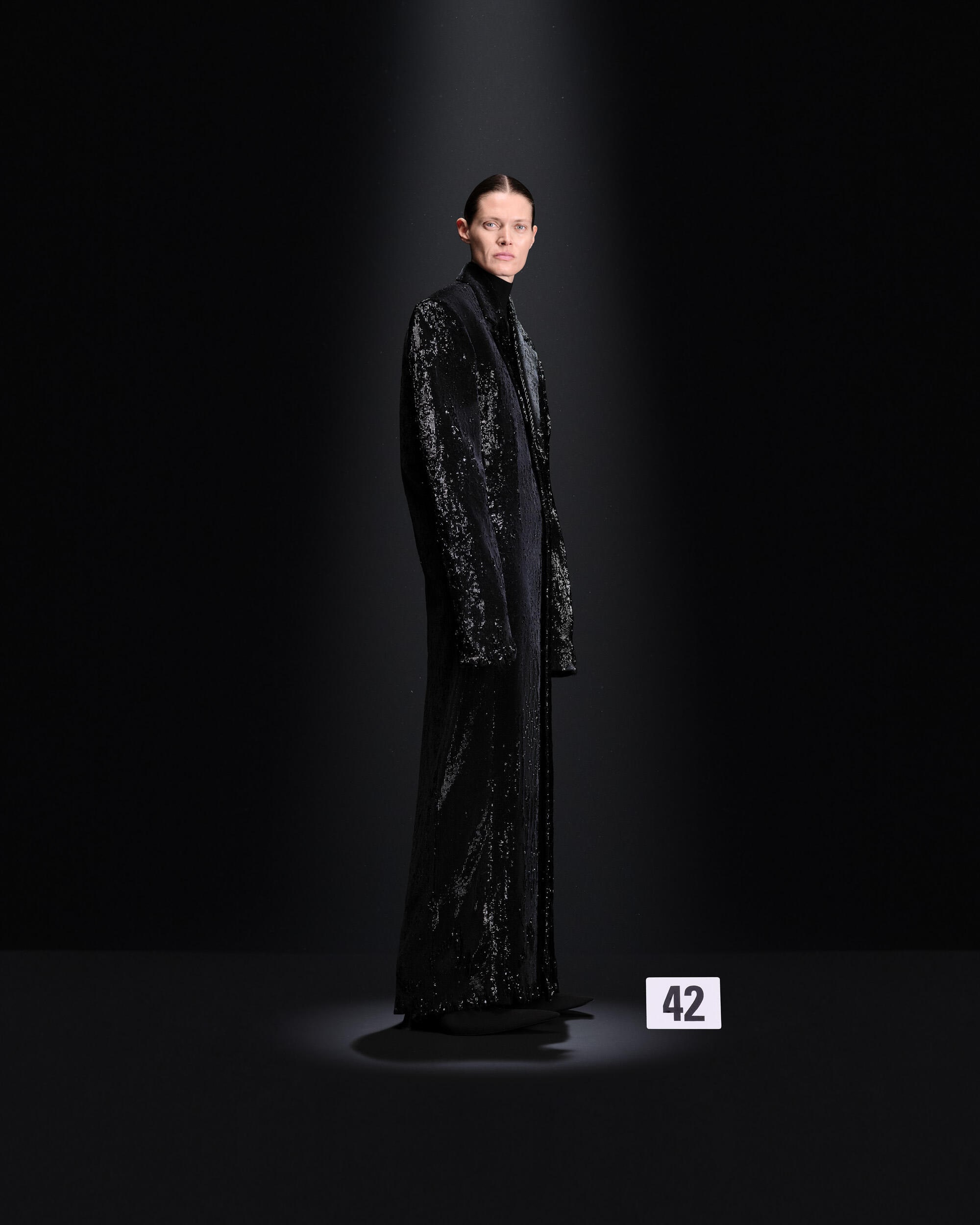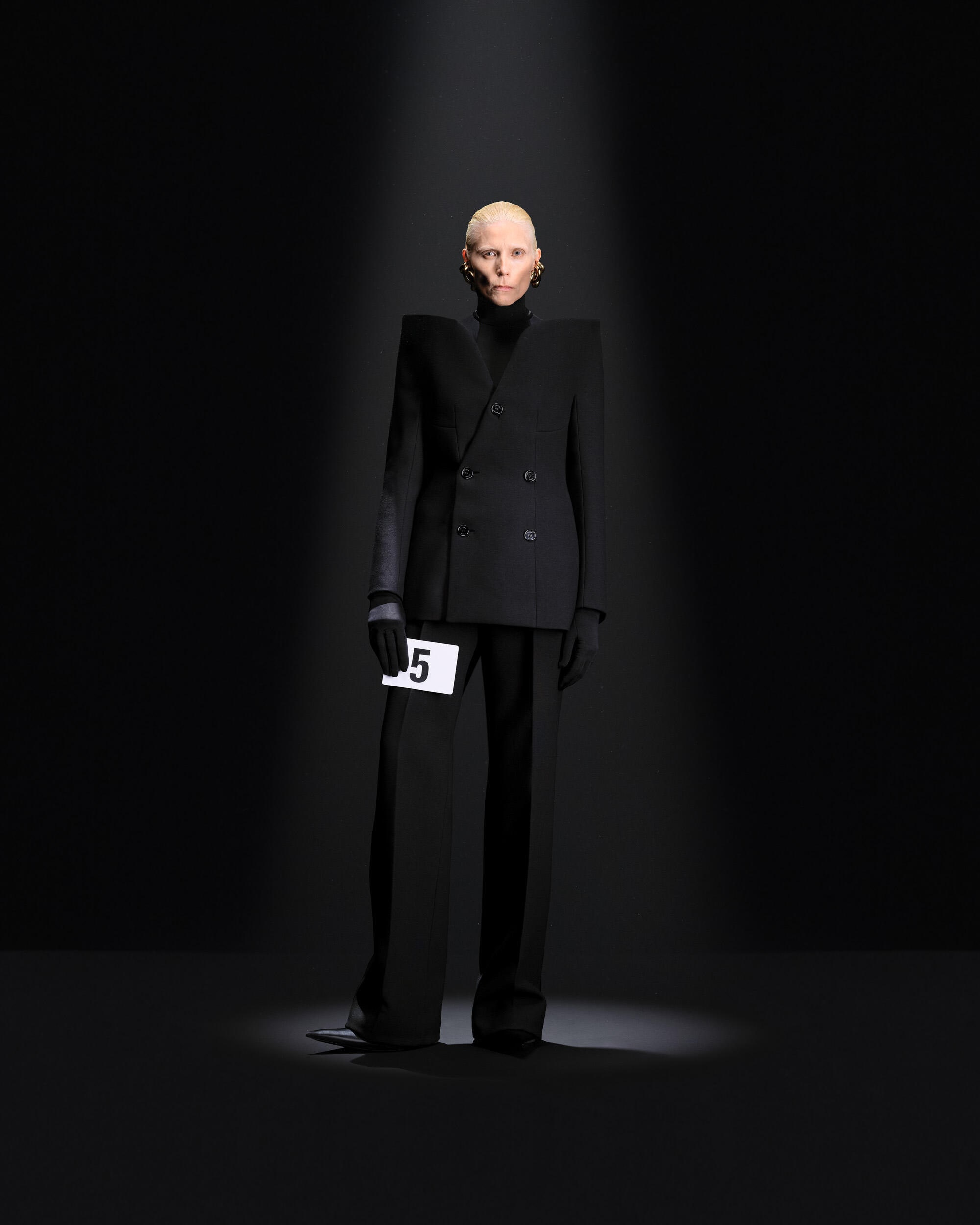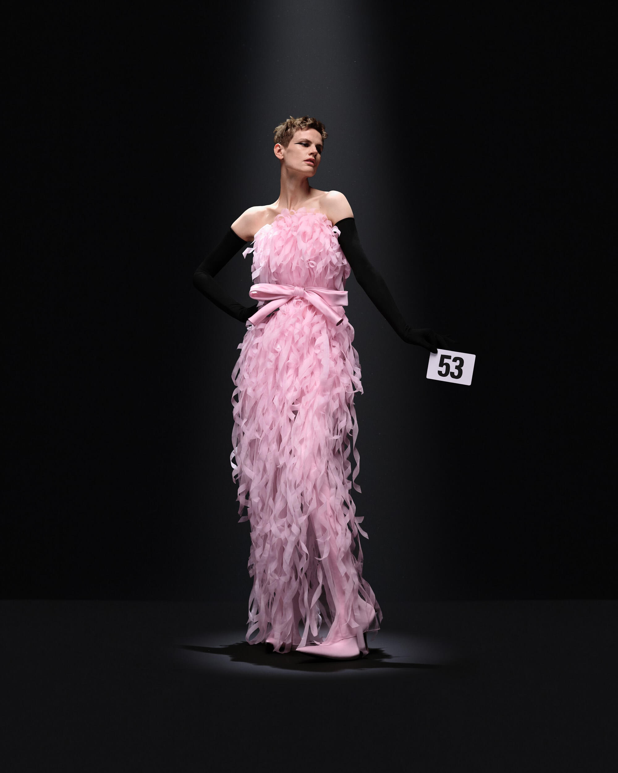 然而,首先是经典款式:早期的造型将Demna对于角度和宽松剪裁的偏爱应用到巴黎世家的雕塑式裁剪上。这位西班牙高级定制大师的设计理念在后来的礼服中更加明显,腰部被收紧,裙摆或丝绸长裙如瀑布般垂落。
