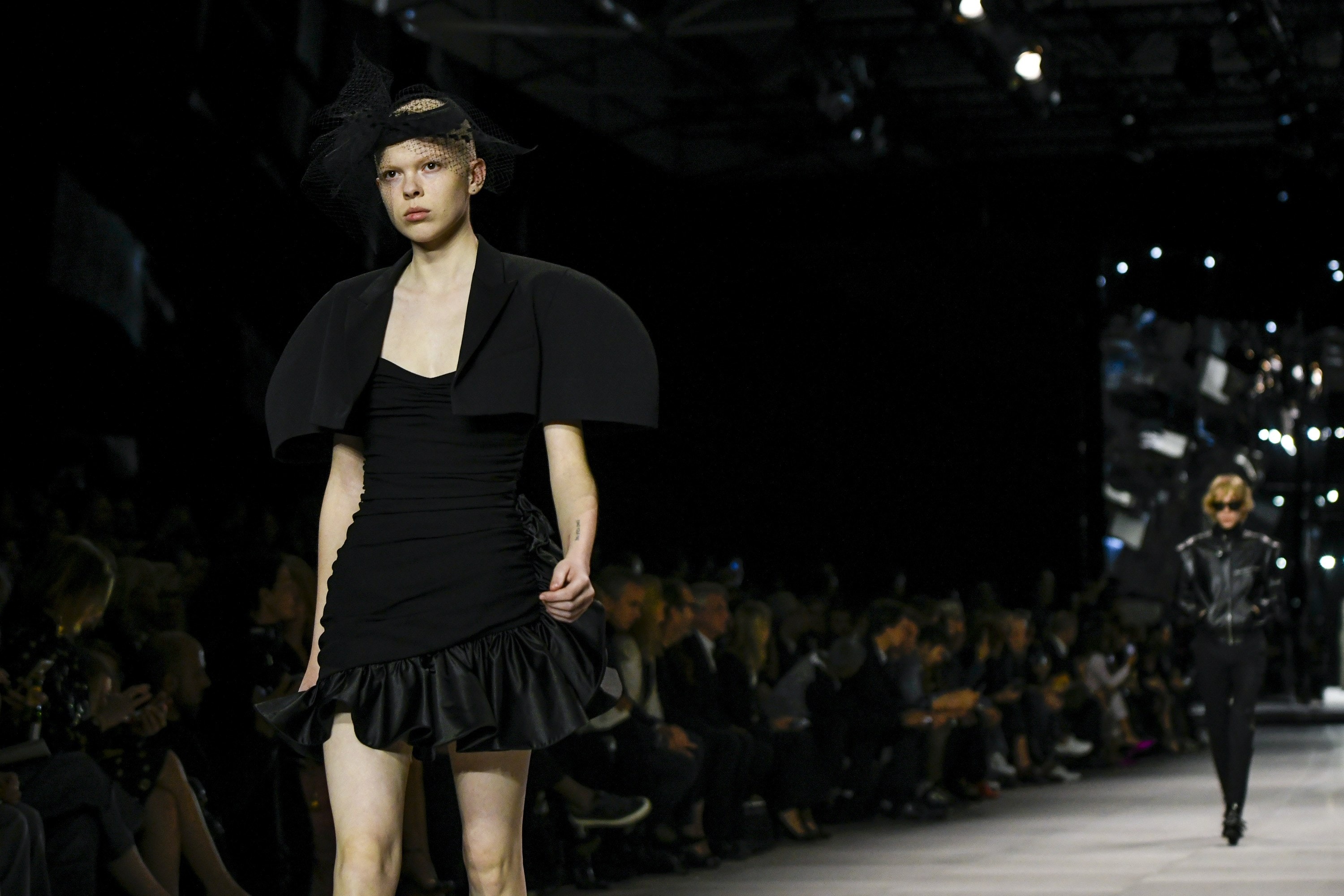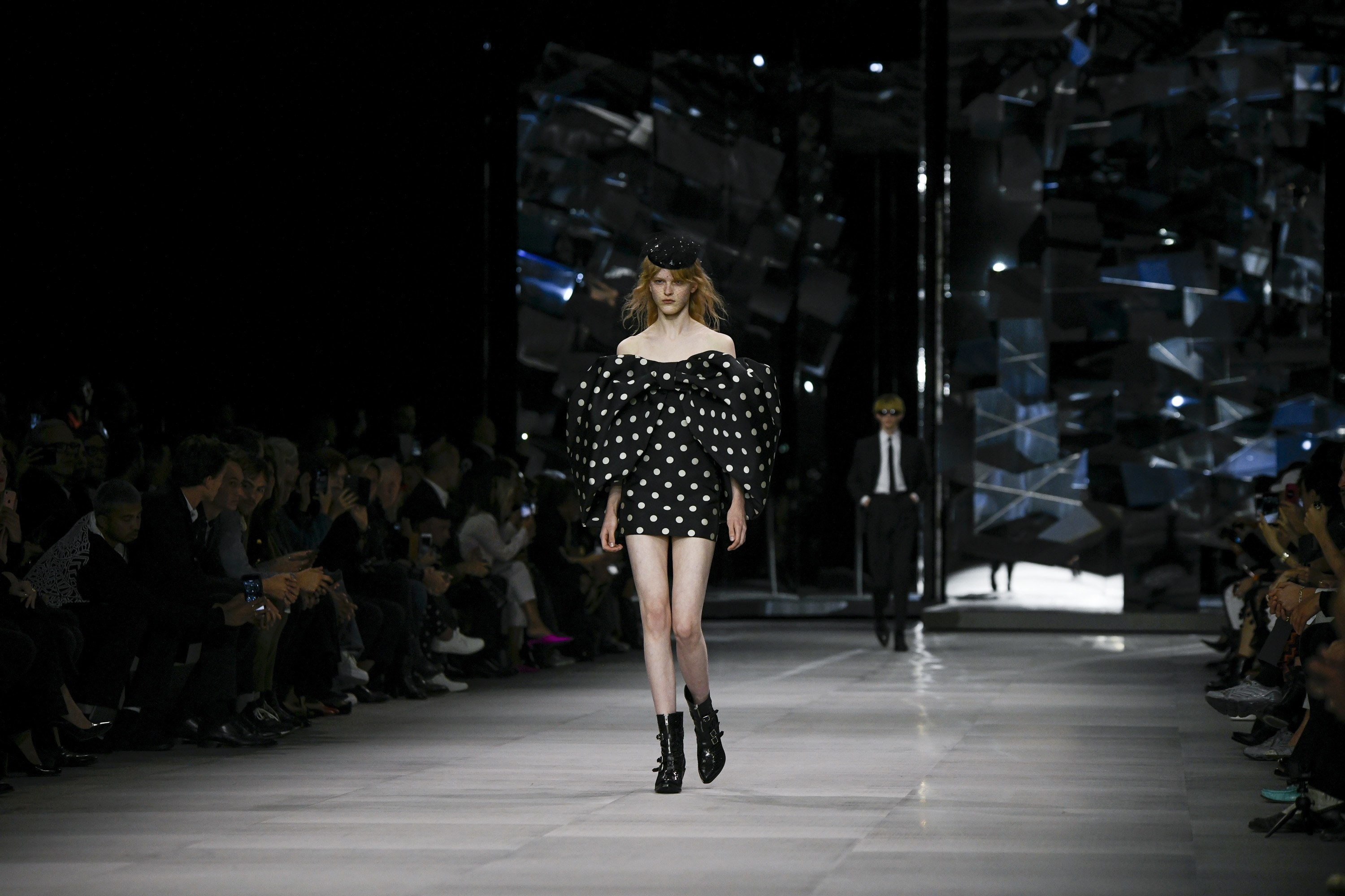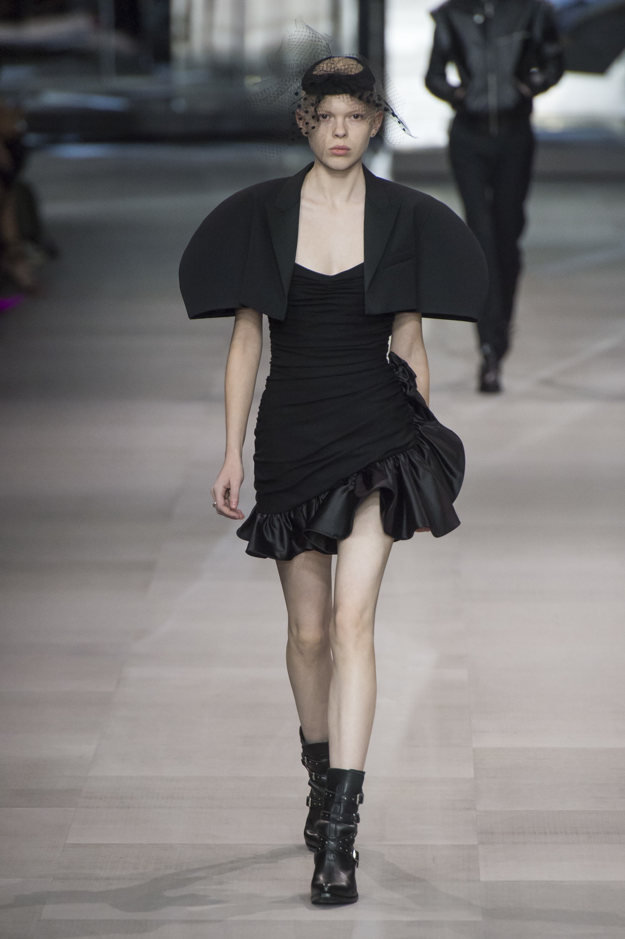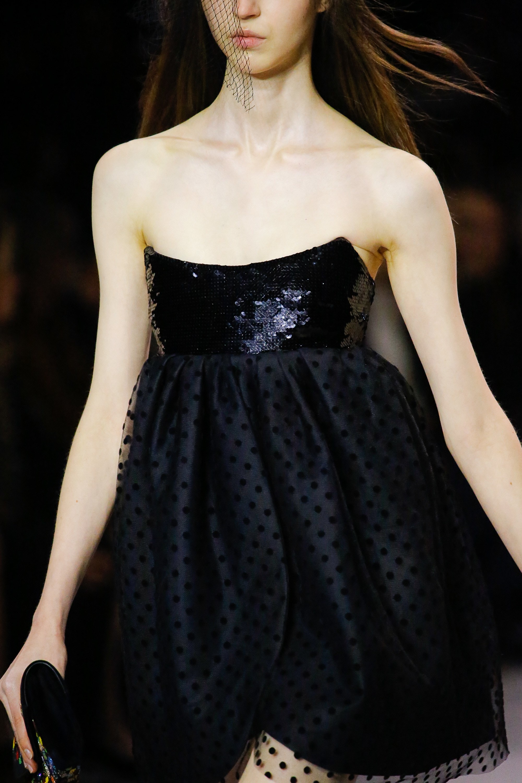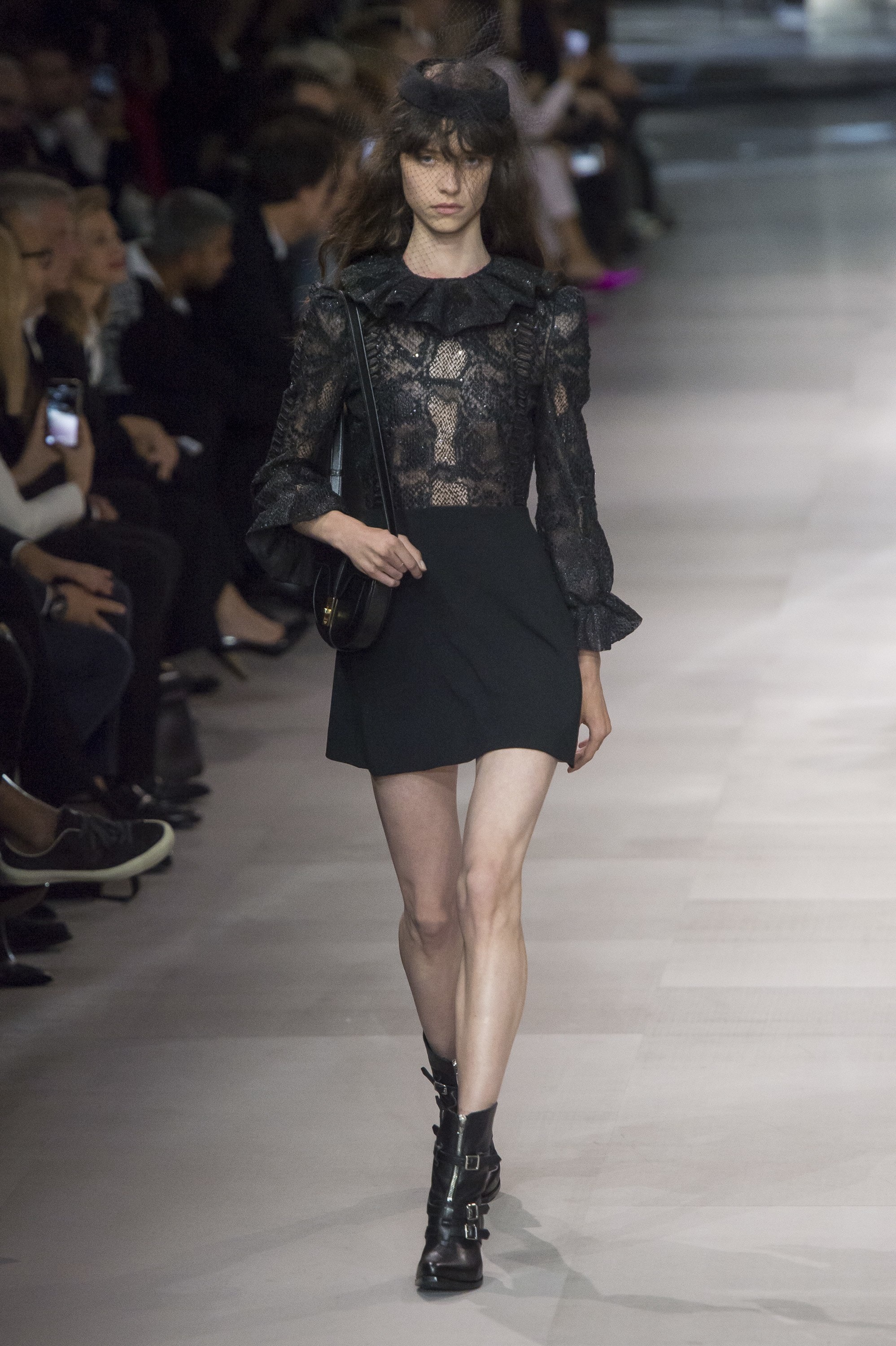 如果说CELINE在 Phoebe 时代是成熟女人风格的话,那 Hedi 直接把CELINE带入到巴黎派对女孩的风格里,高调的亮片开始频繁出现,各式小礼裙成为主力。其余时候,便是在贴合身体线条短裙之外,披着强调肩部的短款外套、戴着以纱遮面的黑色小礼帽、踩着搭扣皮靴的造型。偶有可爱风格的斑点泡泡袖连衣裙和纱裙,以及艺术家Christian Marcley的艺术印花,但由于整体设计以黑色为主,酷且高冷的形象会更为突出。