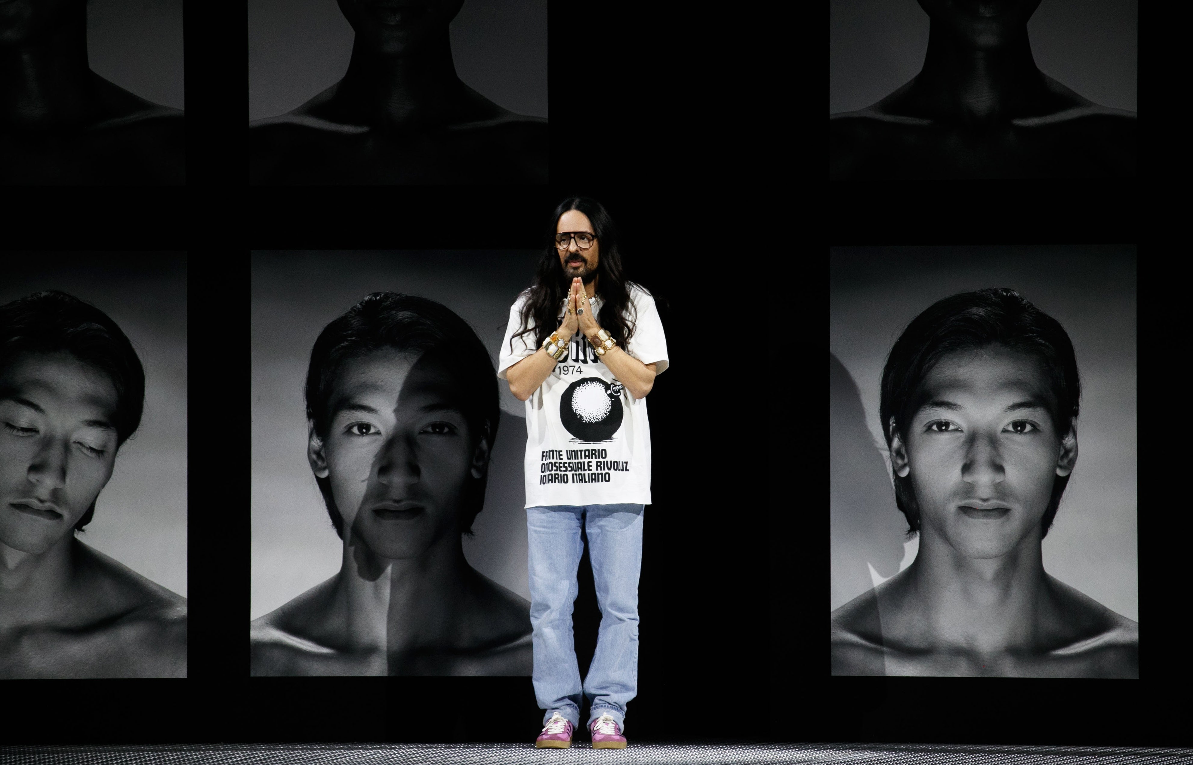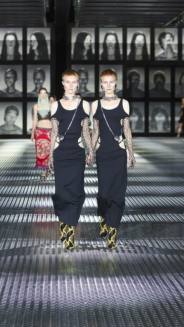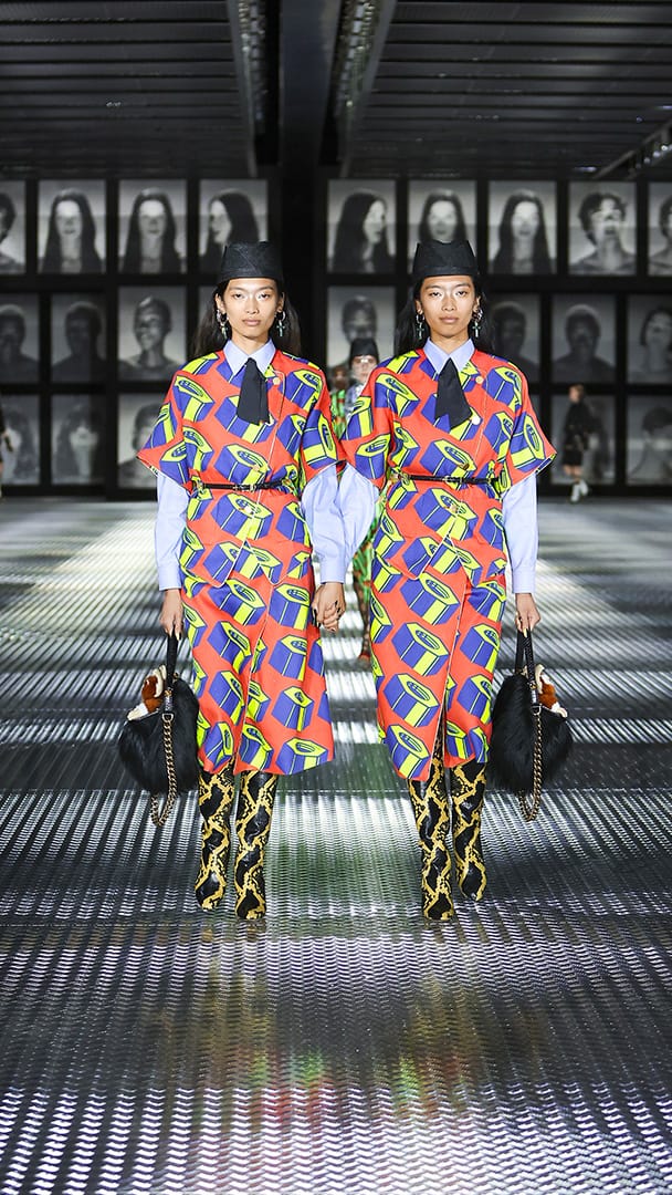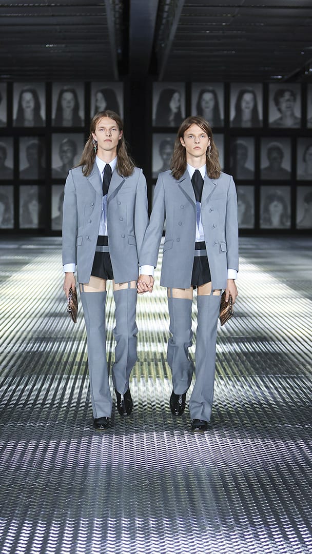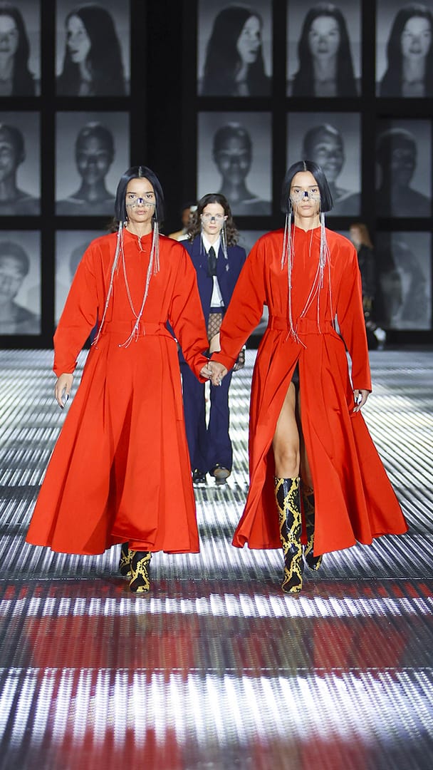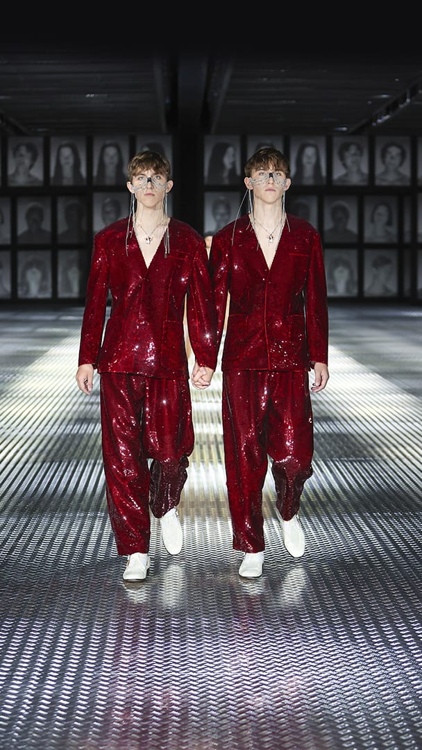 接着,这一对对双胞胎从秀场两端会合,牵起对面一模一样的人的手,走向场中央,这让大秀的戏剧张力再次拉满,现在究竟是来到另一个复制出来的平行时空?还是 Alessandro Michele 的戏法?