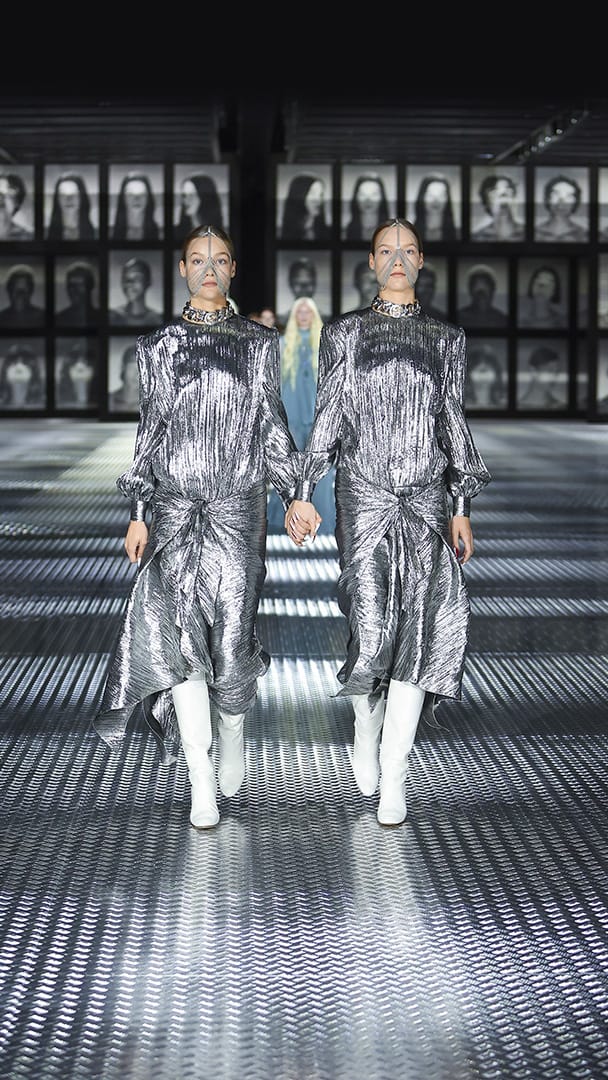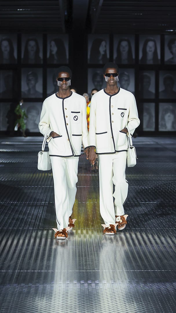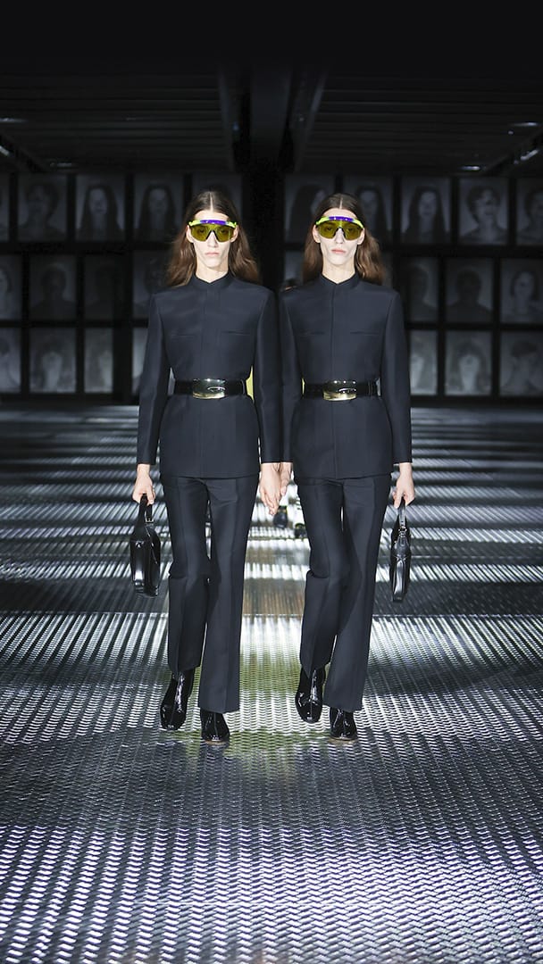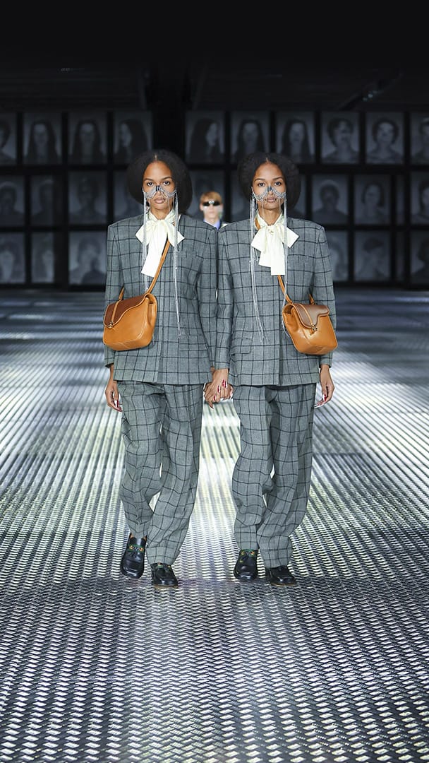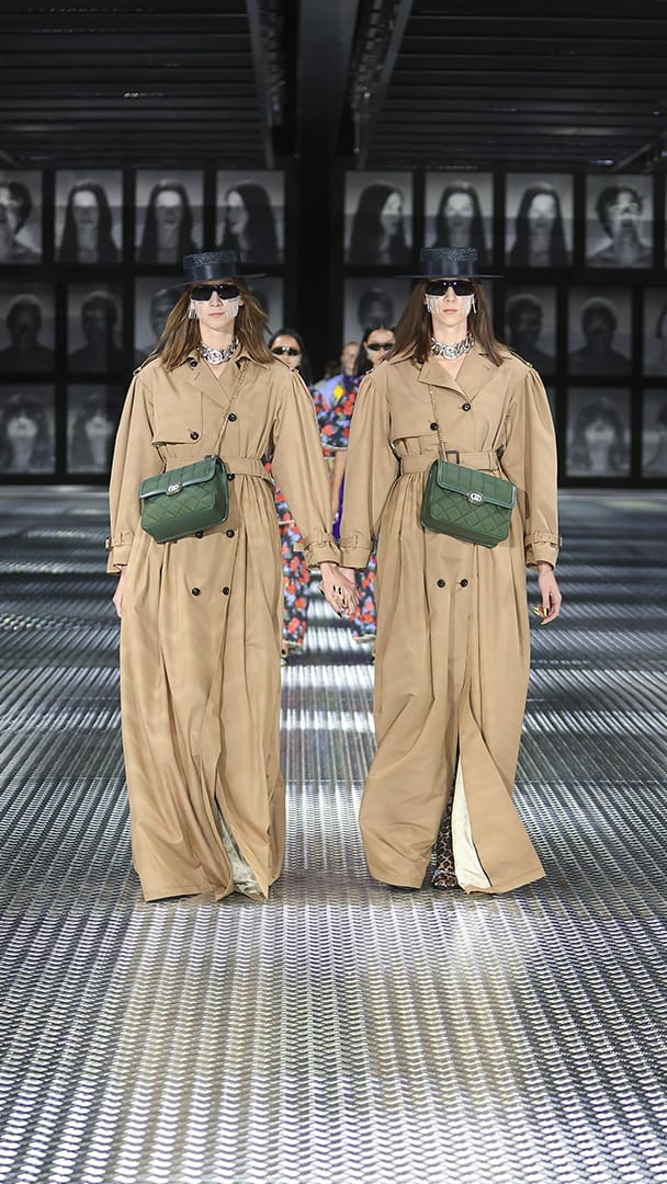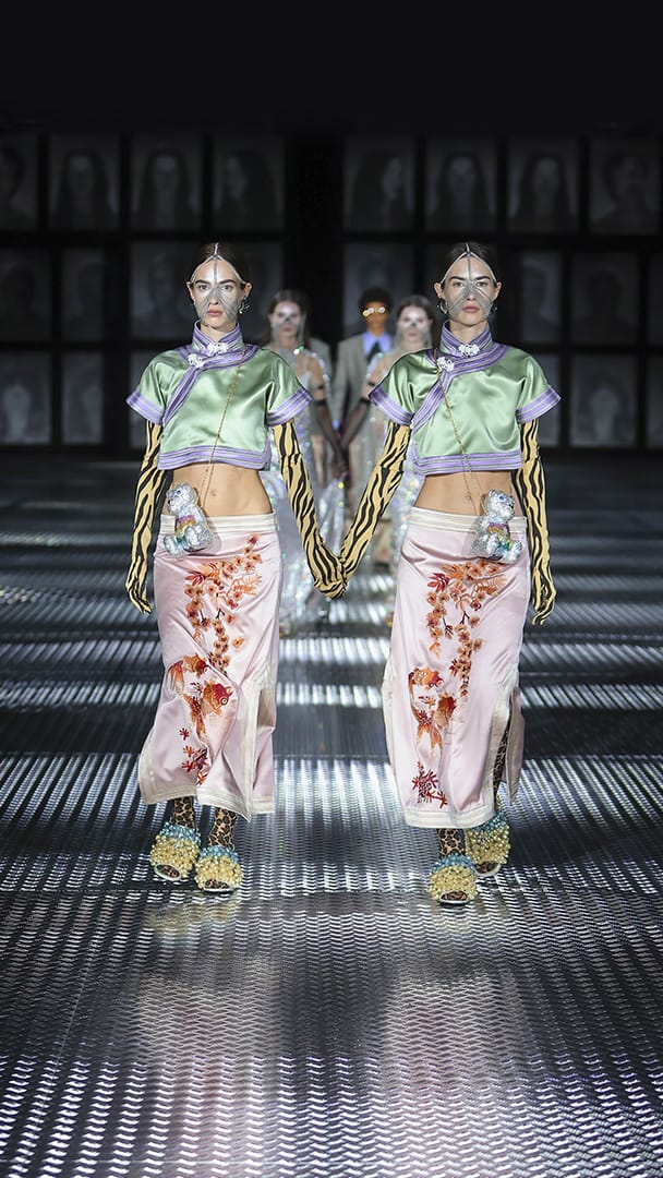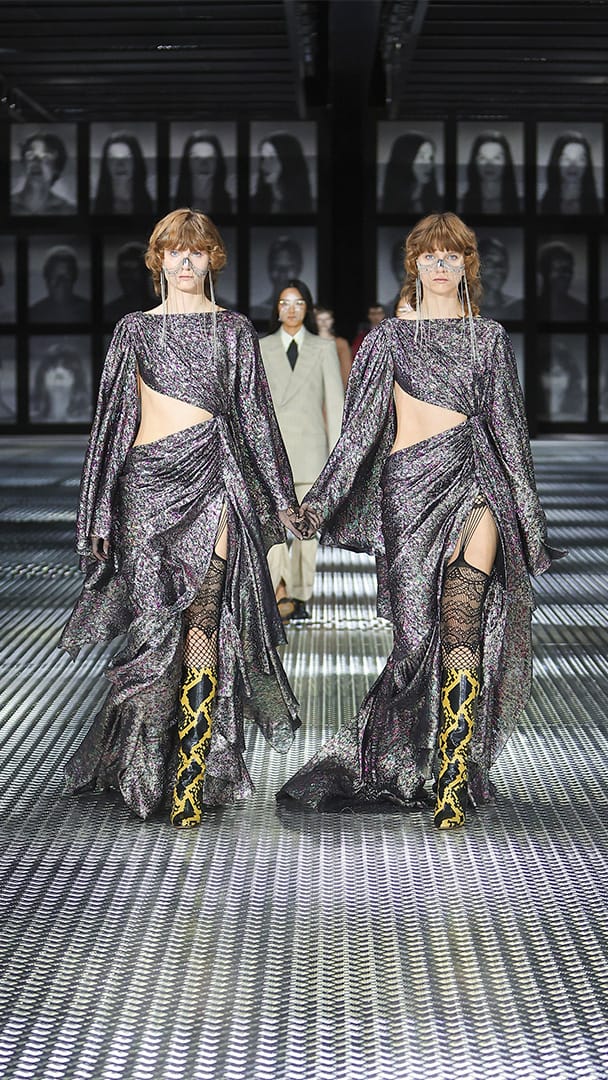 双重分身与自我认同,一直以来都是 Alessandro Michele 所执迷的题材,如过去他和曾 Jared Leto 打扮成双胞胎出席 Met Gala,或打造提着复制人头走秀的惊悚场景。 Michele 认为,世上即使有另一个你,穿着相同、形貌相同,每个人终究是不同的个体,拥有相异的风格,拥抱不同的灵魂,「同样的衣服在相同的身体上,却能散发出截然不同的气质。」他说道。