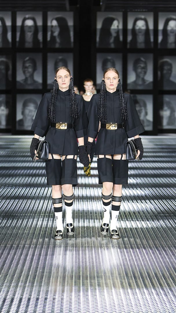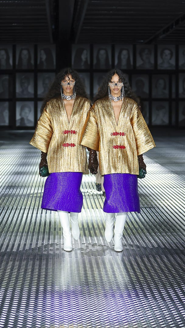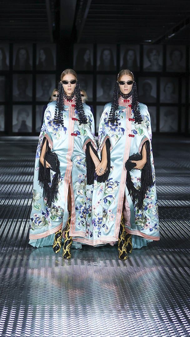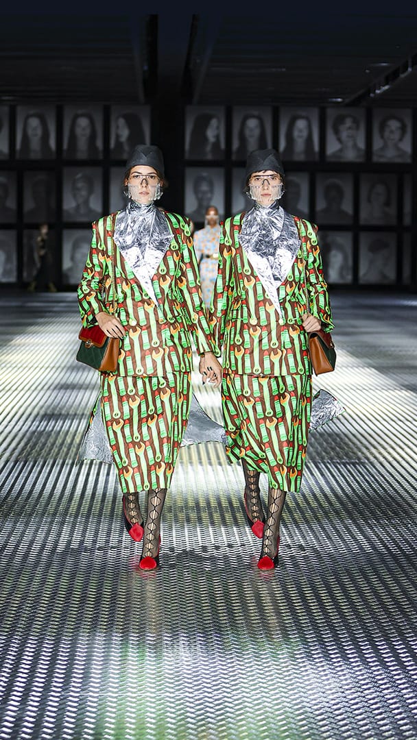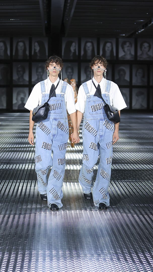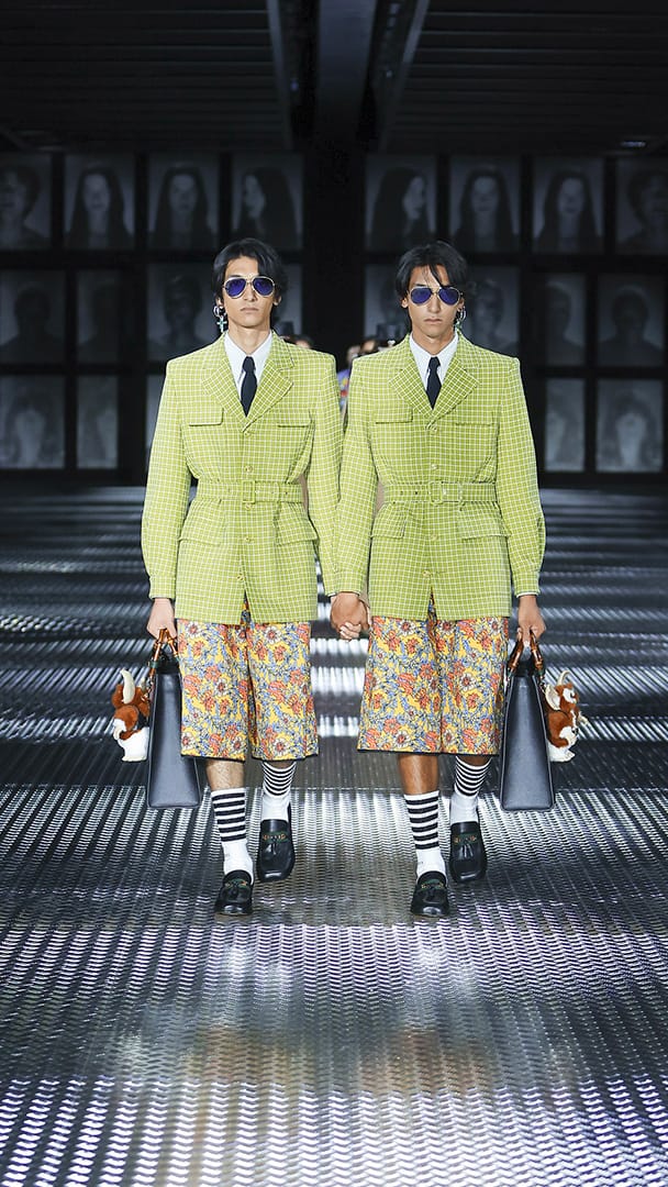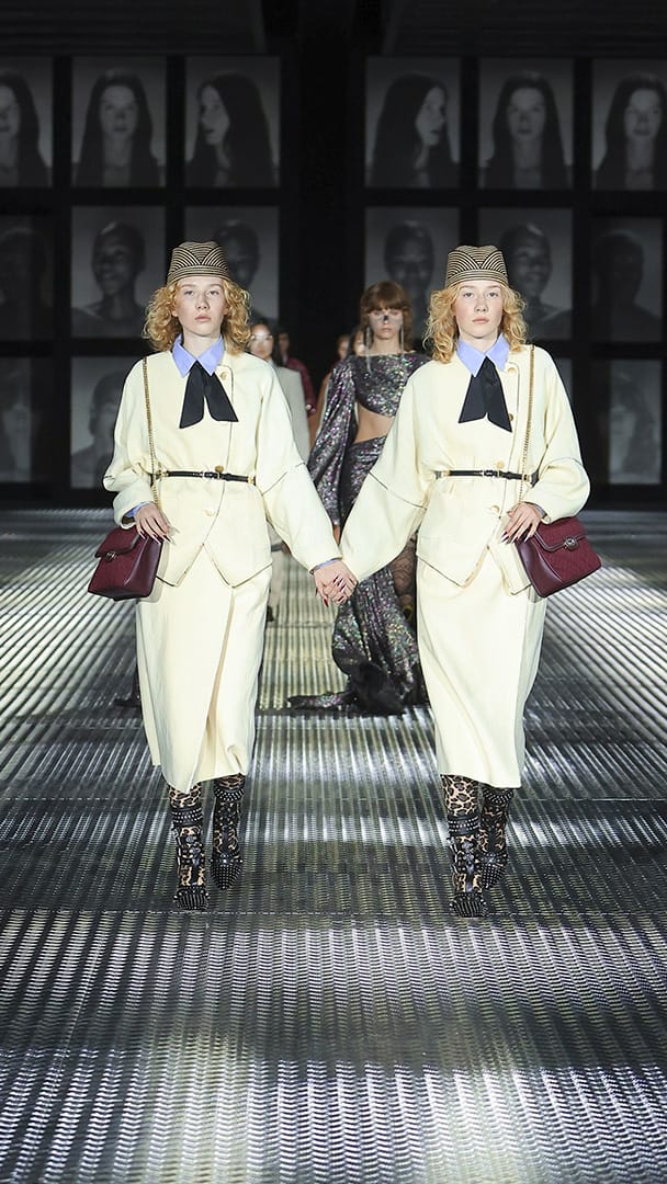 双重分身与自我认同,一直以来都是 Alessandro Michele 所执迷的题材,如过去他和曾 Jared Leto 打扮成双胞胎出席 Met Gala,或打造提着复制人头走秀的惊悚场景。 Michele 认为,世上即使有另一个你,穿着相同、形貌相同,每个人终究是不同的个体,拥有相异的风格,拥抱不同的灵魂,「同样的衣服在相同的身体上,却能散发出截然不同的气质。」他说道。