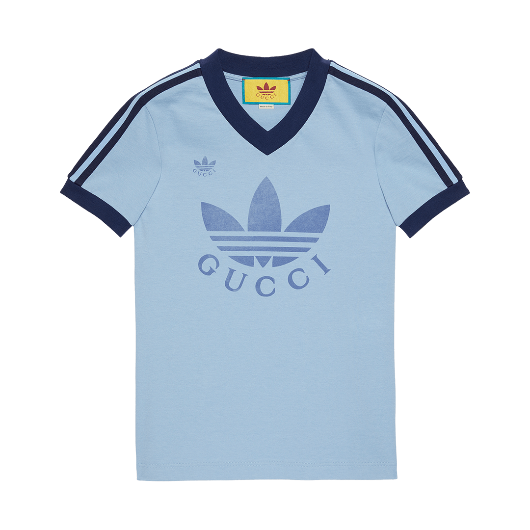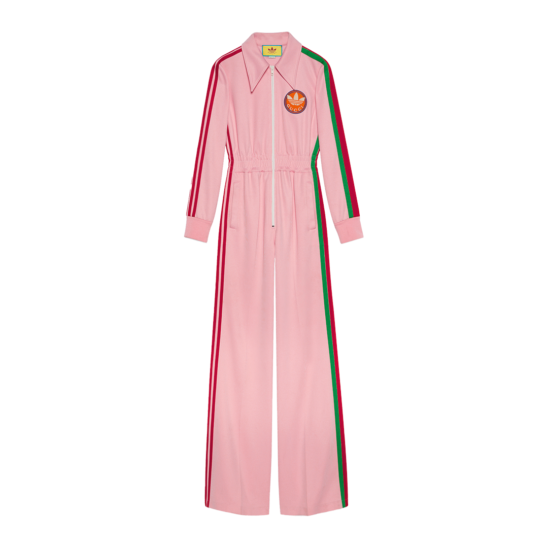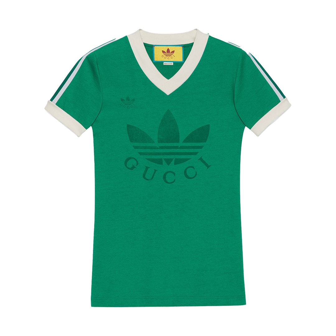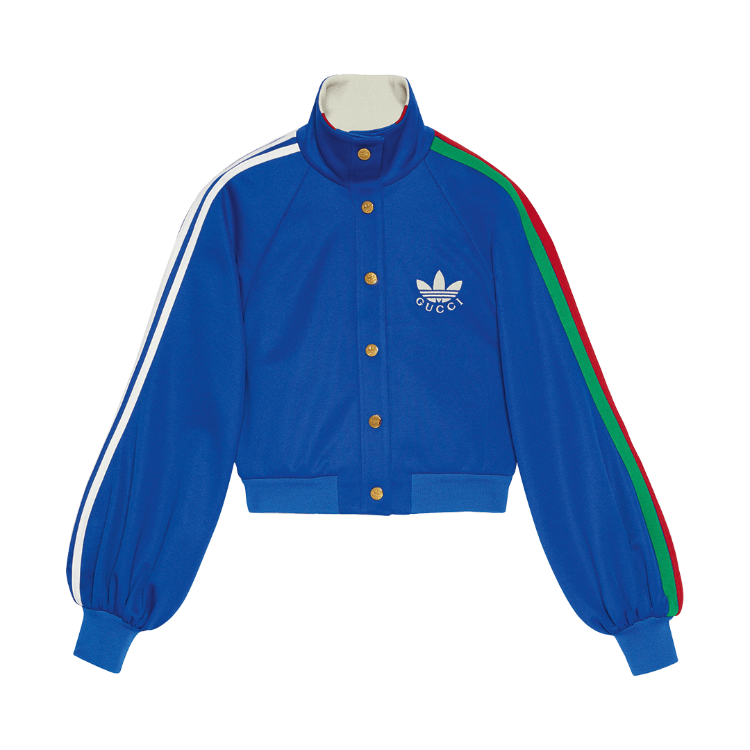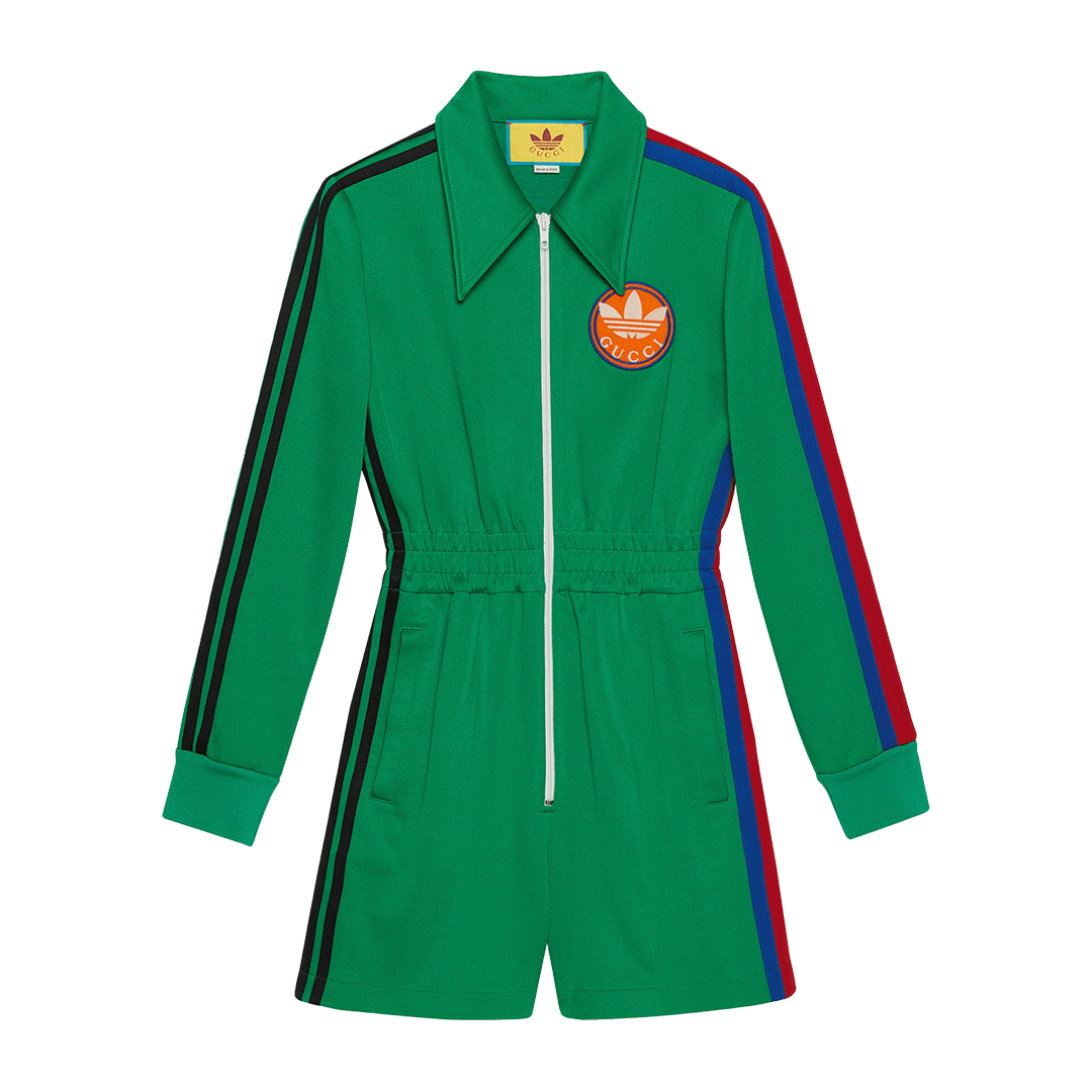此次合作以复古美学为主题,将传统意义上的正装单品与复古语境结合,将Adidas的三叶草、三条纹标志与GUCCI的「双 G」图样、红灯绿织带等元素相融合,打造复古特色鲜明的运动单品。