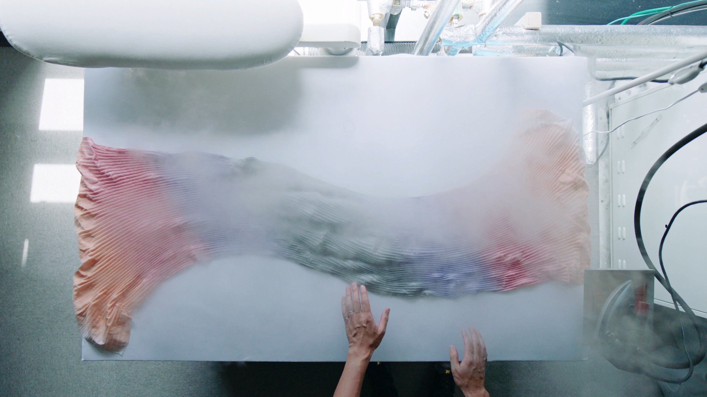 由植物环保科技材质打造,这套A-POC Able Issey Miyake 演出服装最特别之处来自——由科技面料新创公司 Spiber 所研发的「Brewed Protein™ 人造纤维」,与 A-POC Able Issey Miyake 经典的「3D蒸气延展褶绉(3D Stream Stretch)」技术共同制成。