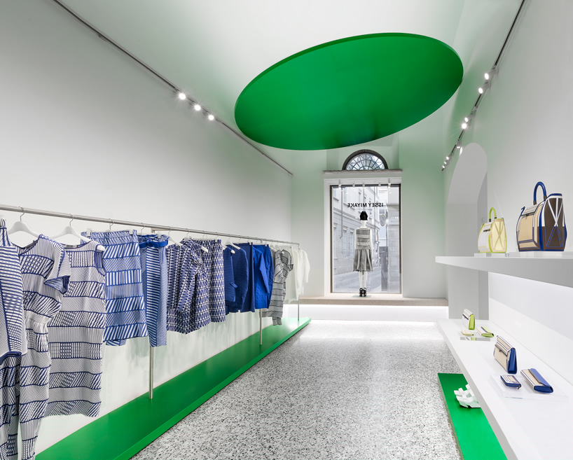 店内设计也再度邀请了该品牌的长期合作设计师 Tokujin Yoshioka 吉冈德仁 主持设计,Tokujin Yoshioka 在设计中再度发掘色彩的美学价值,蓝色,橙色和绿色的铝制板搭配银色金属架成为简约主义色彩浓厚的设计中极为耐人寻味的亮点,使得整个空间的设计简洁中不乏趣味。
