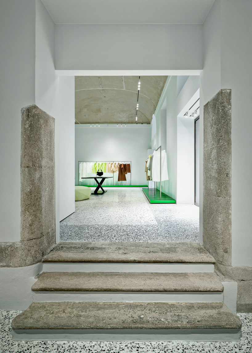 该旗舰店所在位置是一栋 19 世纪的建筑,为了保留原有的历史元素,设计师不仅保留了建筑本身的穹顶,还用到了古罗马中世纪建筑风格的典型结构“拱券”。在各个陈列房间之间,以圆弧形的拱门作为隔断,房间内部的顶部也呈现拱形,这种建筑结构向来具有良好的竖向承重能力,还起着装饰美观的效果。