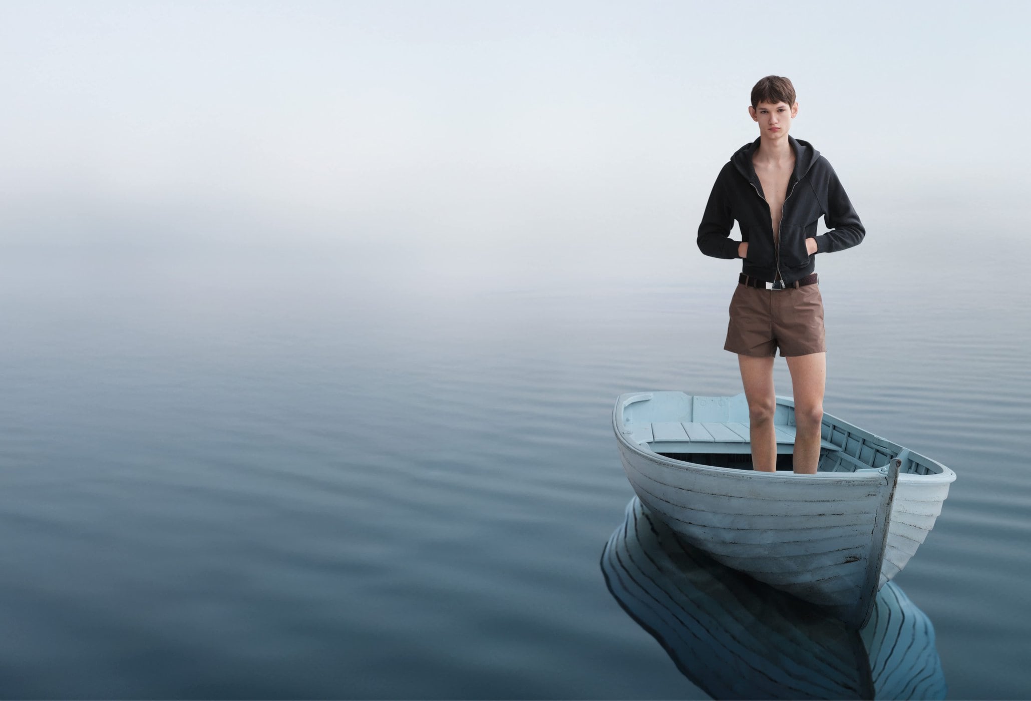 画面中,三位主角端坐于色彩明艳的意大利木船之上,悬浮于镜面般平静的水天交界处。这方无垠之境凝固了时光的流动,宛如对慵懒夏日时光的诗意礼赞。造型美学将都市精致感与海岸松弛风完美交织,优雅勾勒出穿梭于现实秩序与远方冒险之间的漂浮状态。整体氛围在静谧与悸动间形成微妙张力,既蕴含向内沉思的哲思,又暗涌着对地平线外未知事物的期待。