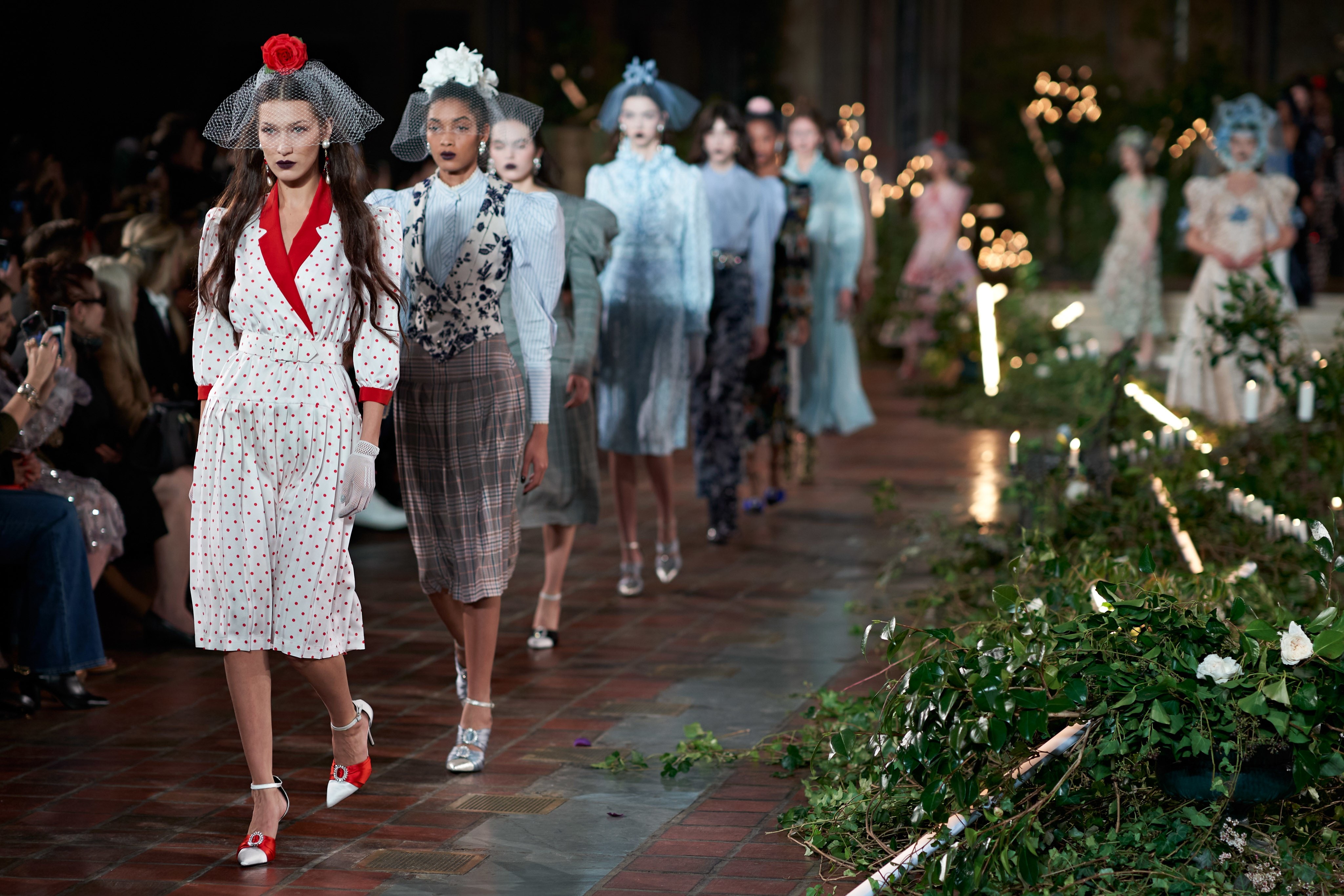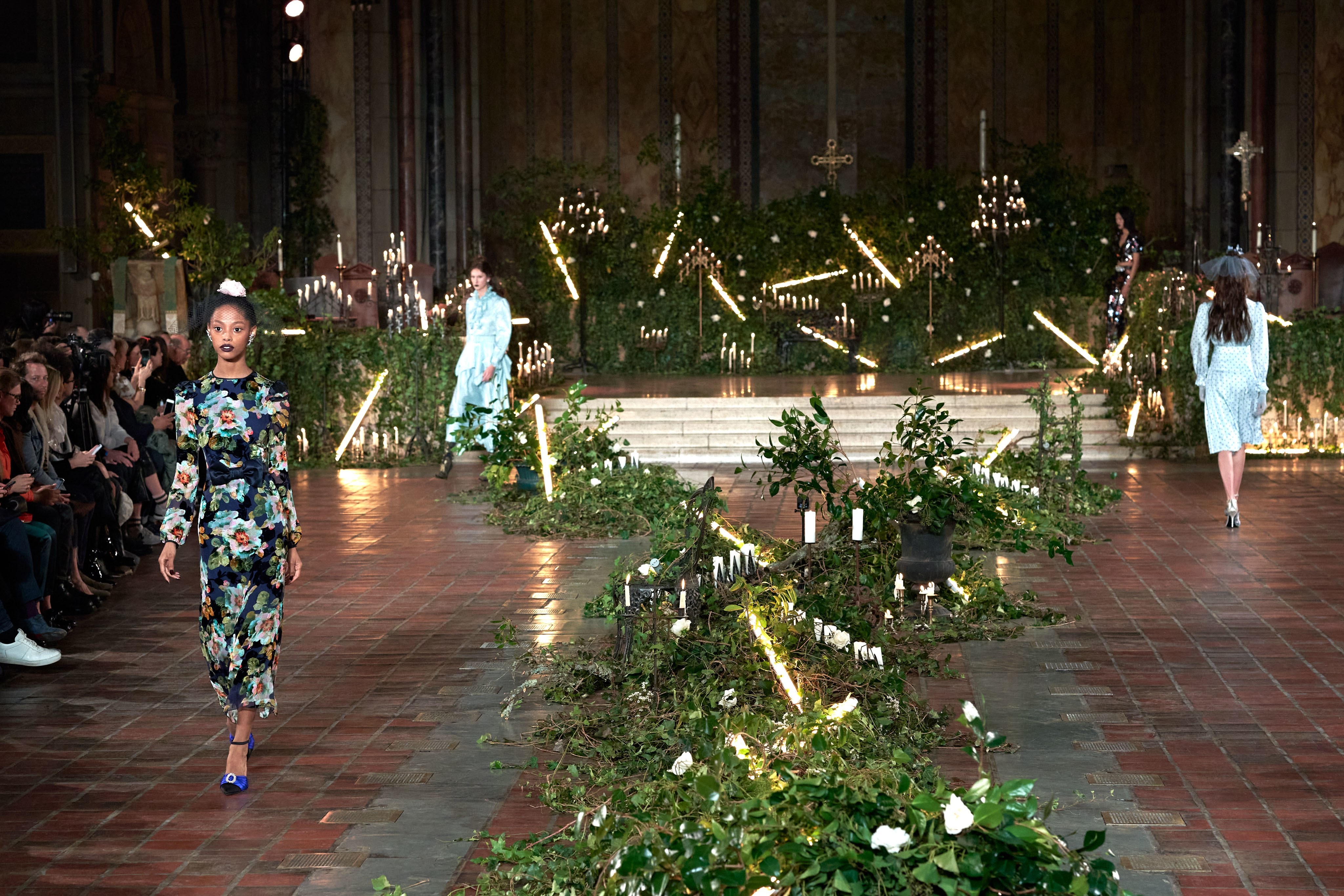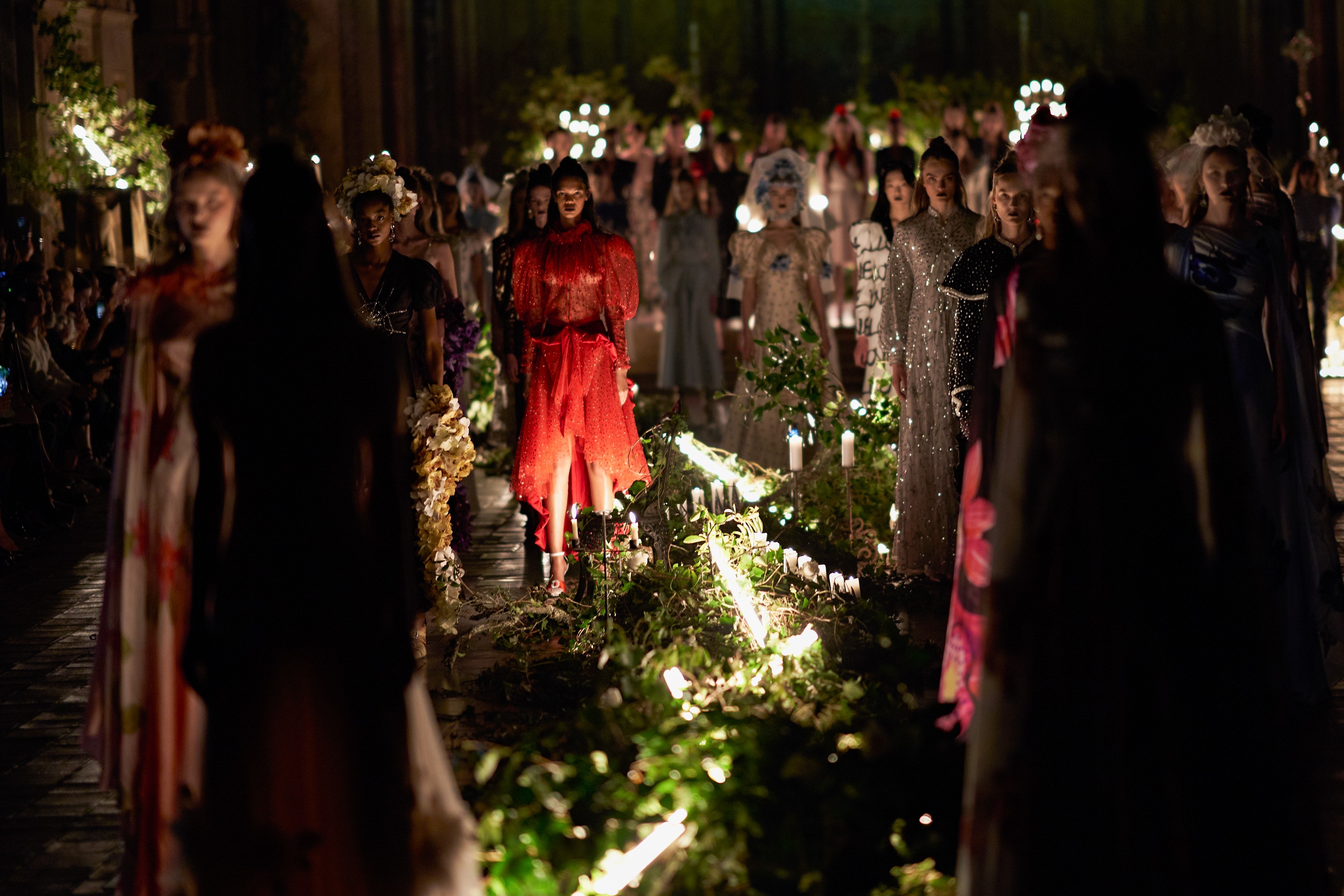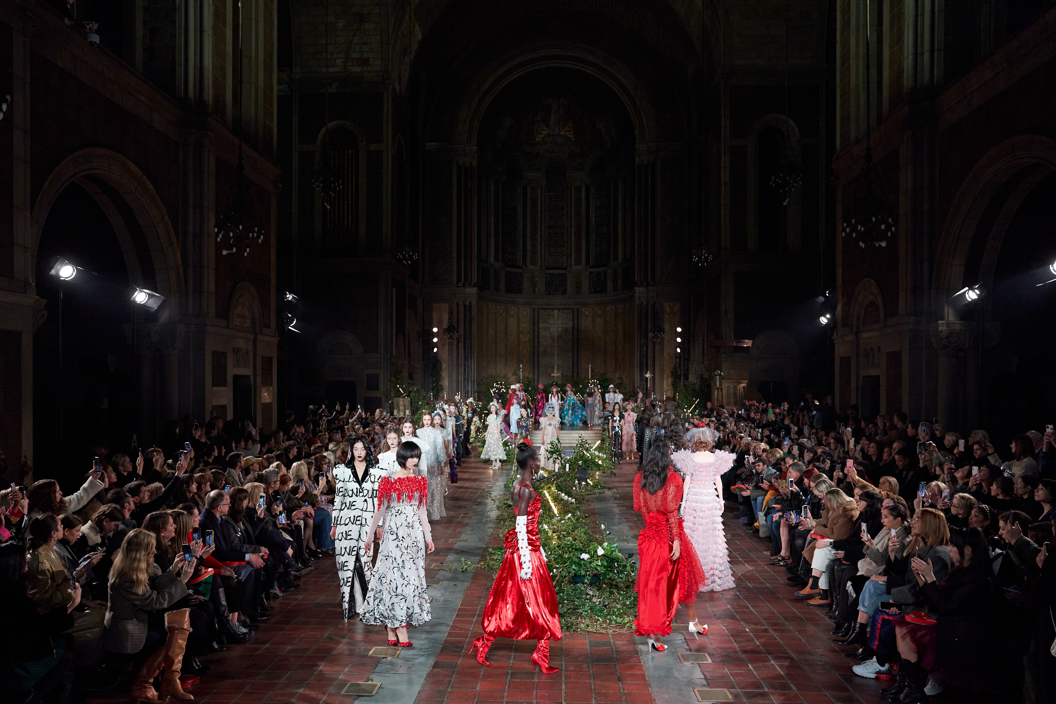 在Kate 和 Laura Mulleavy 设计下的2020年秋冬系列,则对1992年弗朗西斯·科波拉导演电影《惊情四百年》里吸血鬼德古拉服装的出色”改编”。系列在烛光、玫瑰花填充的圣巴塞洛缪教堂的罗马式背景下展示,Winona Ryder 的年轻 Mina Harker 影响力可以从羊腿袖礼服中感受到。至于Vlad王子?黑暗的头巾斗篷和闪耀发光的蜘蛛贴花是对这个黑暗王子以及他的Transylvanian住所致敬。