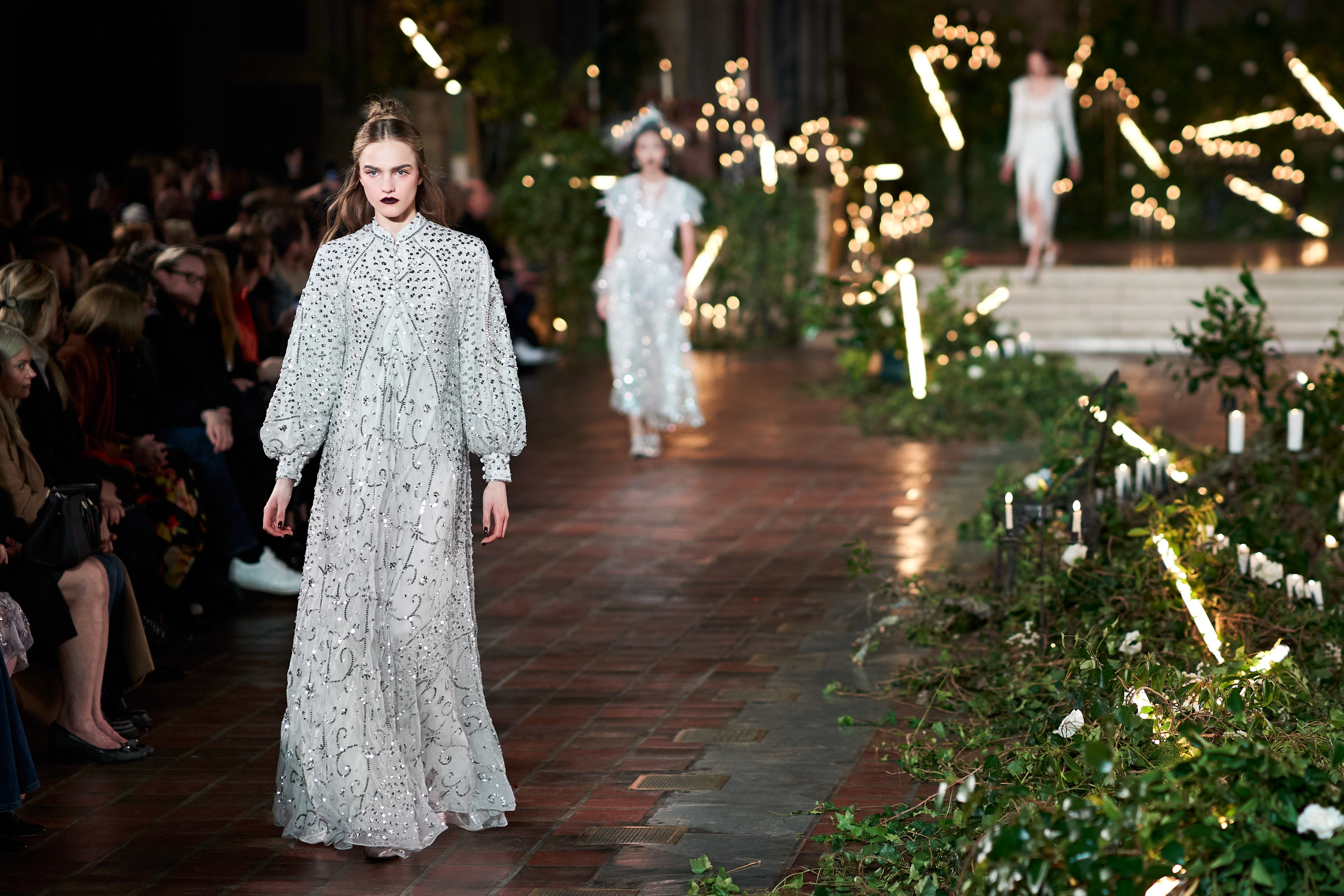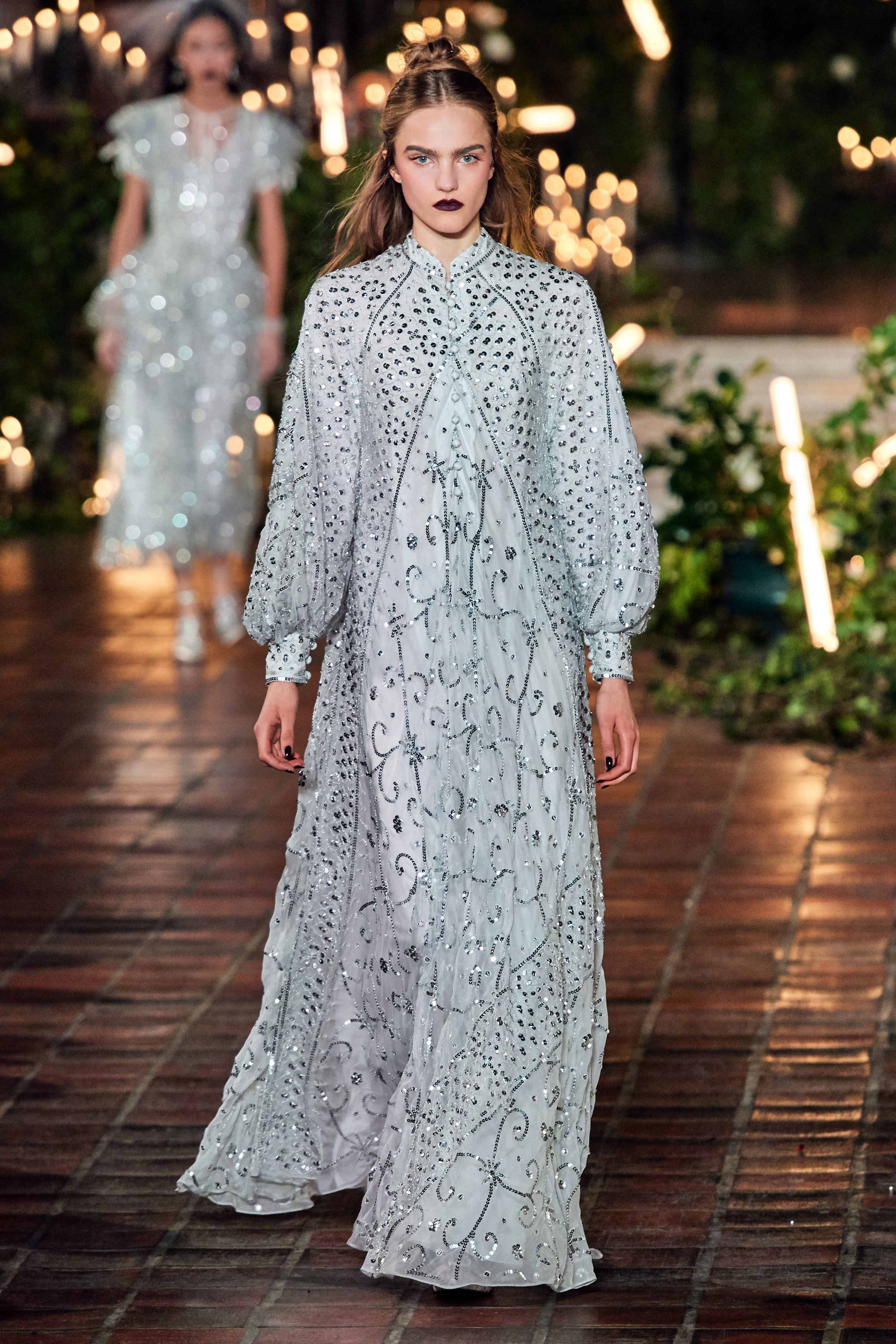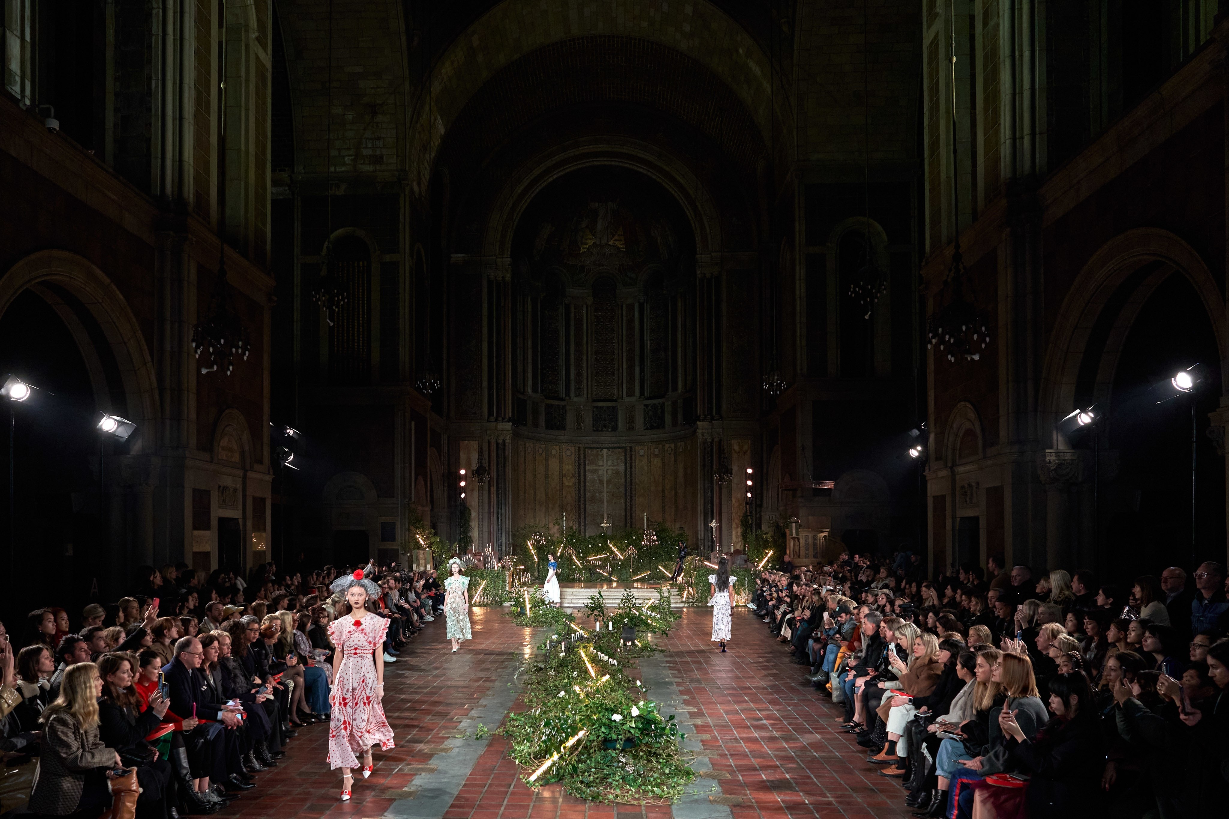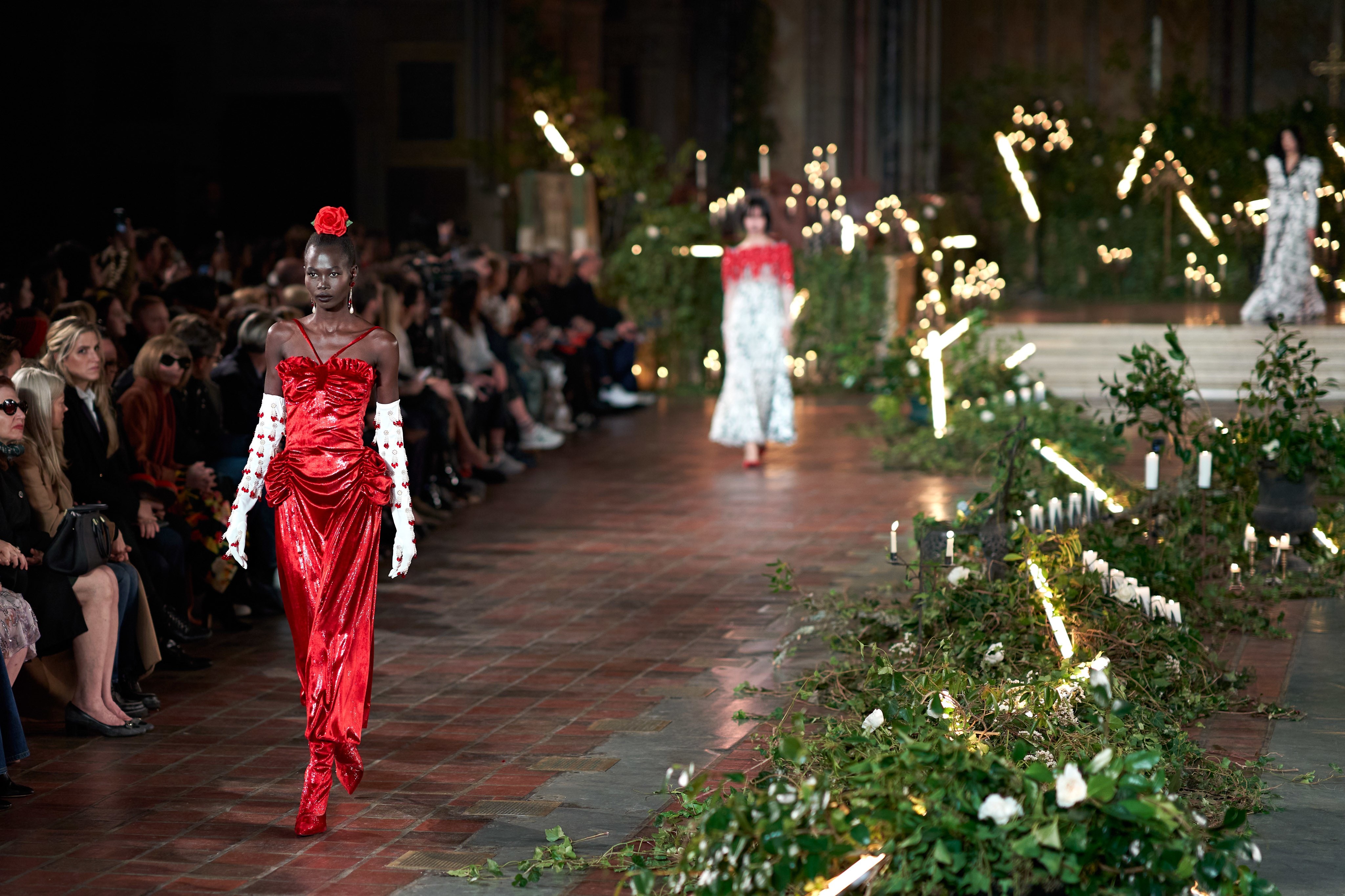 在Kate 和 Laura Mulleavy 设计下的2020年秋冬系列,则对1992年弗朗西斯·科波拉导演电影《惊情四百年》里吸血鬼德古拉服装的出色”改编”。系列在烛光、玫瑰花填充的圣巴塞洛缪教堂的罗马式背景下展示,Winona Ryder 的年轻 Mina Harker 影响力可以从羊腿袖礼服中感受到。至于Vlad王子?黑暗的头巾斗篷和闪耀发光的蜘蛛贴花是对这个黑暗王子以及他的Transylvanian住所致敬。