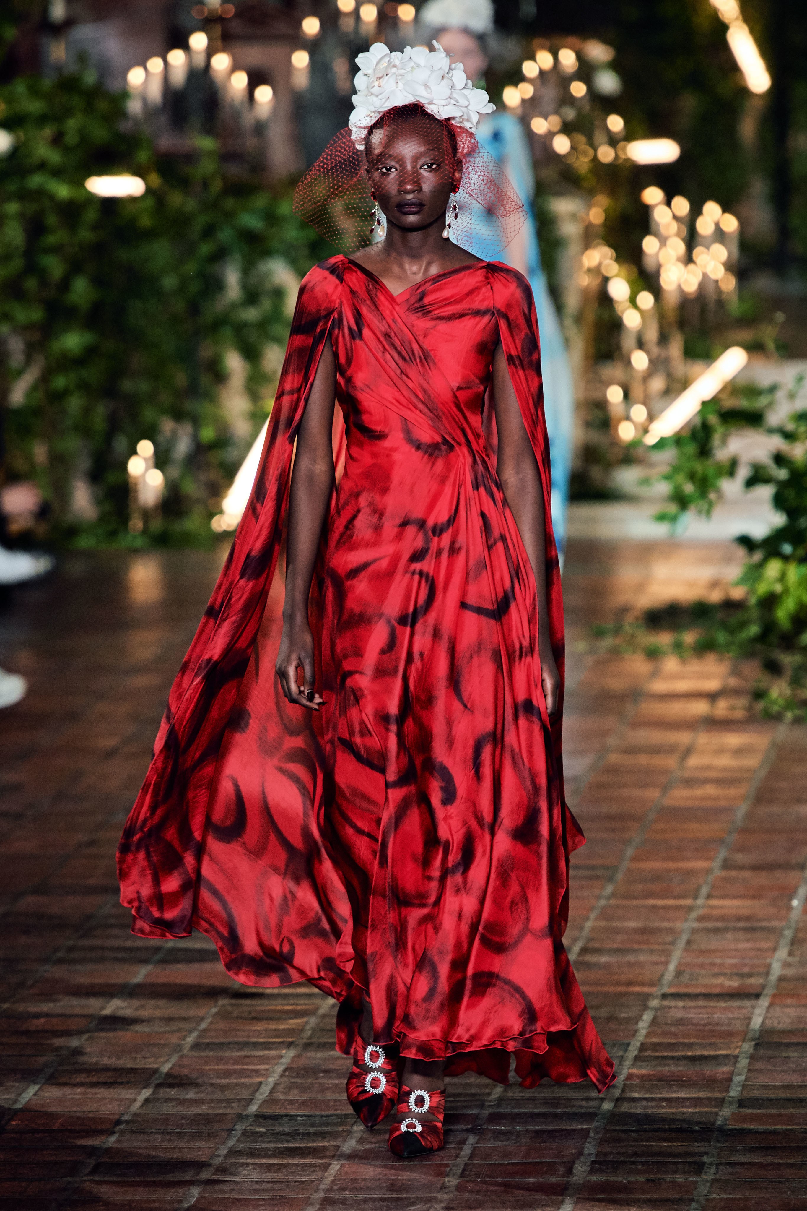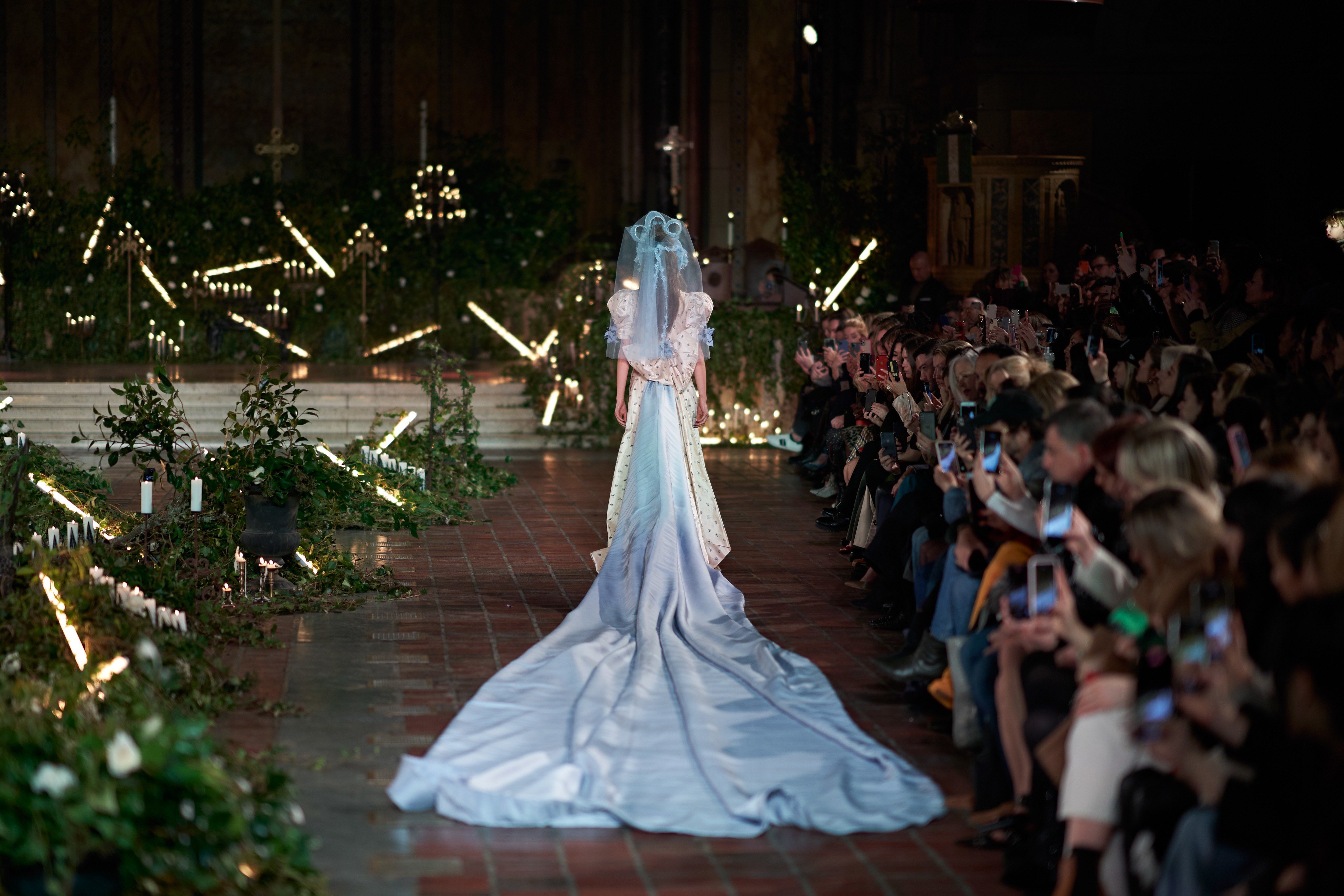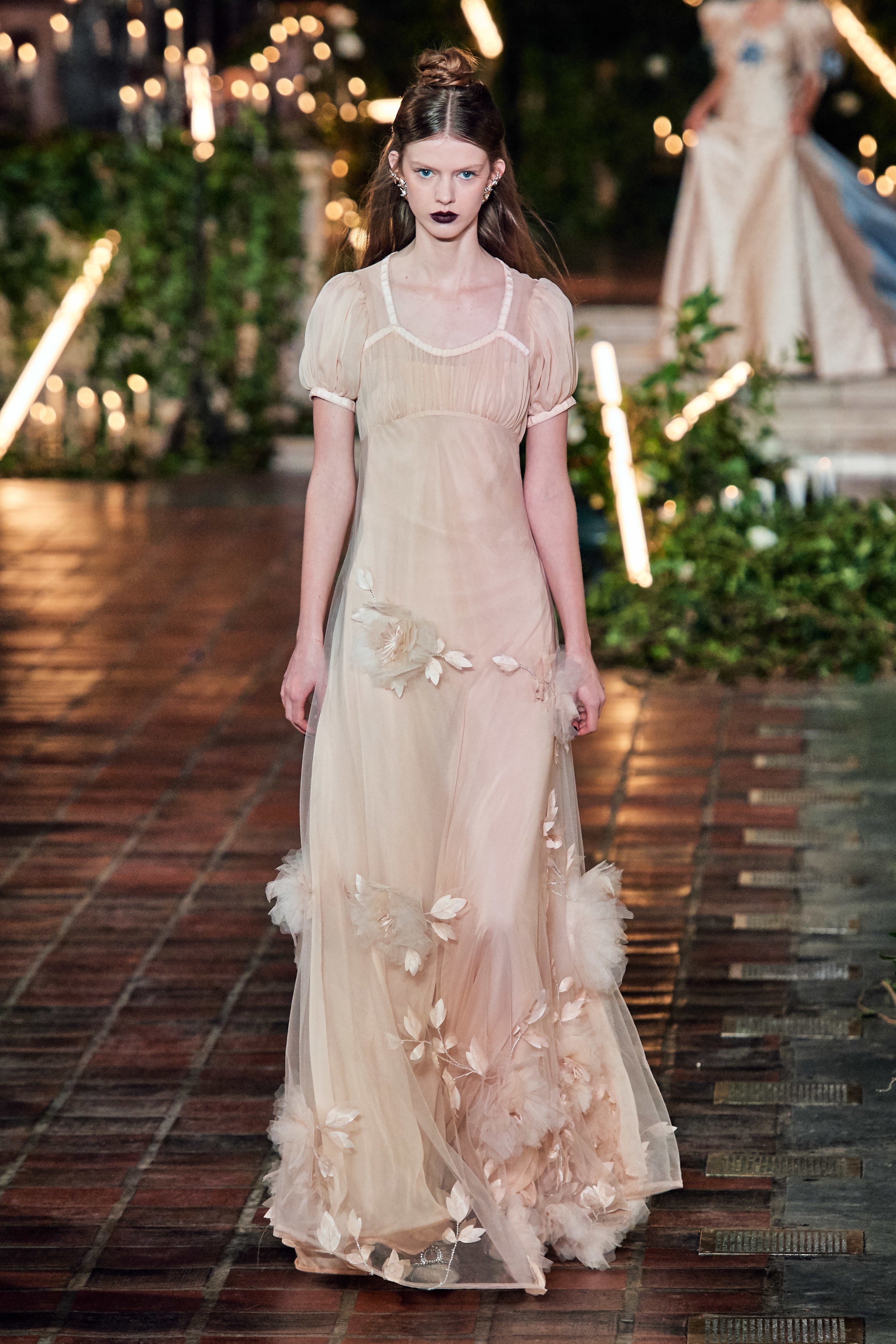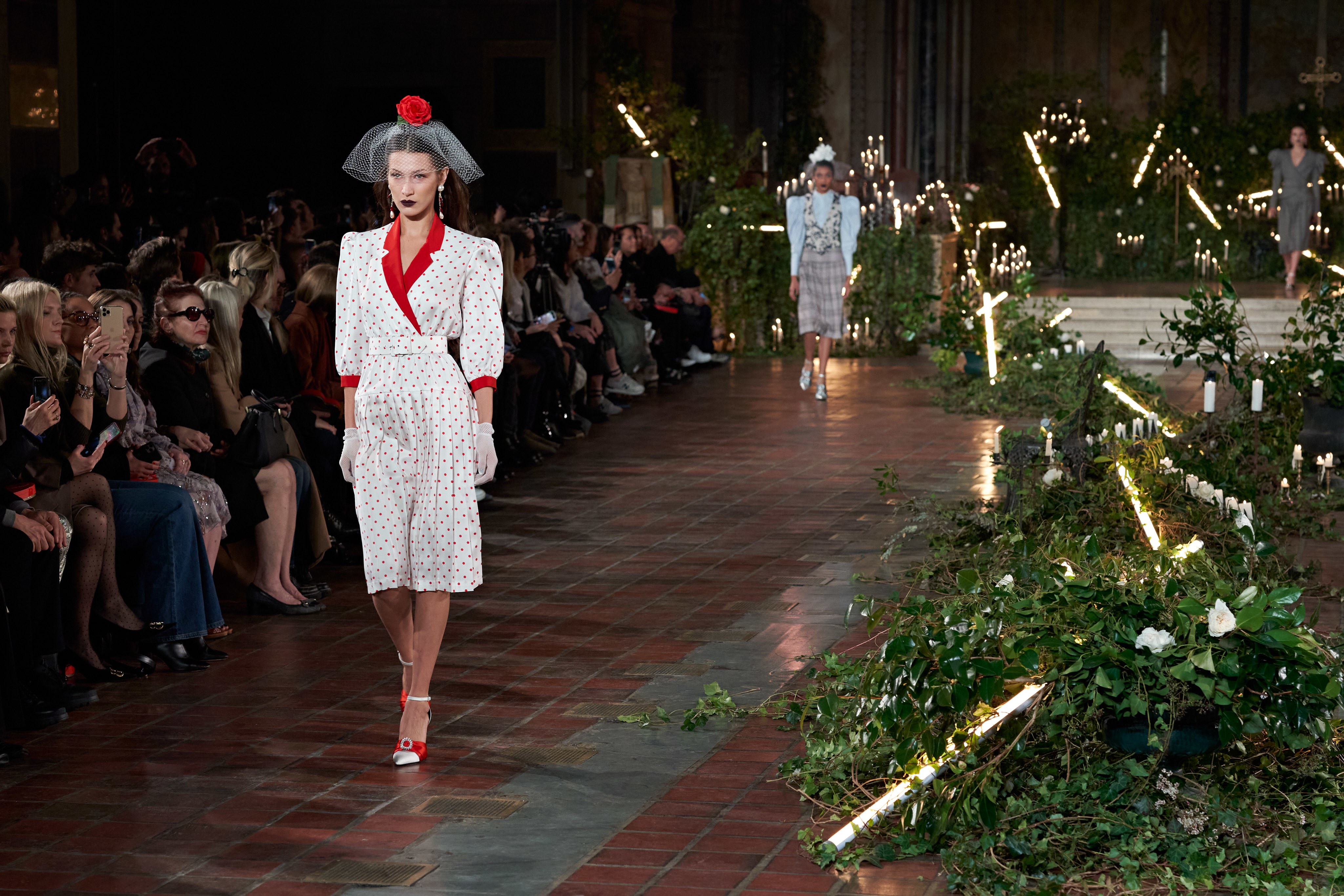在Kate 和 Laura Mulleavy 设计下的2020年秋冬系列,则对1992年弗朗西斯·科波拉导演电影《惊情四百年》里吸血鬼德古拉服装的出色”改编”。系列在烛光、玫瑰花填充的圣巴塞洛缪教堂的罗马式背景下展示,Winona Ryder 的年轻 Mina Harker 影响力可以从羊腿袖礼服中感受到。至于Vlad王子?黑暗的头巾斗篷和闪耀发光的蜘蛛贴花是对这个黑暗王子以及他的Transylvanian住所致敬。