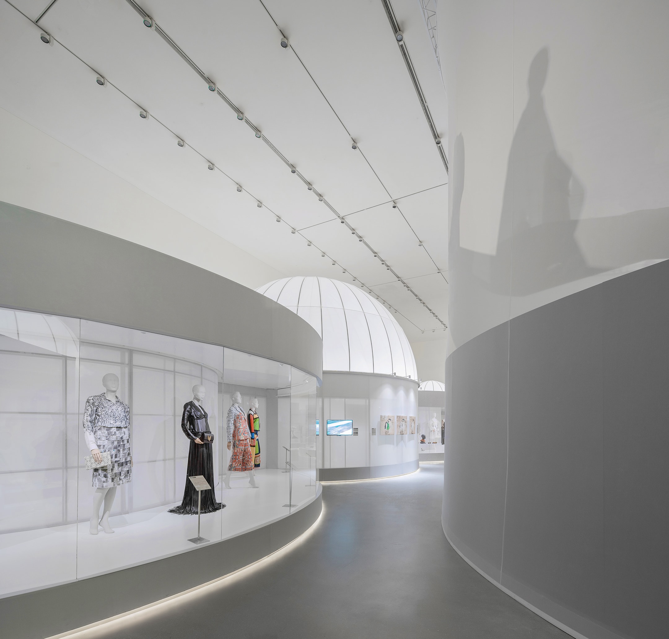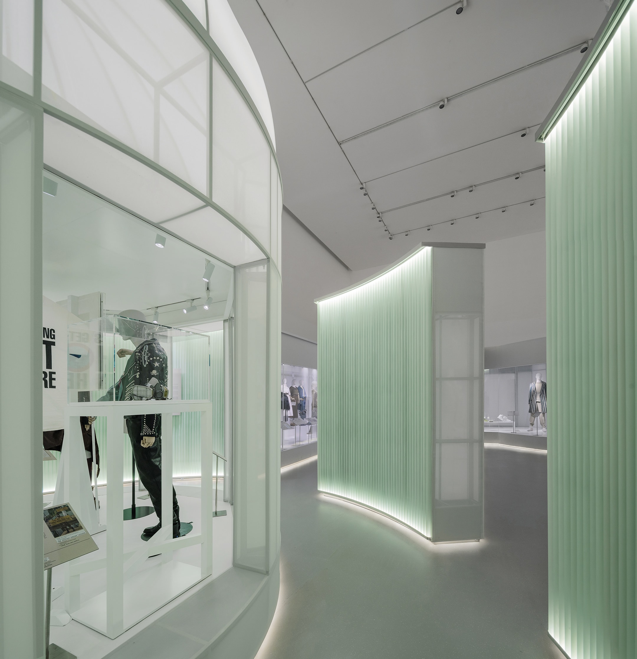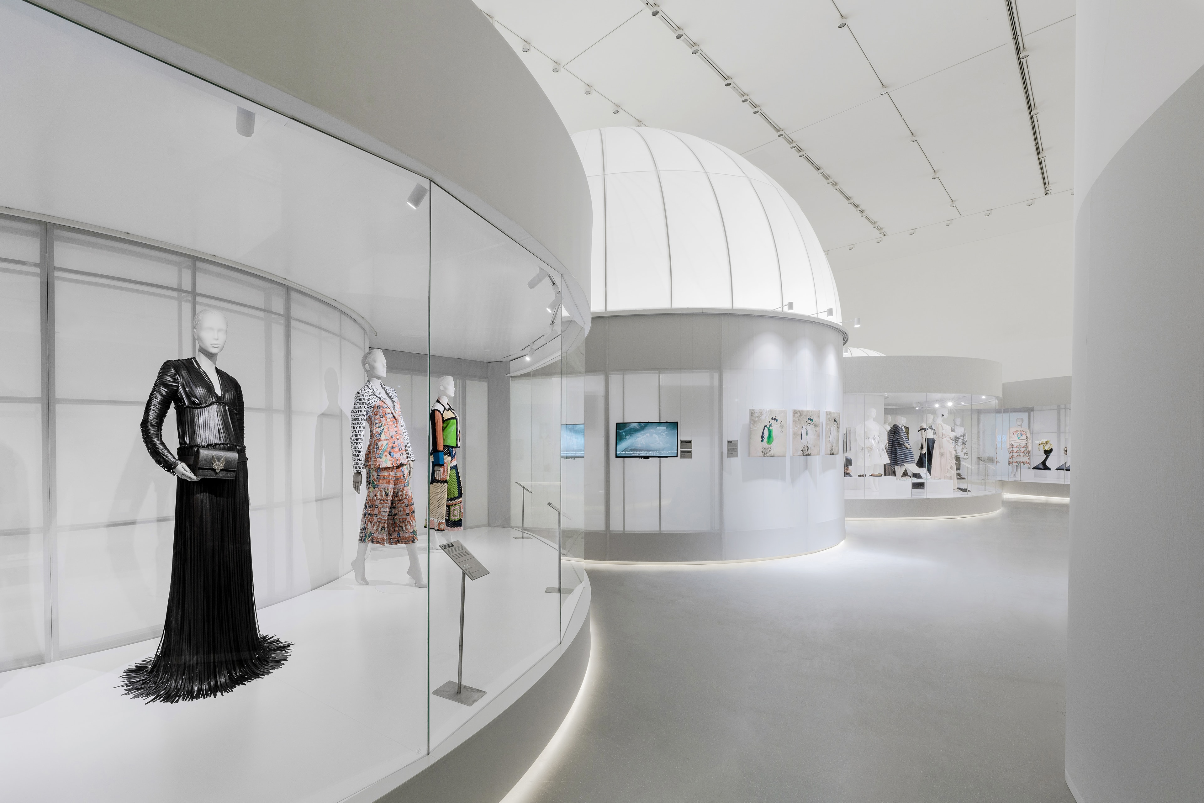 古典部分的最后一个花园是由亚克力管排列围合而成的,现代的材料暗示着展览叙事已近现当代,人们开始对于时尚与自然关系进行深刻反思。由此进入展览的当代和未来展望部分,空间豁然开朗,古典空间圆形展柜的背面形成了连续、自由流动的大型连通展柜,也呼应了当代景观和空间设计更自由灵动的布局。