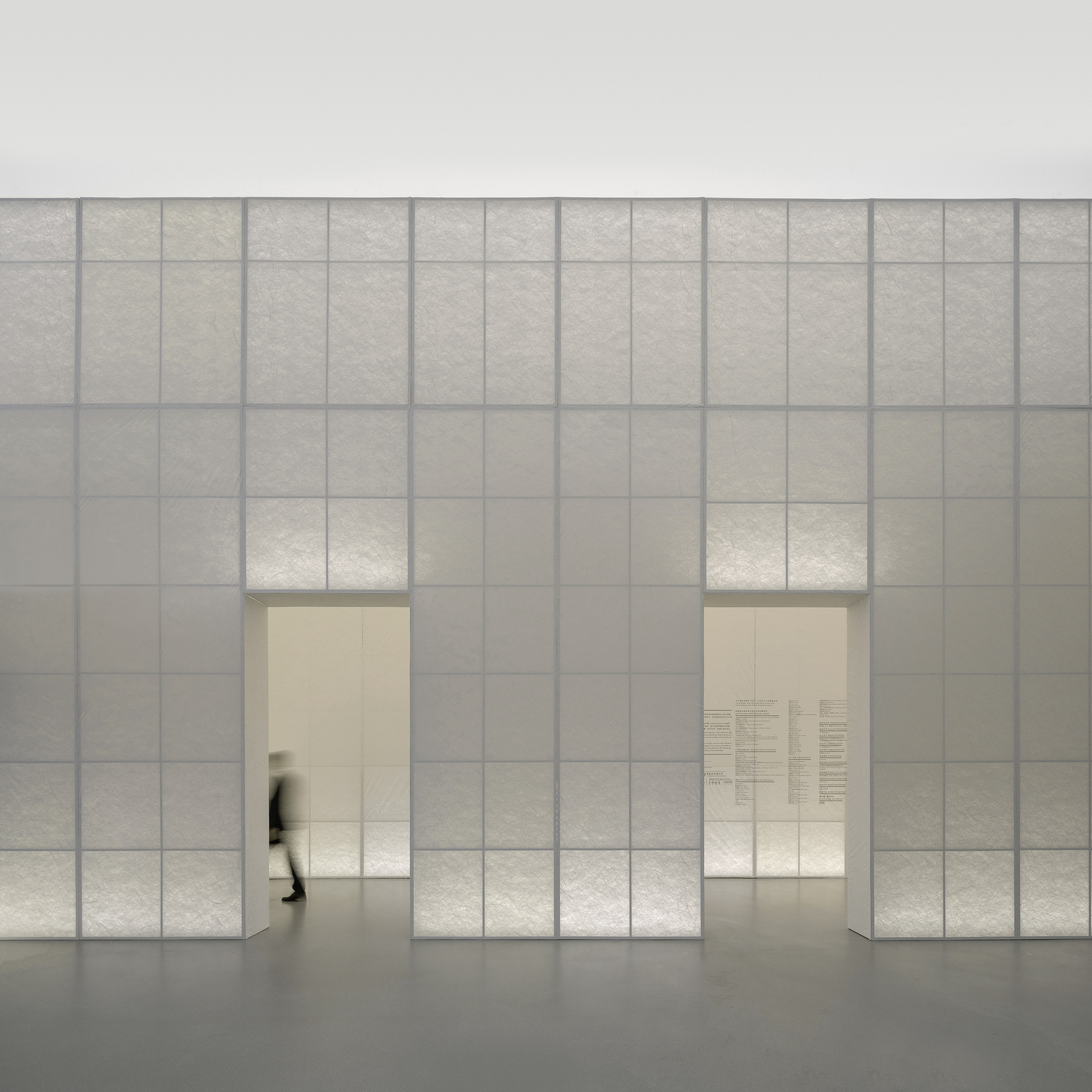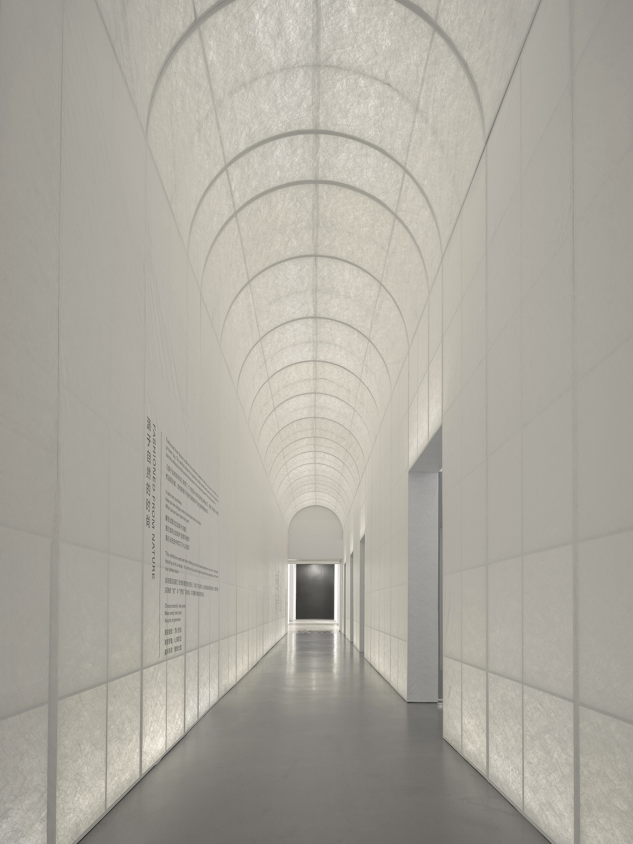展览入口的拱廊以带有纤维的杜邦纸作为饰面材料,背光隐约透出植物“藤蔓般”的肌理,形成一座抽象的“绿廊”。