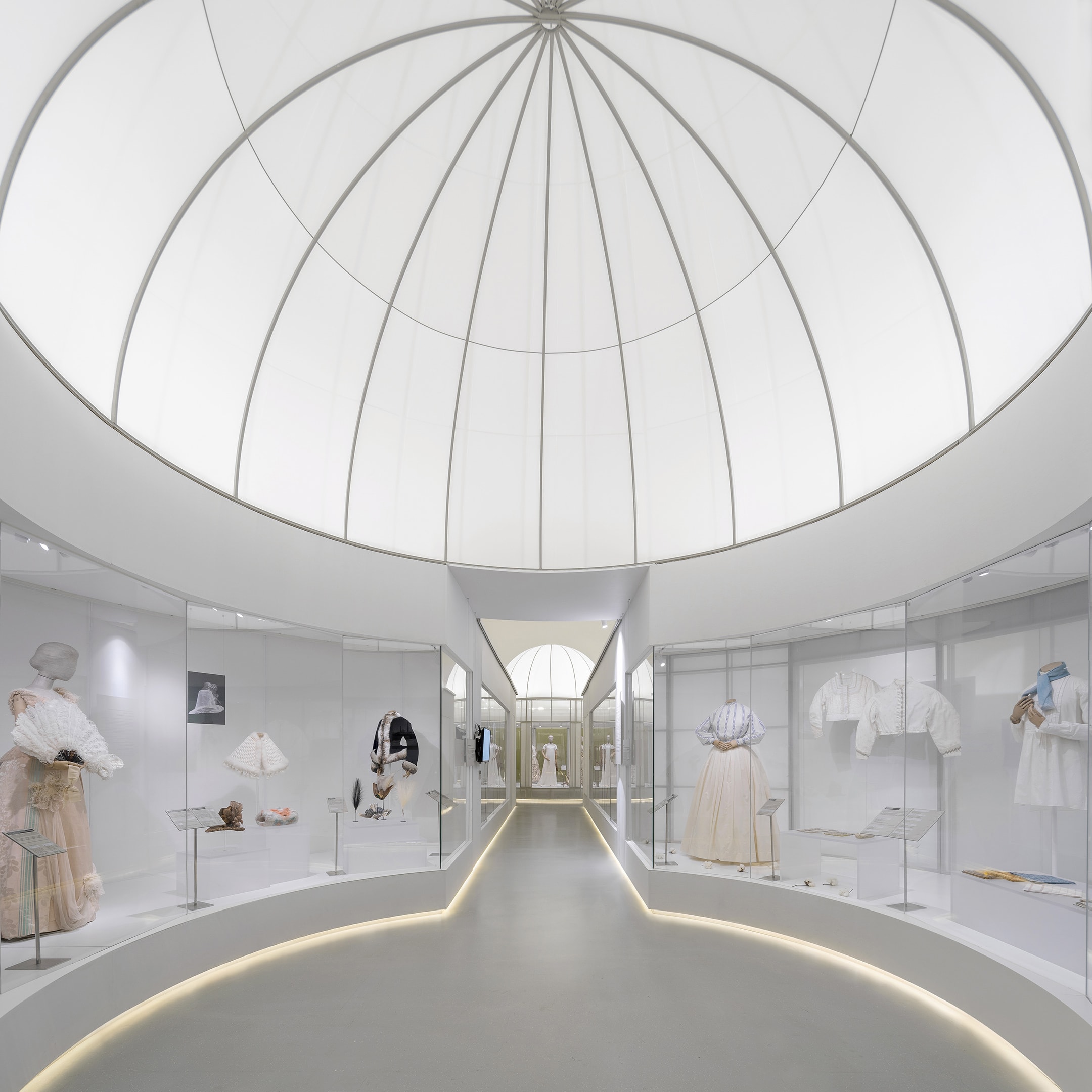 通过绿廊,由此进入展览的第一部分,即英国的古典和近代时期展区,我们以半透明的织物打造了一座提炼、抽象的“西方”古典园林原型:它是高度几何化、中轴对称且极具透视感的,以轴线串联大小不一的圆形空间和展柜;正如西方古典园林中对于建筑和轴线关系的强调,在空间视线的终点、也是轴线的交点设有三个圆形的“花园空间”,三座抽象而具有体量感的360度圆形独立展柜分别矗立其中,用于展出高光展品。