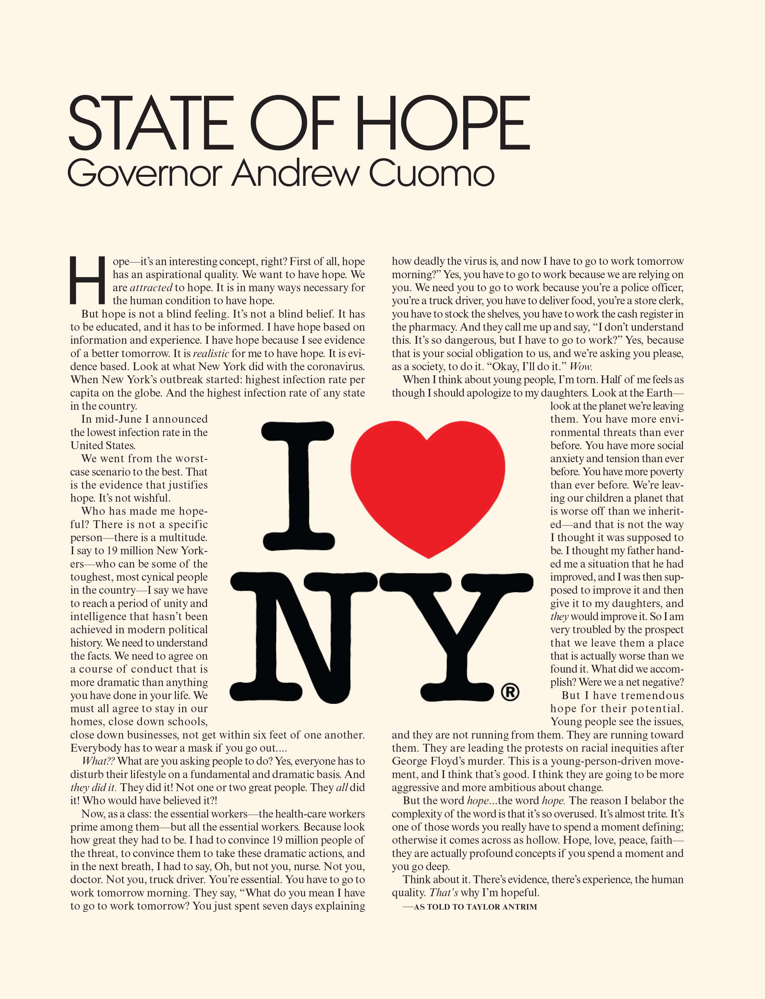 “在全球疫情期间,纽约州州长 Andrew Cuomo 一直展现出我们总统所不具备的优点——直率、诚实、令人安心、注重科学和实事求是。还有谁能让我们更加心怀希望呢?州长在这个问题上所说的一切让我这个纽约人感到十分自豪。有时,文字(以及具有象征性的 Milton Glaser 图标)就是最好的代表图像。 ”