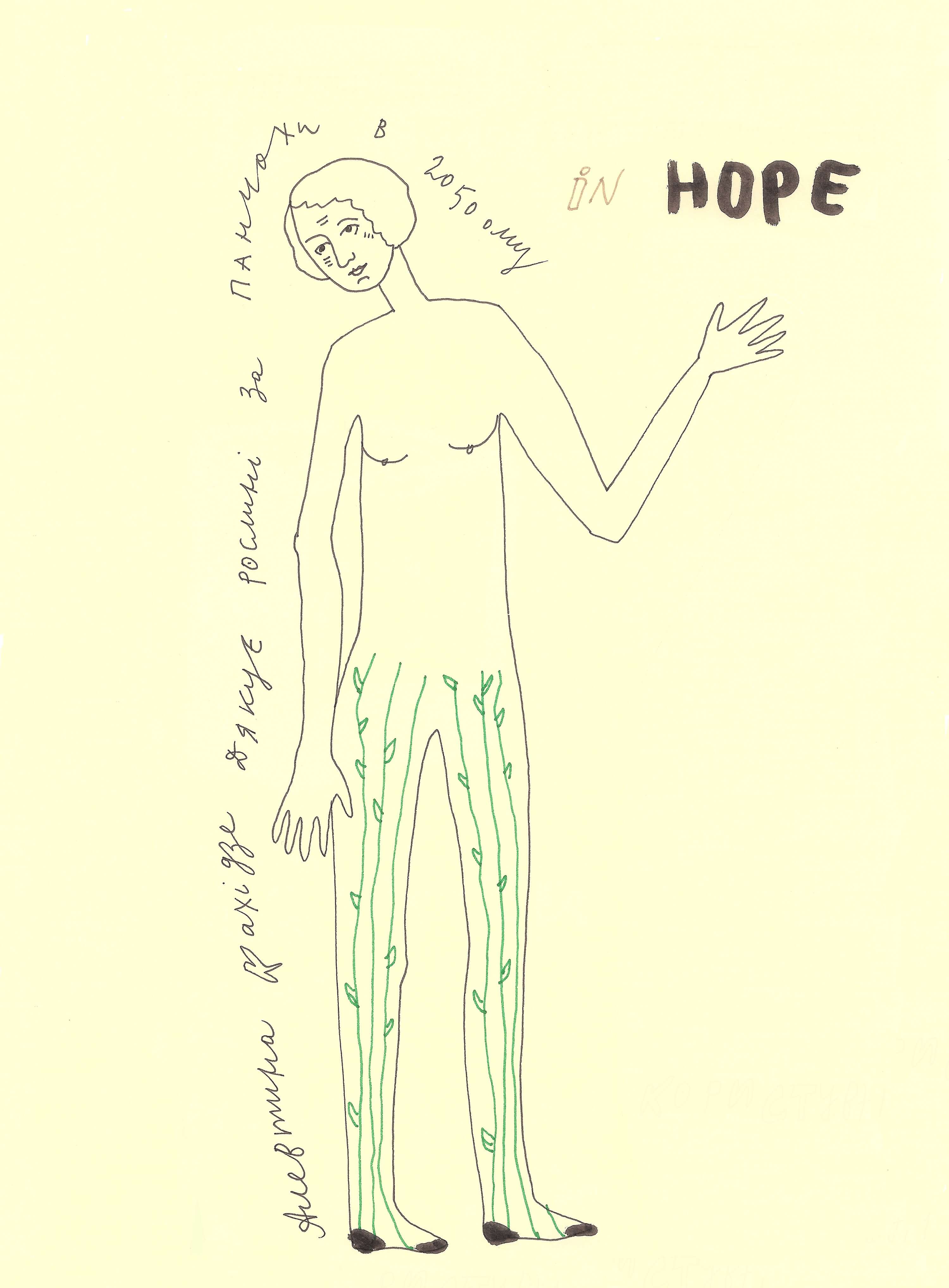 “在艺术家(也是位园艺家)Alevtina Kakhidze的创作中,她采用未经修饰的绘画和文字。我们非常喜欢这种极简风格。Alevtina出生于乌克兰东部,她的画作讲述性别、社会冲突和环境问题,我们委托她创作一幅以环境为主题的作品——因此她设计了一幅未来自画像,里面采用植物材料取代人造织品。这幅名为《2050年,Alevtina Kakhidze感谢植物们创造出连裤袜》的画作令人感动,也让人充满希望。不过它采用伪原始流派创作,也带有稍许讽刺意味,但正是因为这一点,她的艺术创作才让人佩服不已。” 图© Alevtina Kakhidze