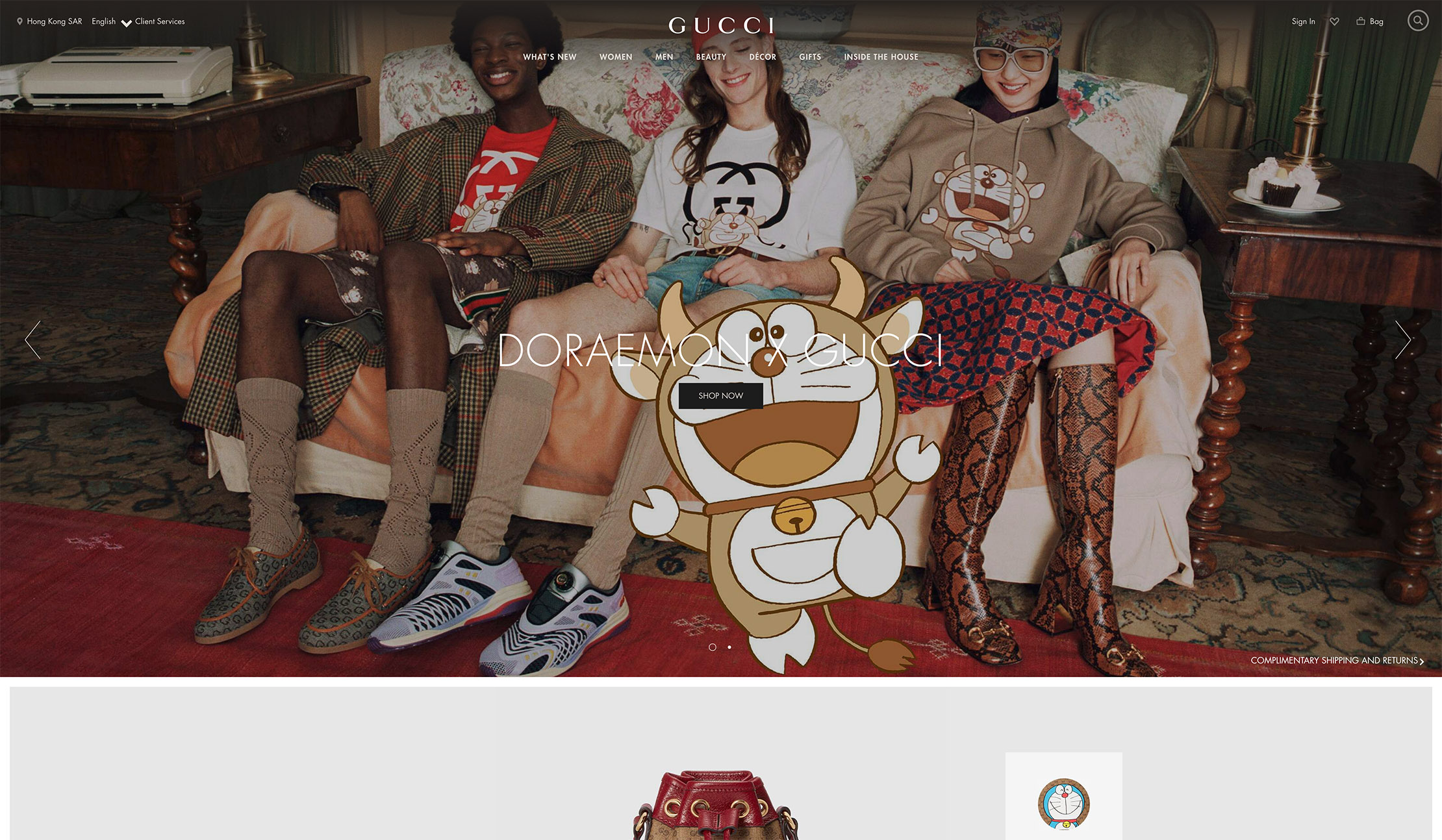 GUCCI 在网站上使用了大图片和几何型的字体,打造出了优雅、奢华而极具现代感的氛围。正文中的Futura字体与Logo中的Granjon字体相辅相成,两种字体均以宽比例、间距大、易读性好和简洁为特点。品牌在产品描述中使用了Times字体增强奢华感,但这是一款免费、非原创的字体,细线笔画的字体在小尺寸的空间中并不适用。