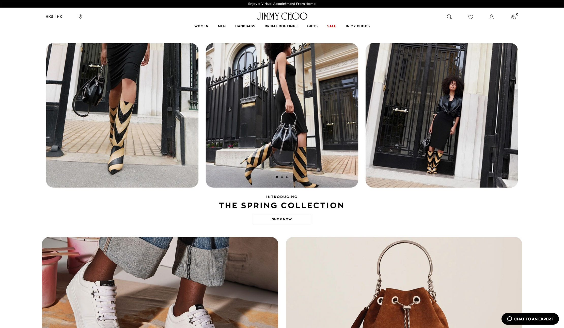 在JIMMY CHOO的网站中,JIMMY CHOO两个单词使用的定制字体University Roman,突出了宽窄的对比。主要字体Proxima Nova与University Roman产生了良好的联动,形成了一种动态的视觉关系。简单的图片与简洁易读且富有现代气息的Proxima Nova字体共同营造出了一种经典而淡雅的氛围。