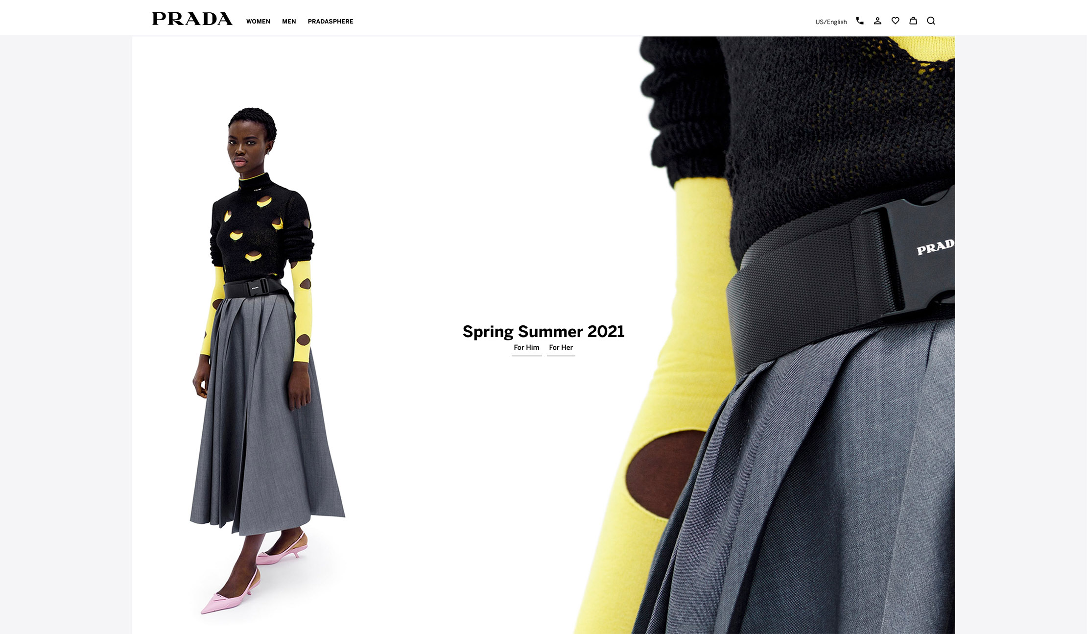 PRADA 的Logo使用了定制的衬线,醒目、独特,且富有标志性和现代气息。品牌在网站上大篇幅使用动态图像,而字体排版的篇幅却很小。主导航菜单采用了全大写字母,字体为Univers,正文部分使用了一种名叫做Source Sans Pro的免费开源字体。普拉达可能有专门考虑过品牌网站的排版,但现在的这种排版形式与使用的免费字体使品牌错失了展现品牌风格的机会。