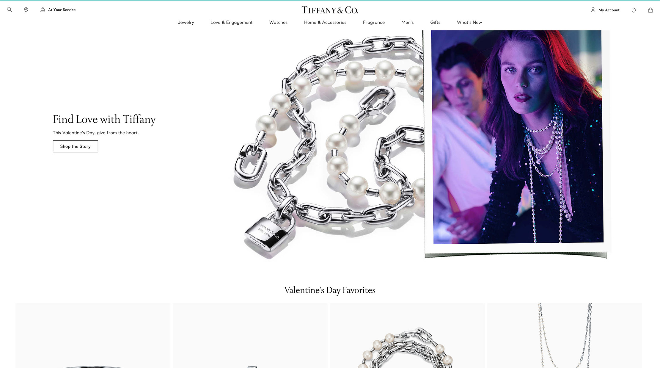 Tiffany 网站在Logo和主要字体的选择上使用了由Hoefler Type Foundry创造的Sterling字体,这是一种以高笔画粗细对比度和精致衬线为特色的字体。因为笔画太细,导航菜单上的细线笔画字体在阅览比例较小的情况下会显示不清。蒂芙尼网站的菜单和标题的所有字母均为大写,正文部分大写和小写字母的使用中规中矩。整体风格来看,尽是奢华优雅。网站的部分板块中也使用了Humanist Sans字体中的Avenir Next(和Helvetica),现代感十足。