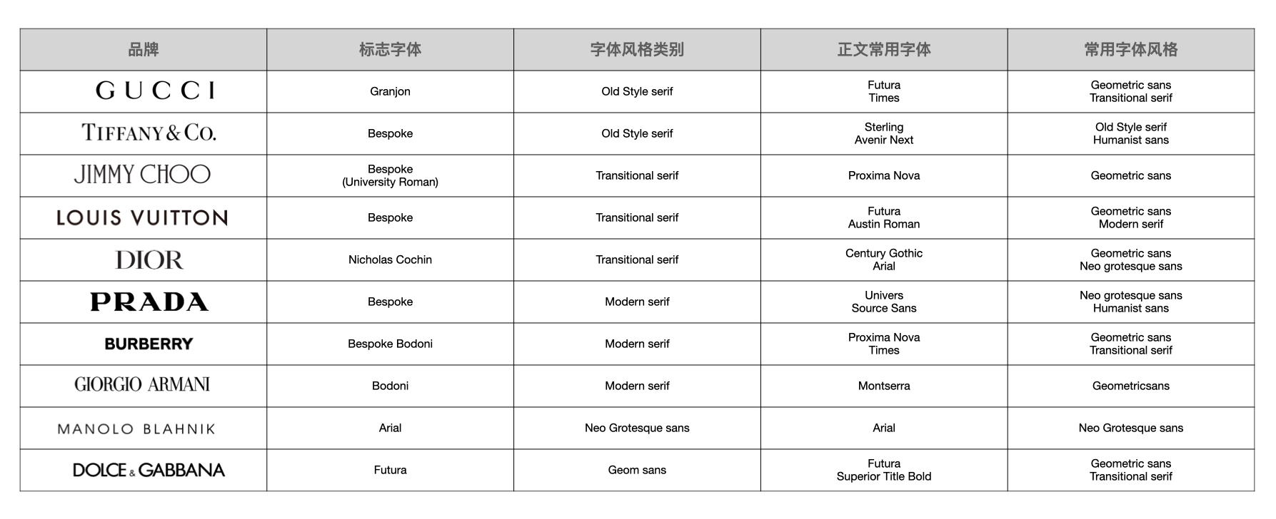 大多数时尚奢侈品牌都使用了大篇幅、醒目的图片,配以短小精炼的文字设计。时尚品牌与美妆品牌有许多相似之处,比如说白色的背景空间、醒目的颜色、几何型和具有高笔画粗细对比度的字体,都是品牌青睐的选择。几何型无衬线字体在主要字体的选择中非常受欢迎,在我们研究的十大品牌中有七个品牌都使用了这样的字体。与美妆品牌常使用的Gotham字体相比,Futura和Proxima Nova在时尚界的受欢迎程度更胜一筹。在我们研究的十大品牌中,没有任何一个品牌在文本字体中使用定制字体,40%的品牌使用了与浏览器兼容的系统字体,如Times和Arial字体等。